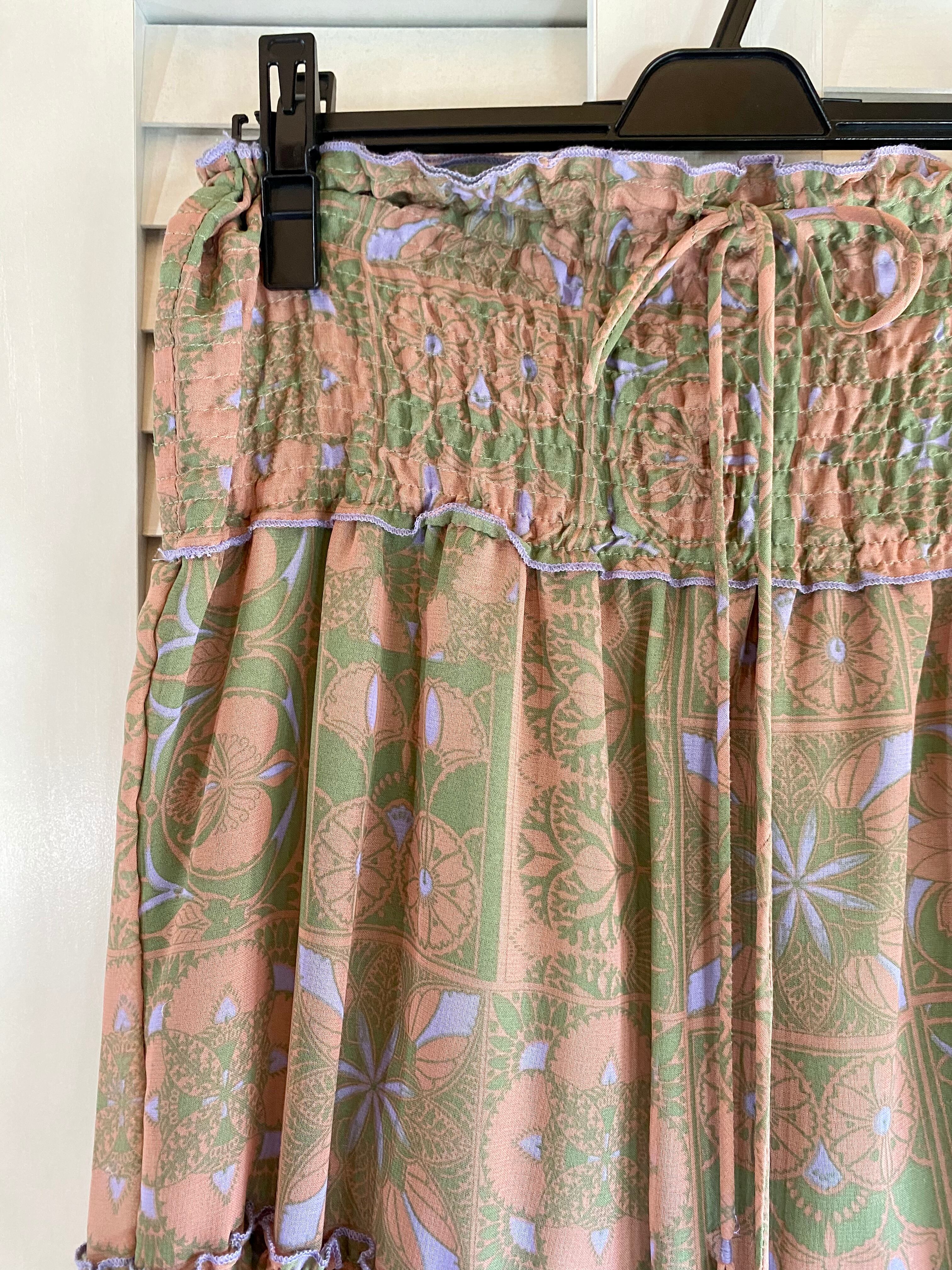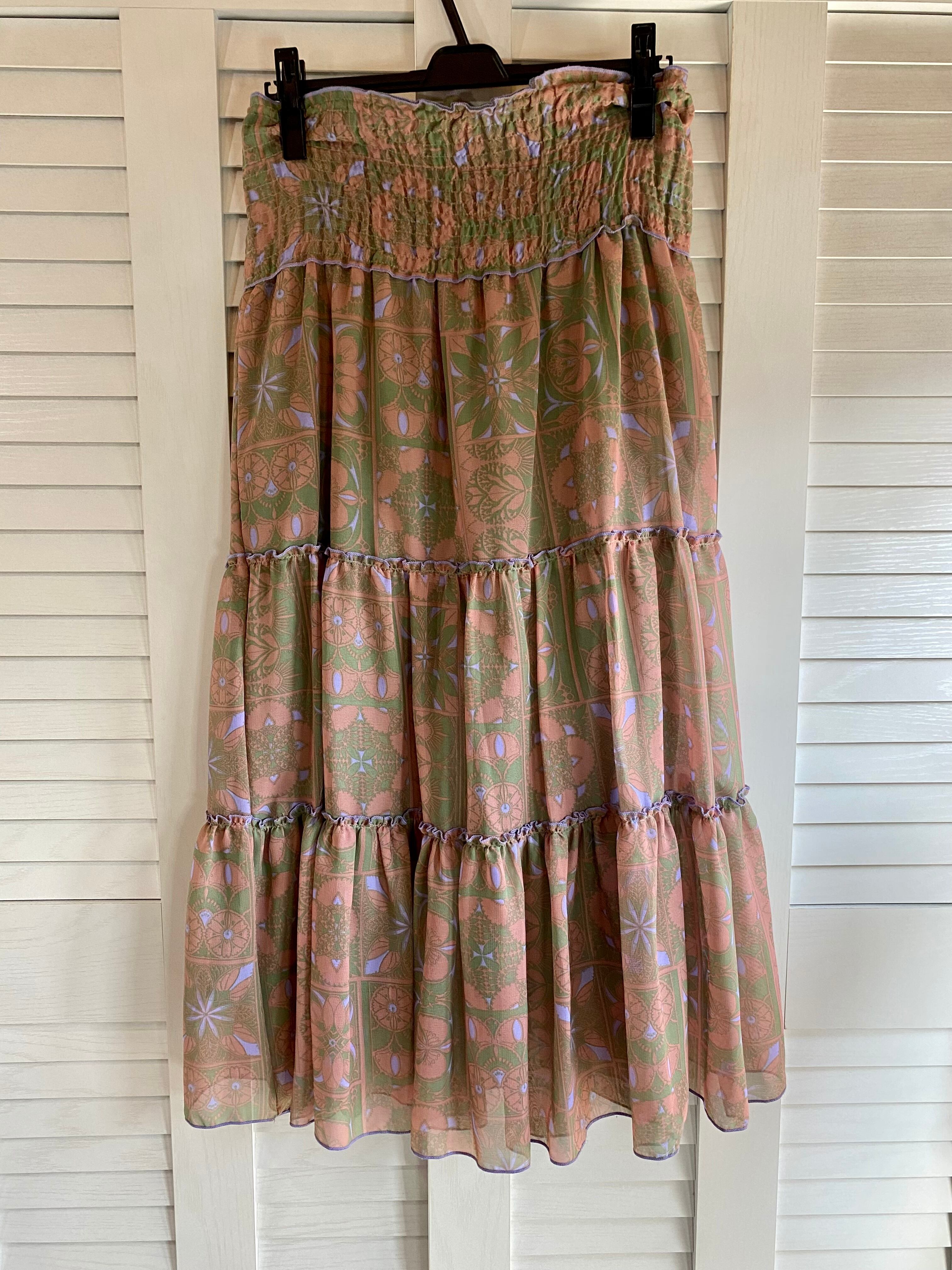 #21 Amina モザイクタイルプリント シフォンティアードスカート グレイッシュオレンジ×カーキ