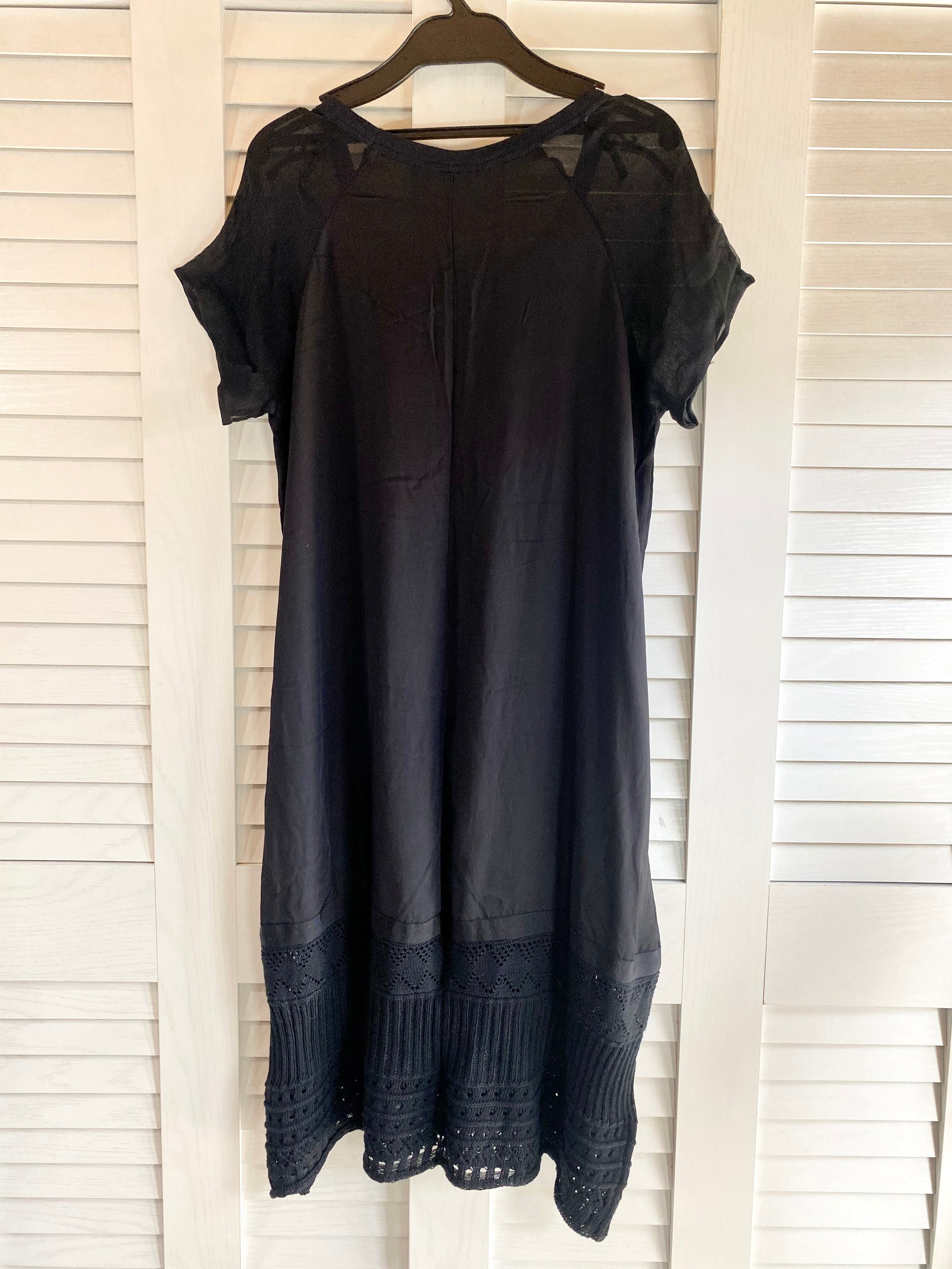 #21 We Are 異素材コンビ バックサテン×楊柳シフォンスリーブ 透かし編みニット ブラックワンピ