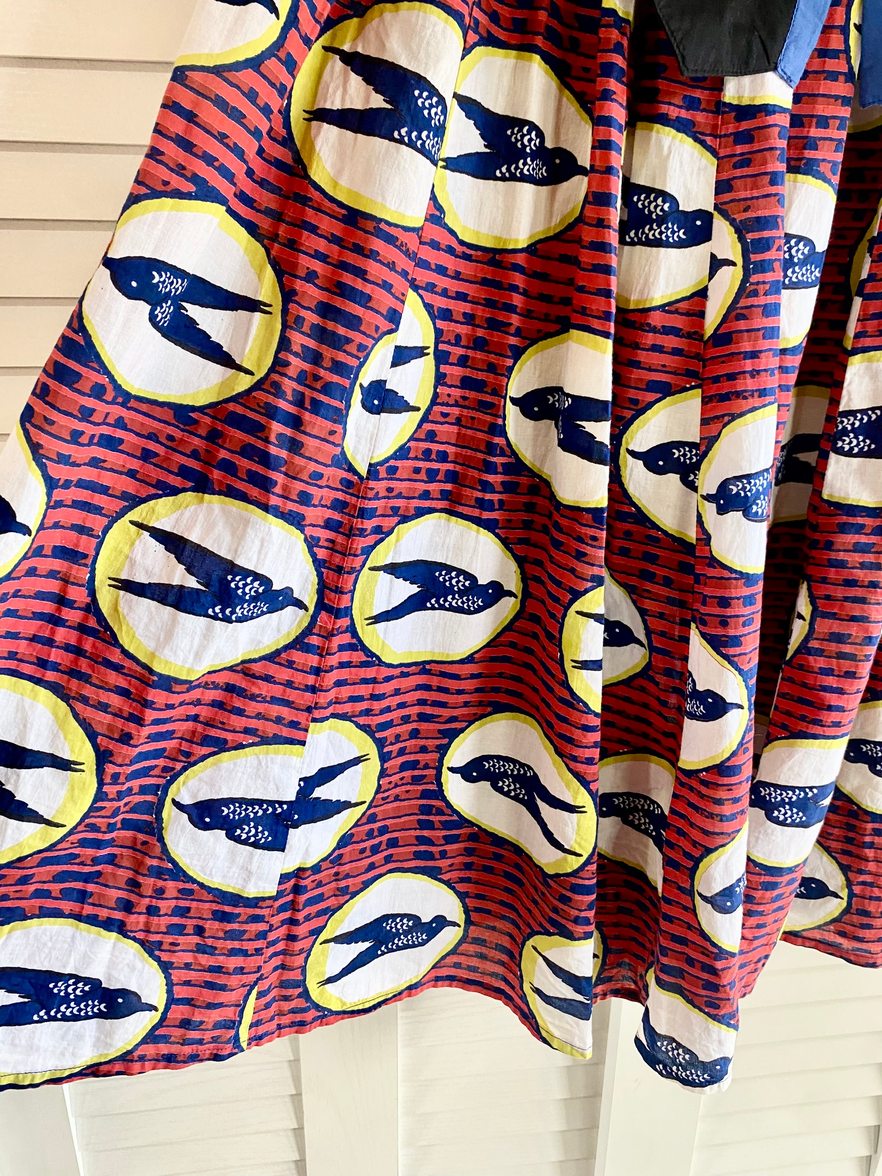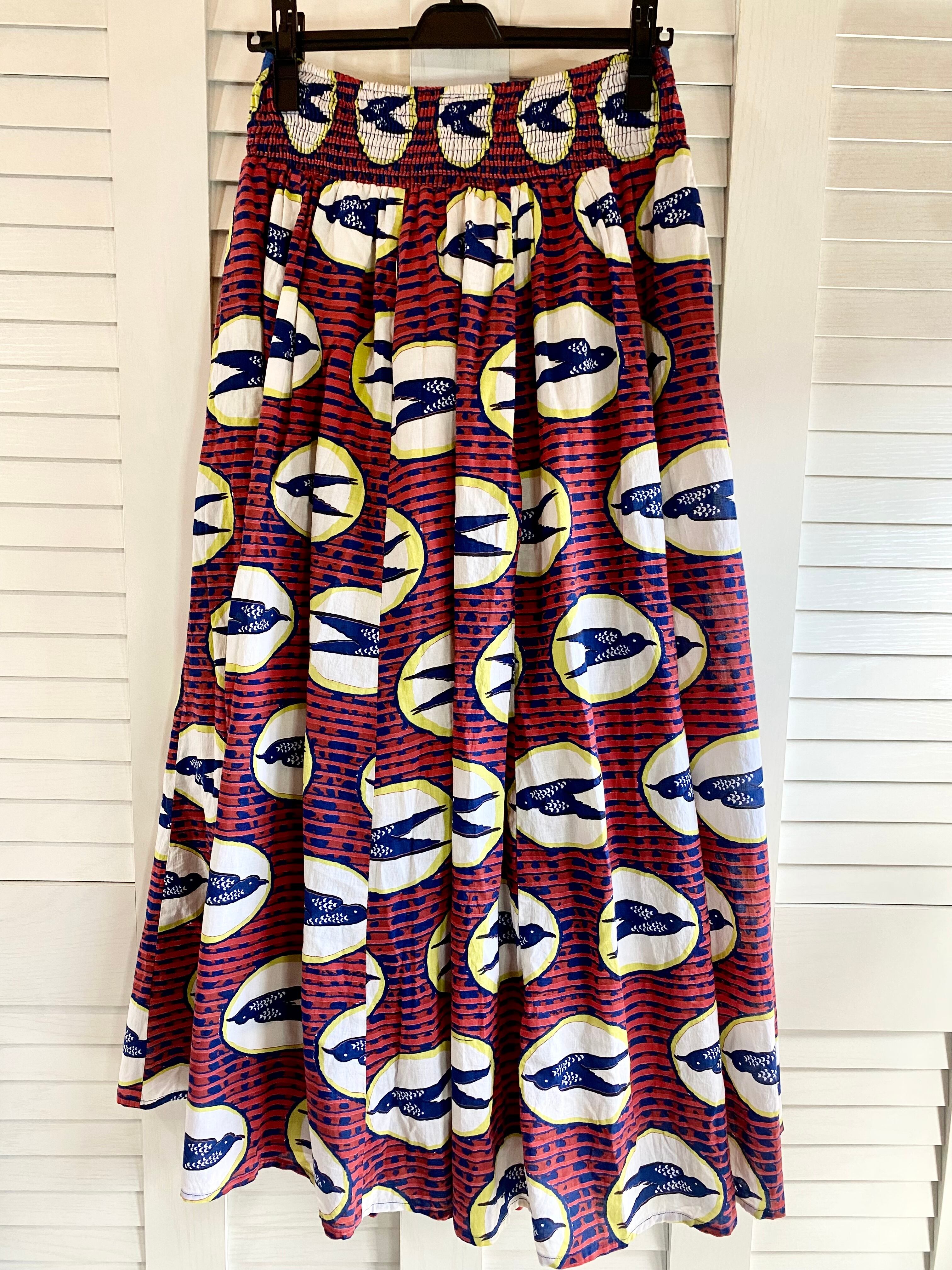 #21 Amina 小鳥プリント AMOUR刺繍リボンベルト コットンロングフレアースカート エンジ