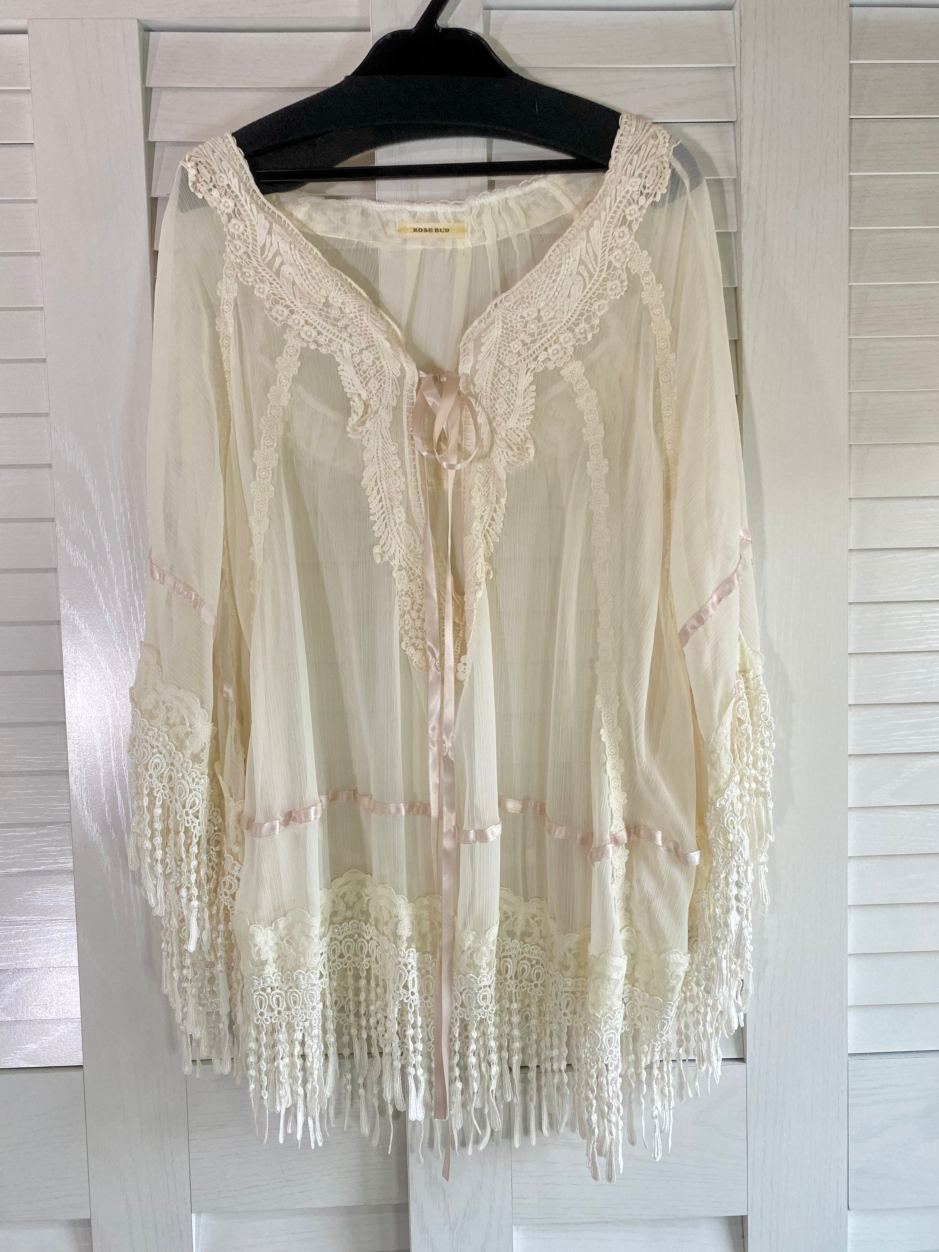 #29 ROSE BUD レースブレードフリンジ 楊柳シアーポンチョブラウス アイボリー