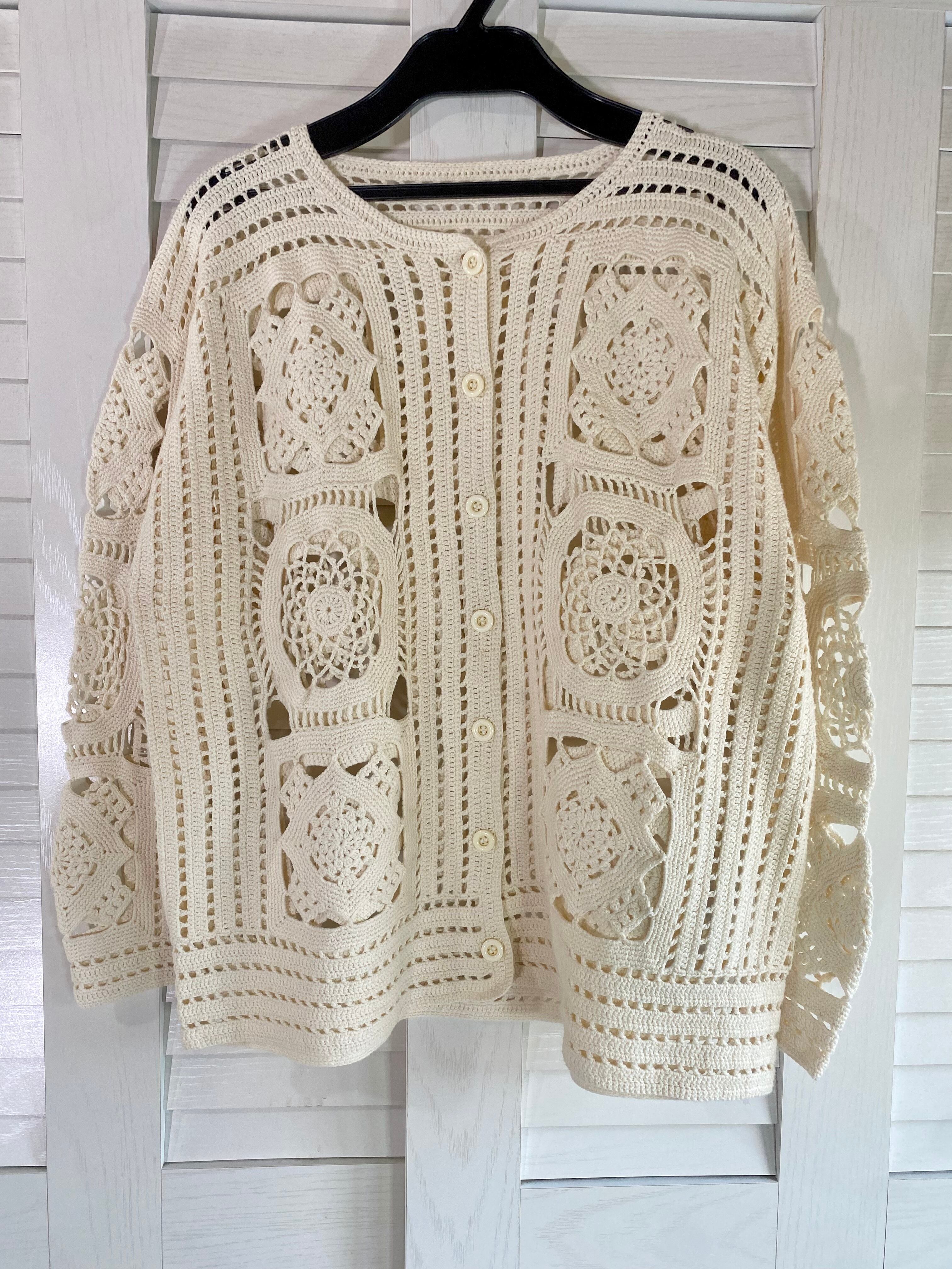 #29 【国産古着】70Sデッドストック スクエアモチーフ カギ編みレースカーデ アイボリー