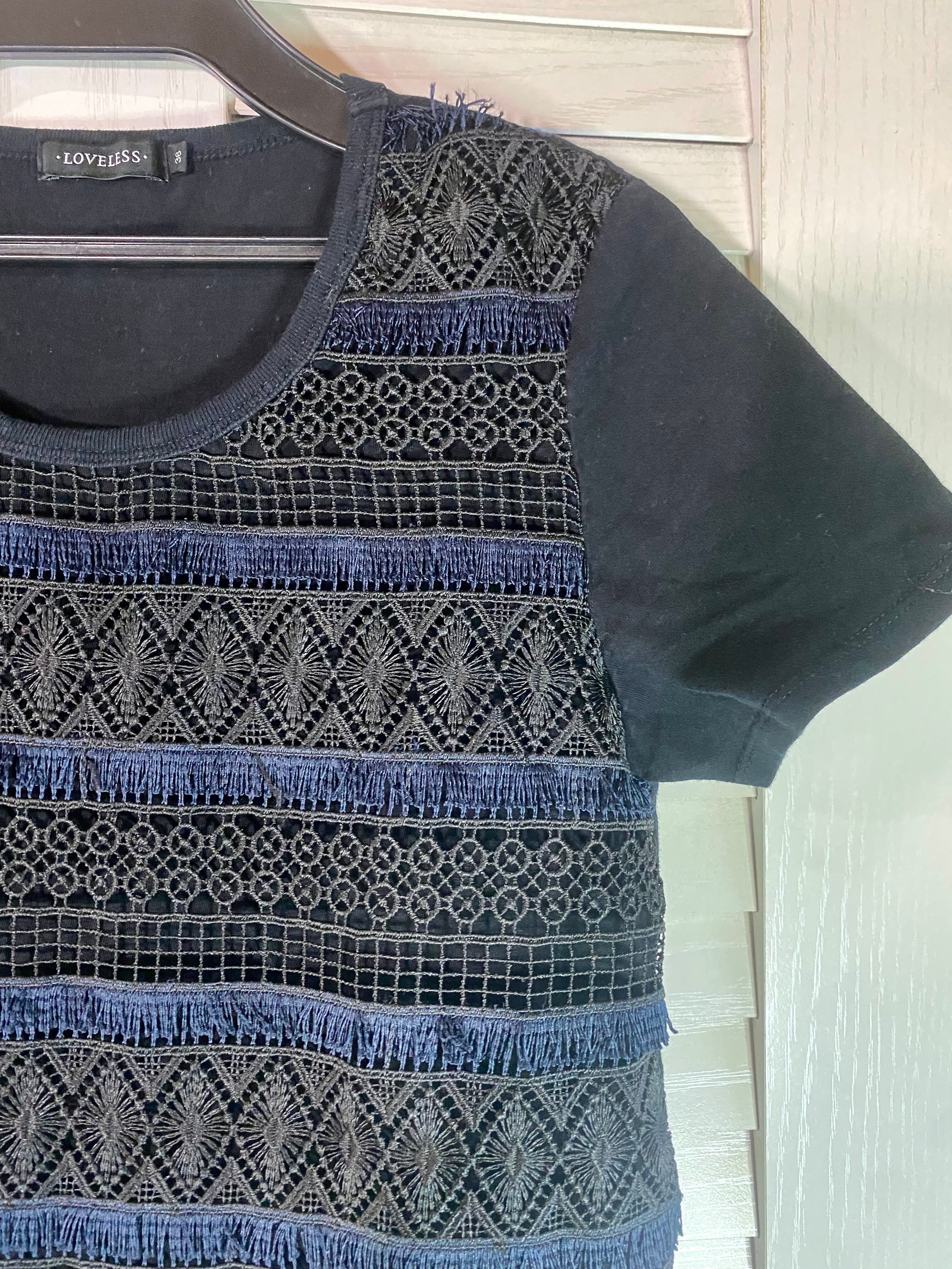 #29 LOVELESS フリンジ&レース デザインTシャツ ブラック