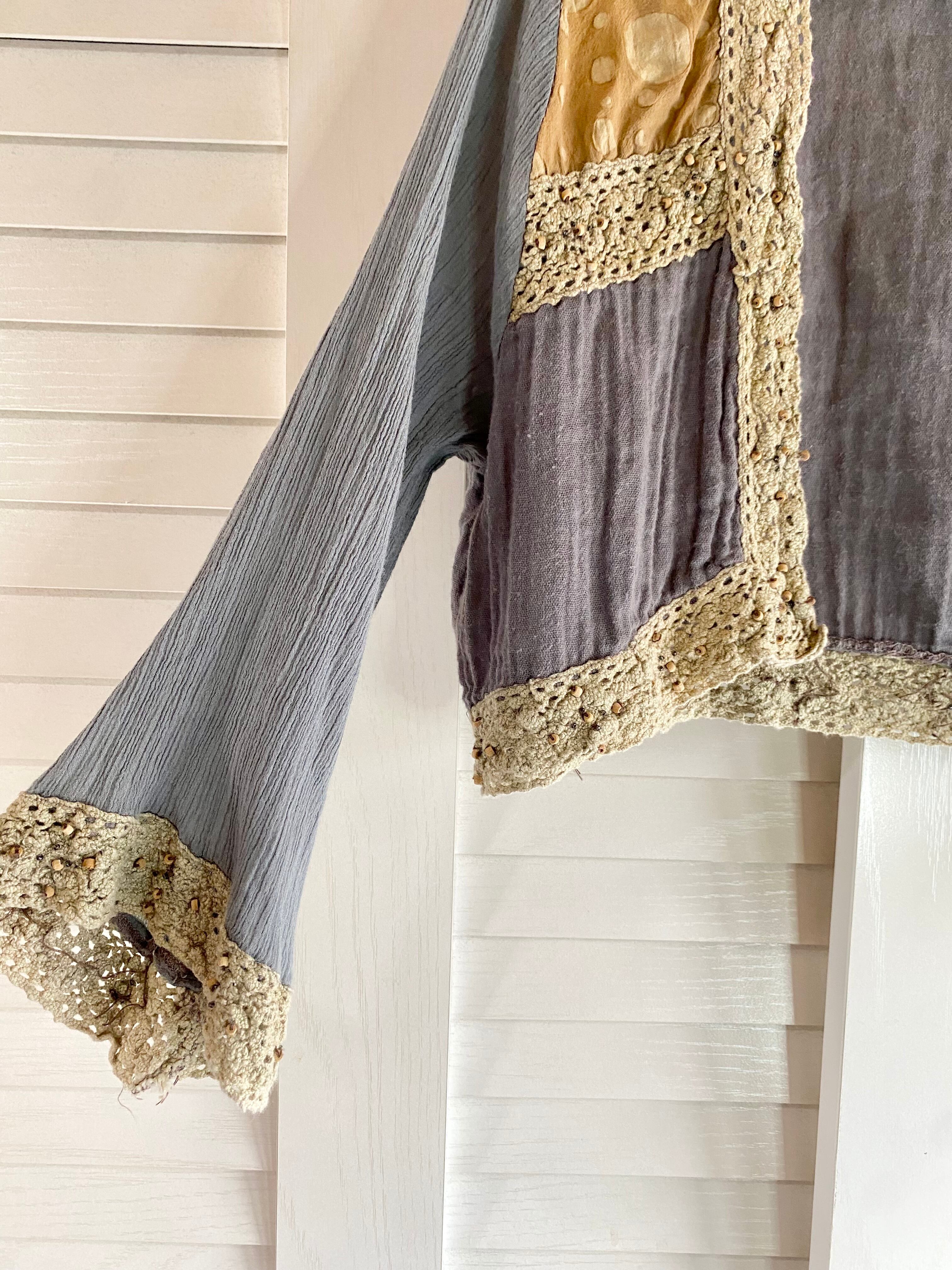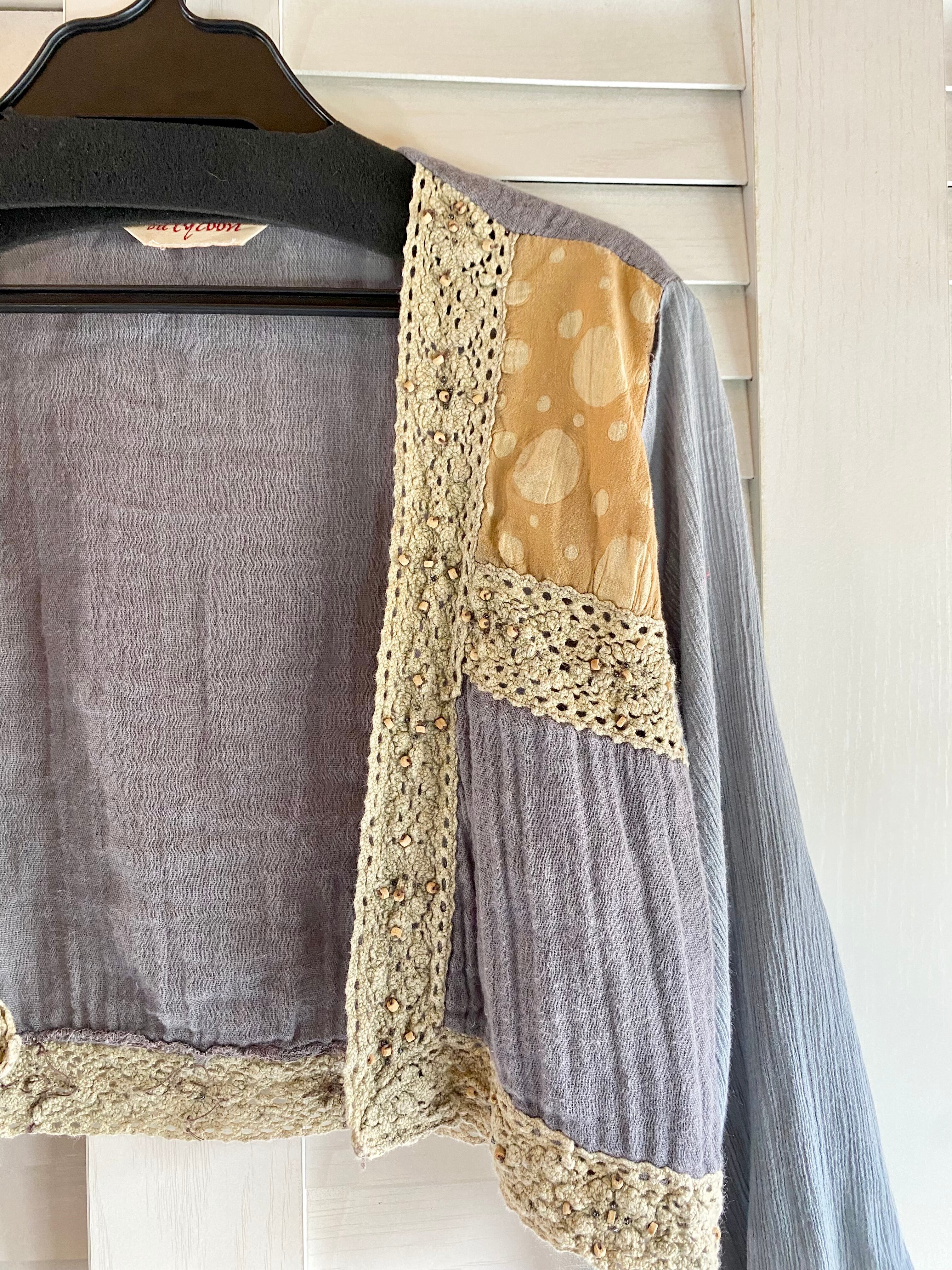 #38【古着屋購入】コットンレース&ウッドビーズ コットンガーゼ パッチワーク 楊柳ボレロ グレー