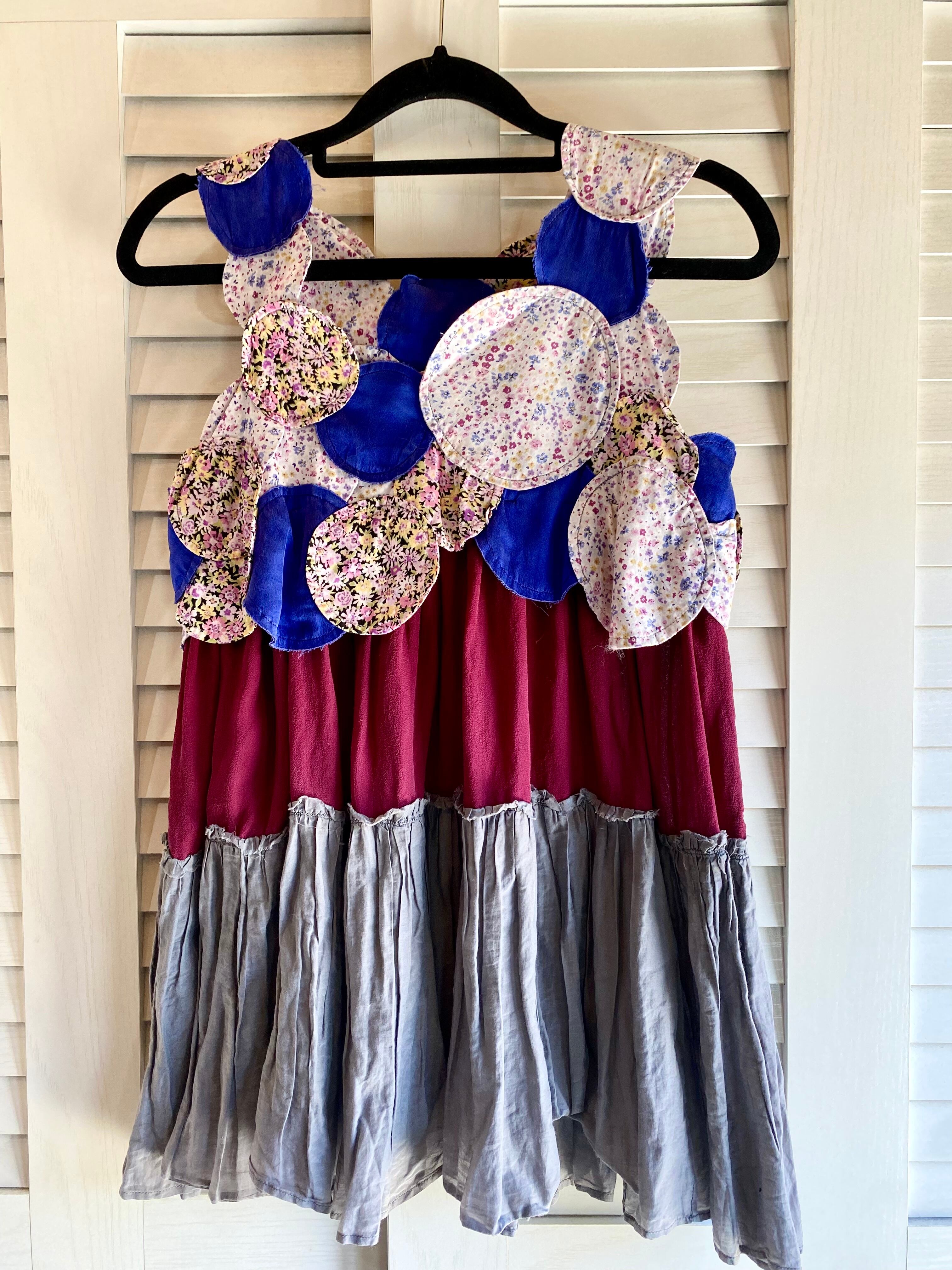 #41 SUNAOKUWAHARA ラウンドパッチワーク ティアードノースリーブブラウス ブルー×エンジ×グレー