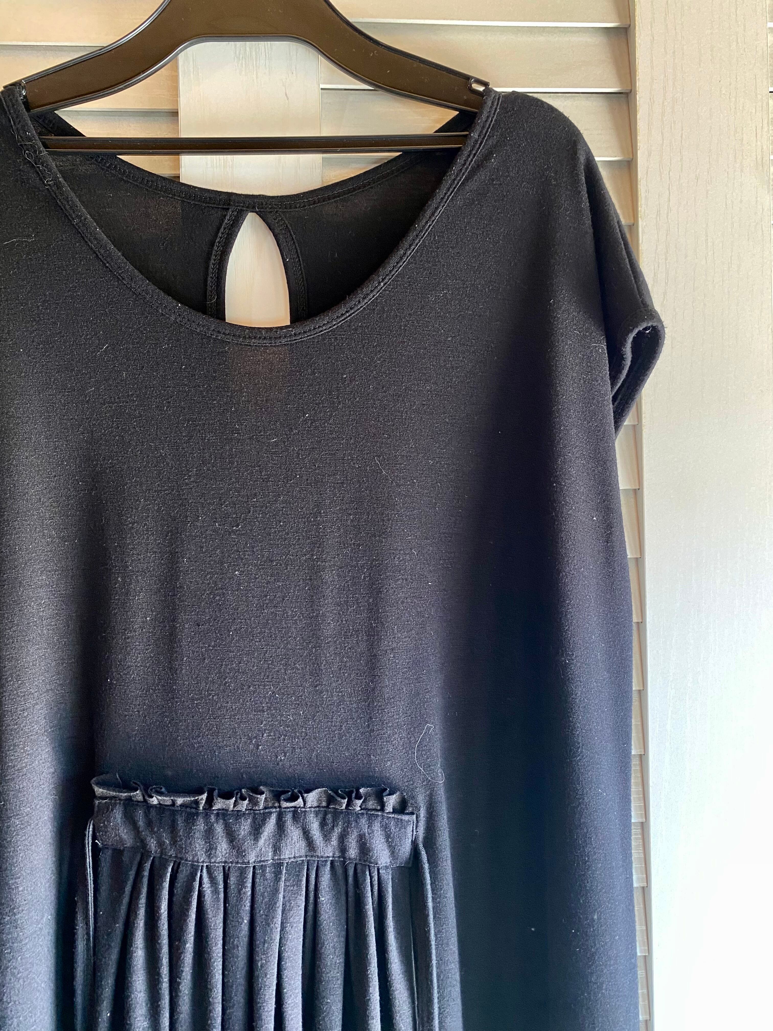 #41【デザインサンプル】センターウエストギャザーデザイン フレンチスリーブカットソーワンピ ブラック