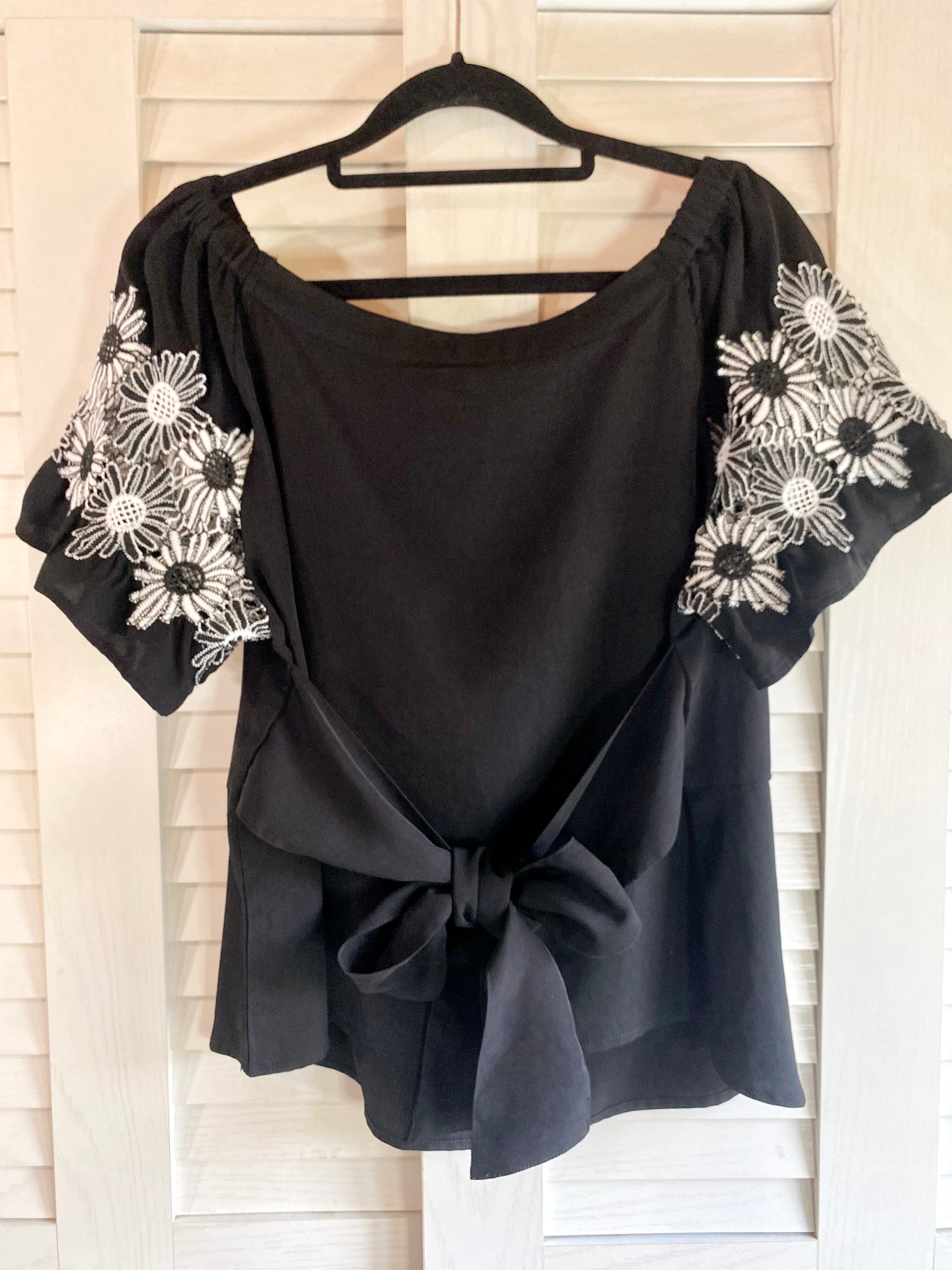 #42 ARCHVES カッティングフラワーレース ベルスリーブ リボンベルトブラウス ブラック