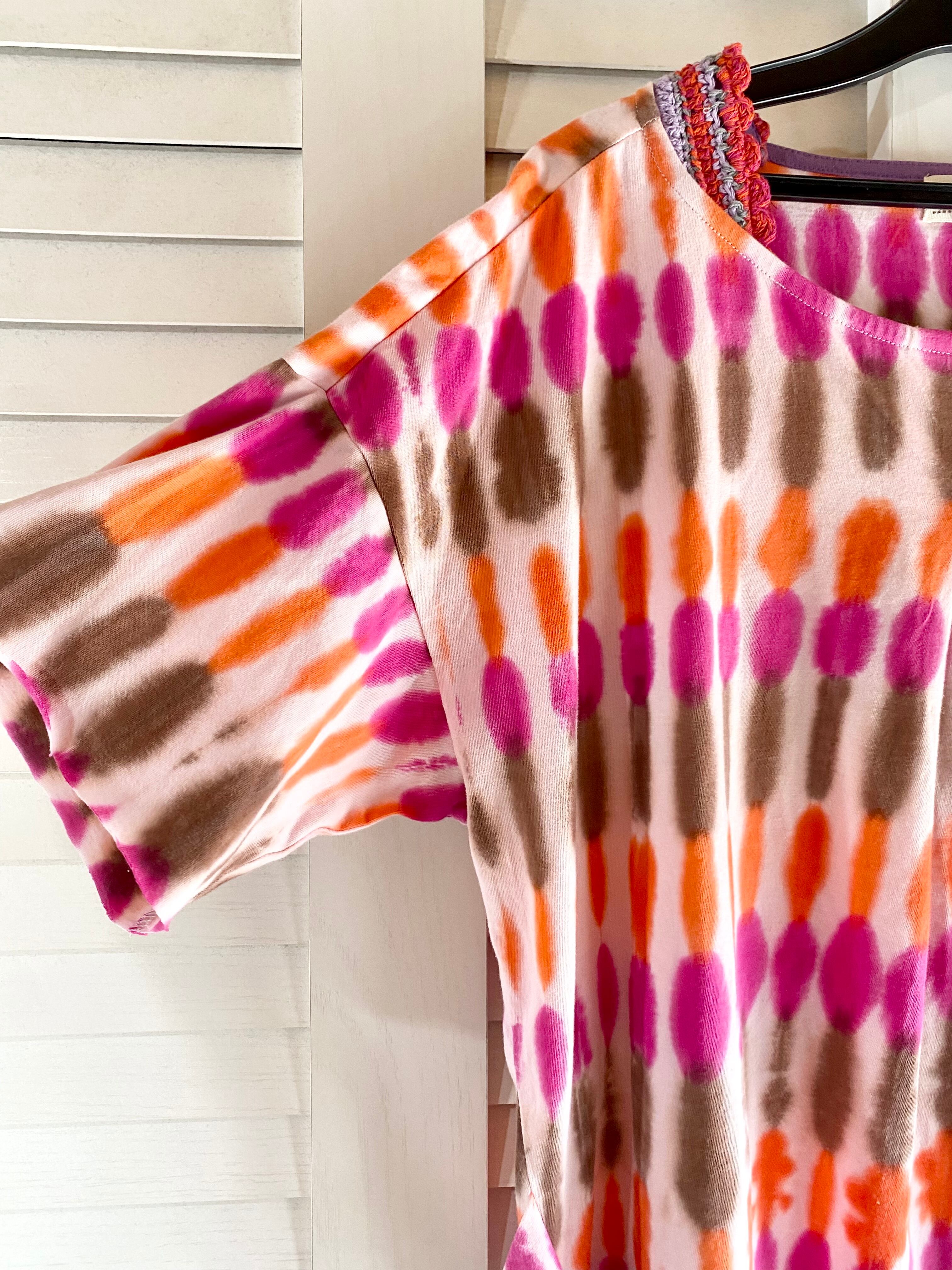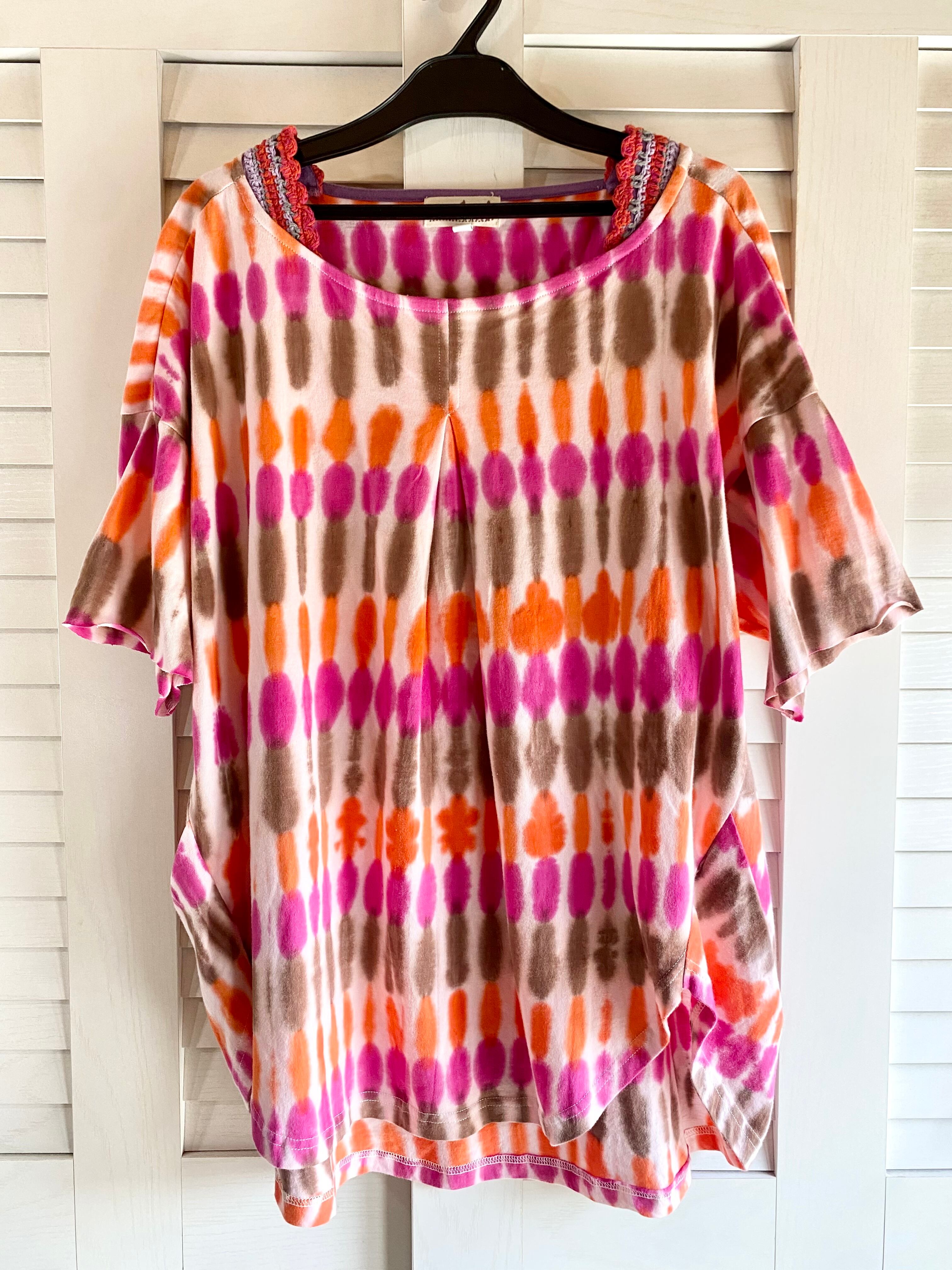 #46 TITICACA タイダイ染め&カギ編みショルダー センタータックデザイン オーバーサイズカットソー ピンクオレンジ