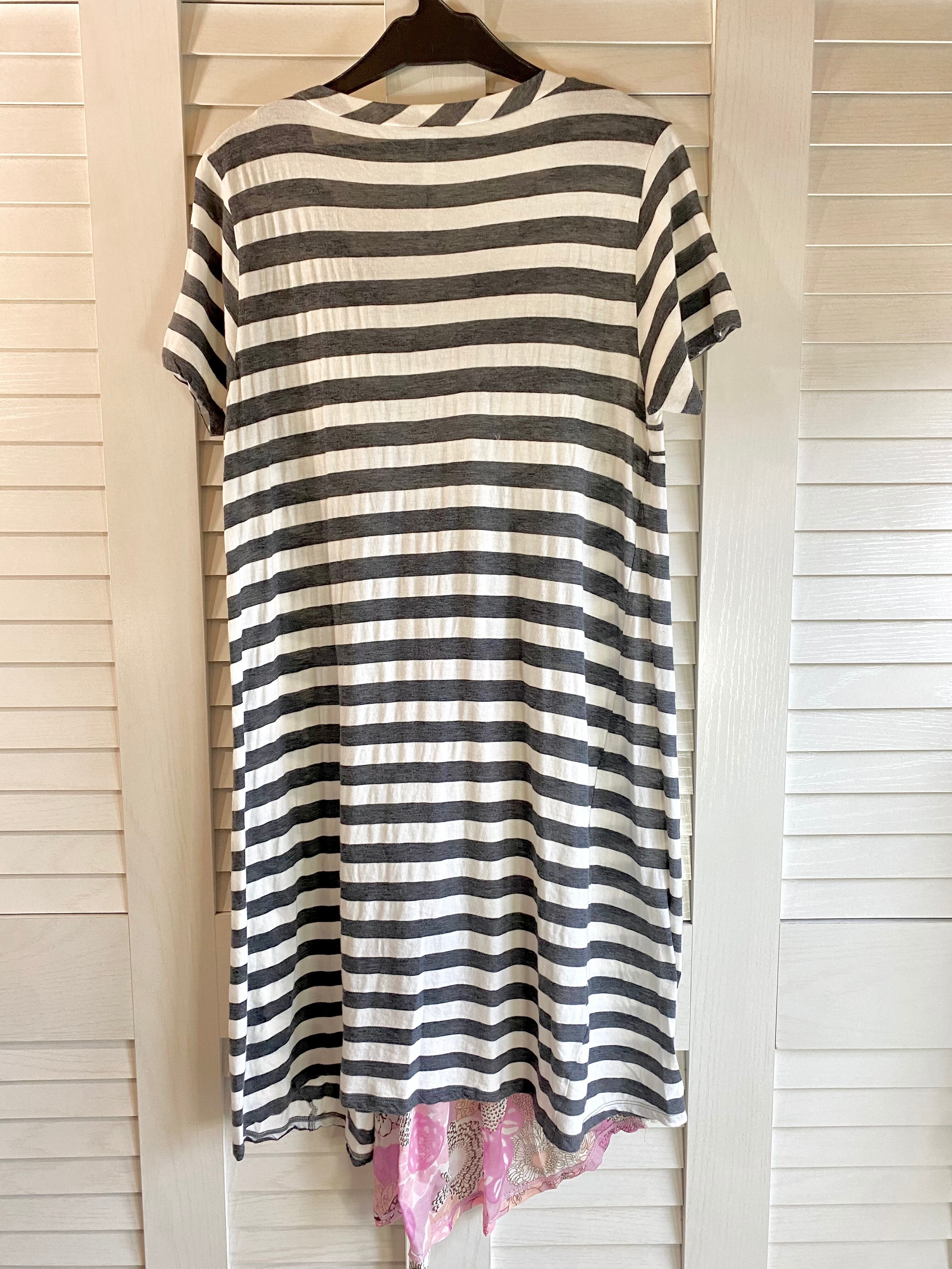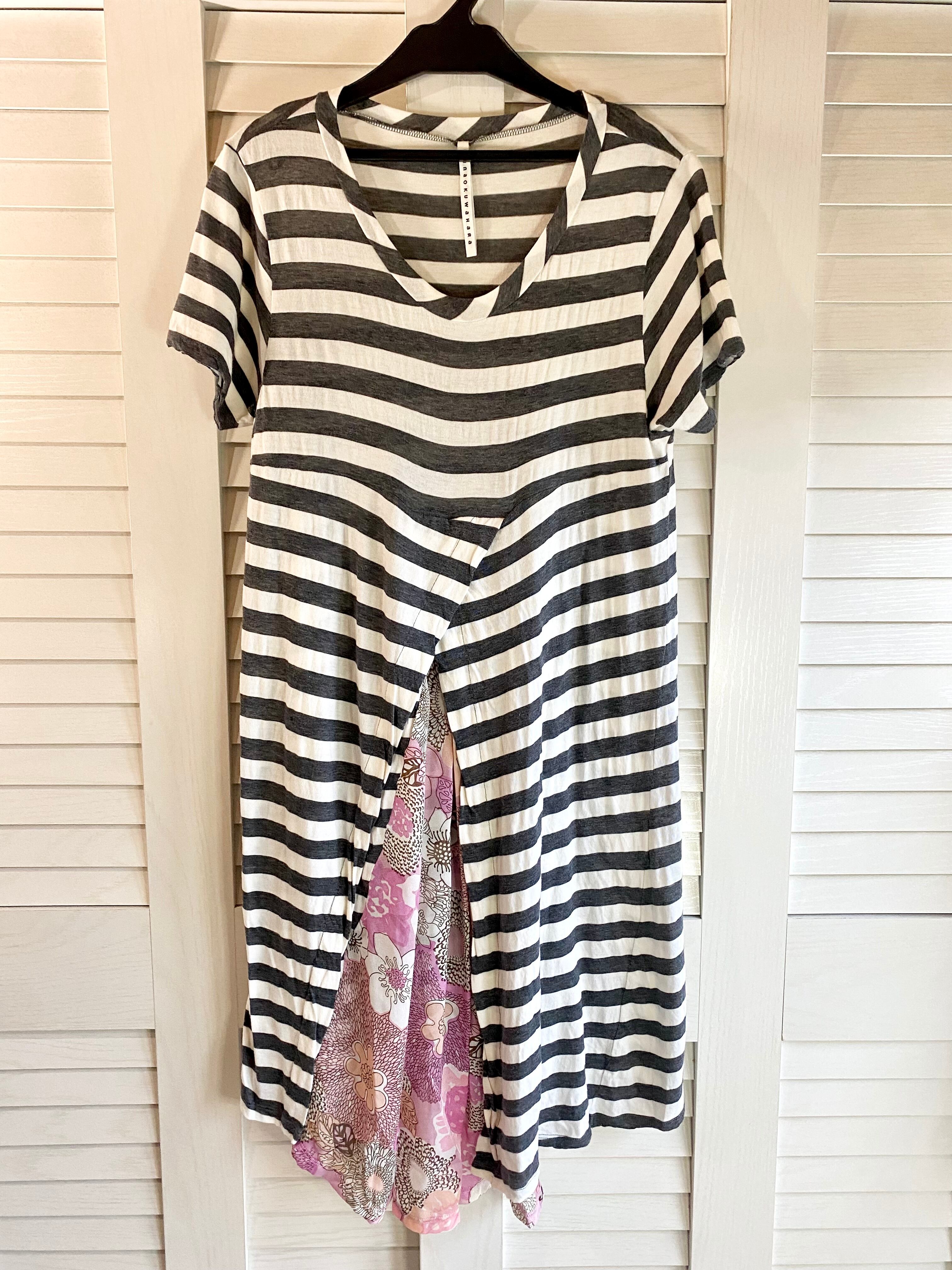 #47 SUNAOKUWAHARA センタータックプリーツ レトロフラワーシフォン切替 ボーダーコットンカットソーワンピ グレー