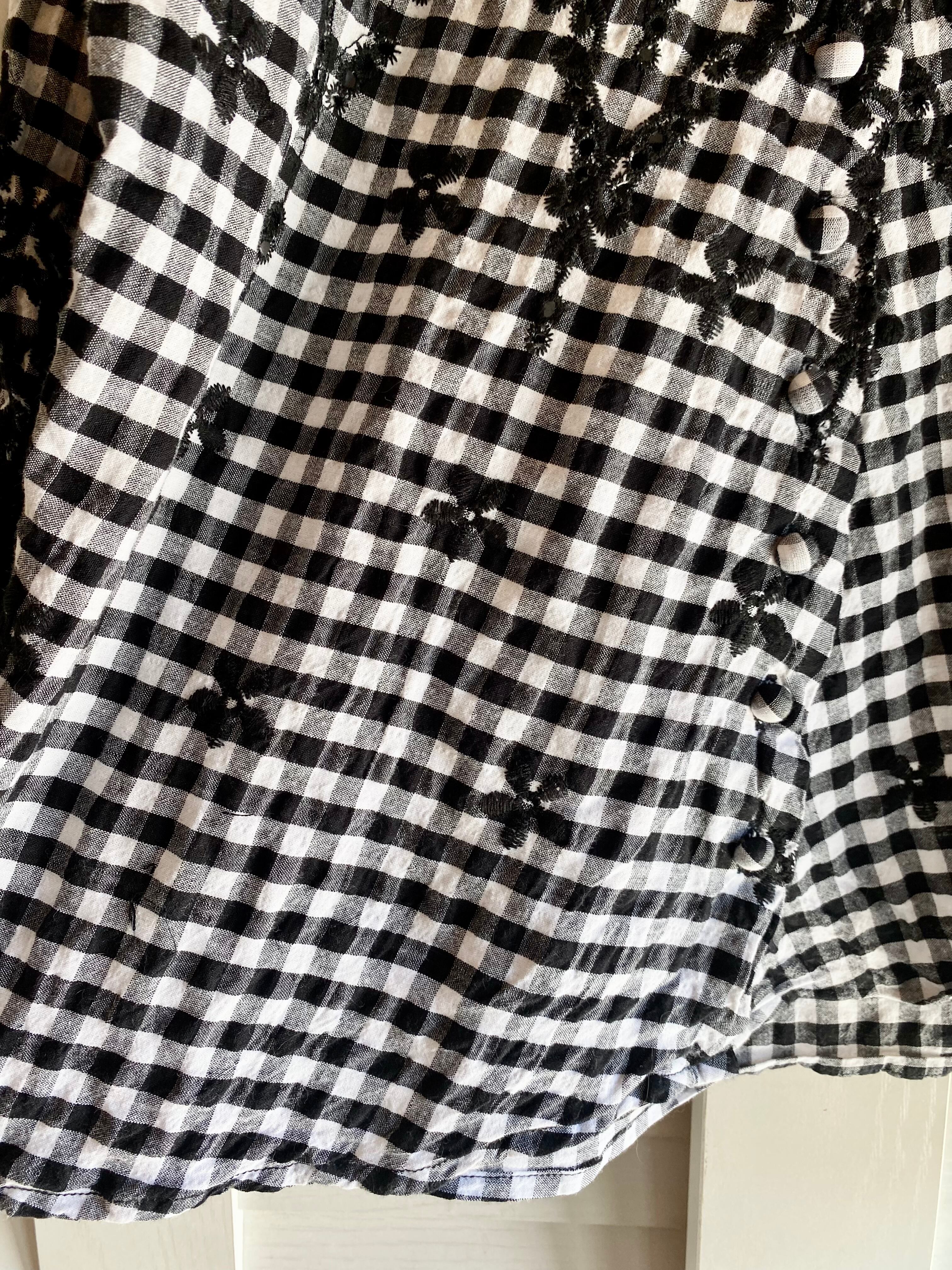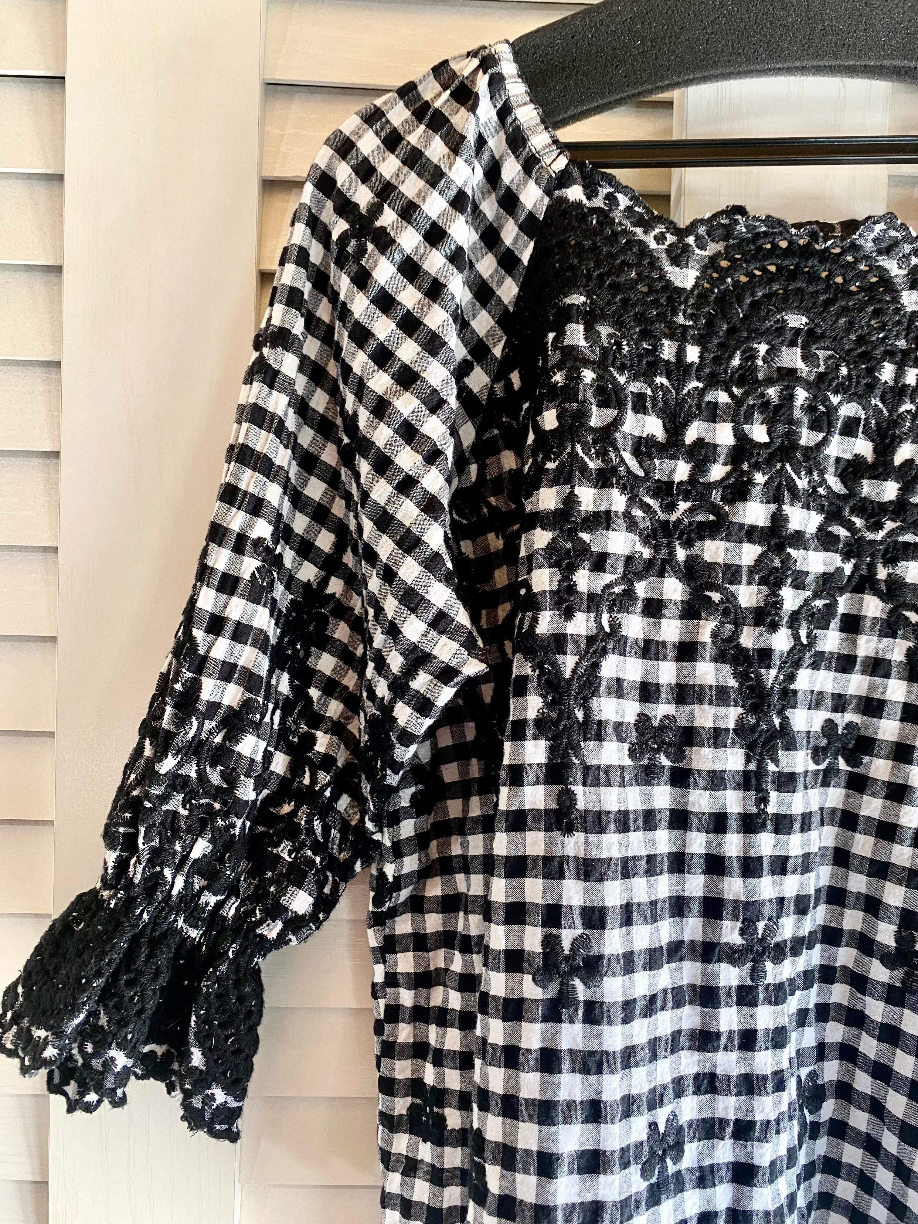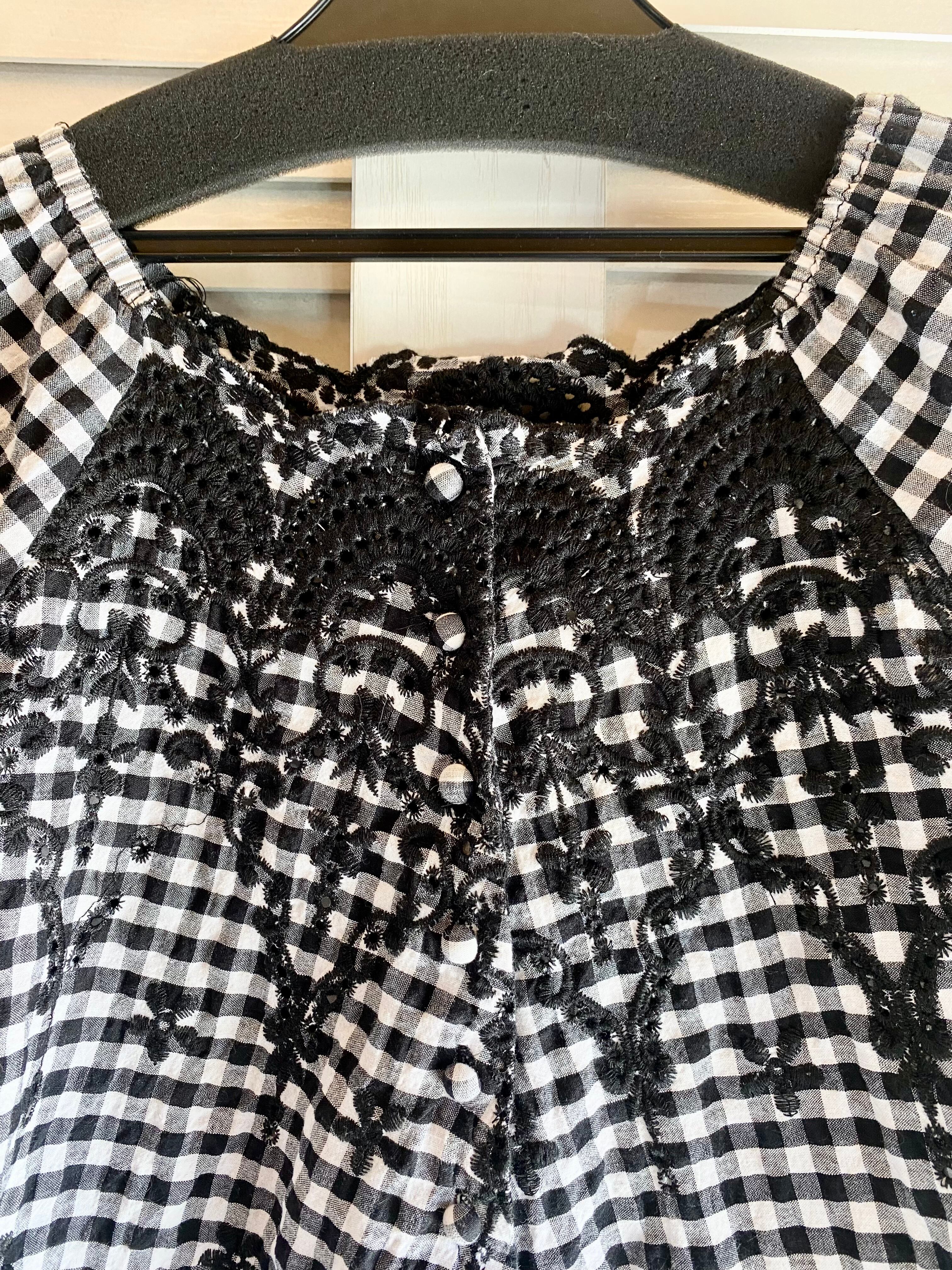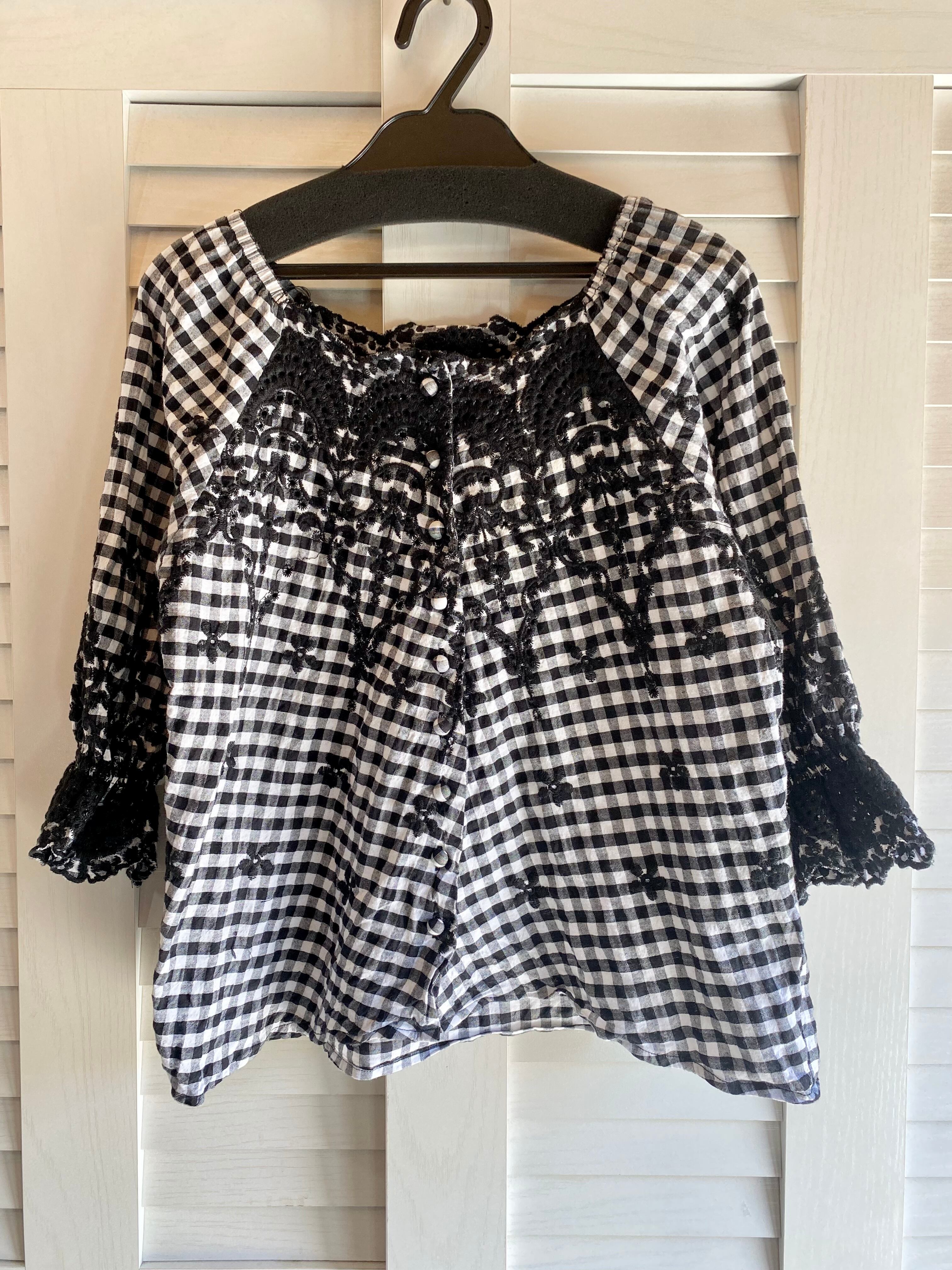 #48 natural couture カッティングレース刺繍 ノーカラーギンガムチェックブラウス ブラック