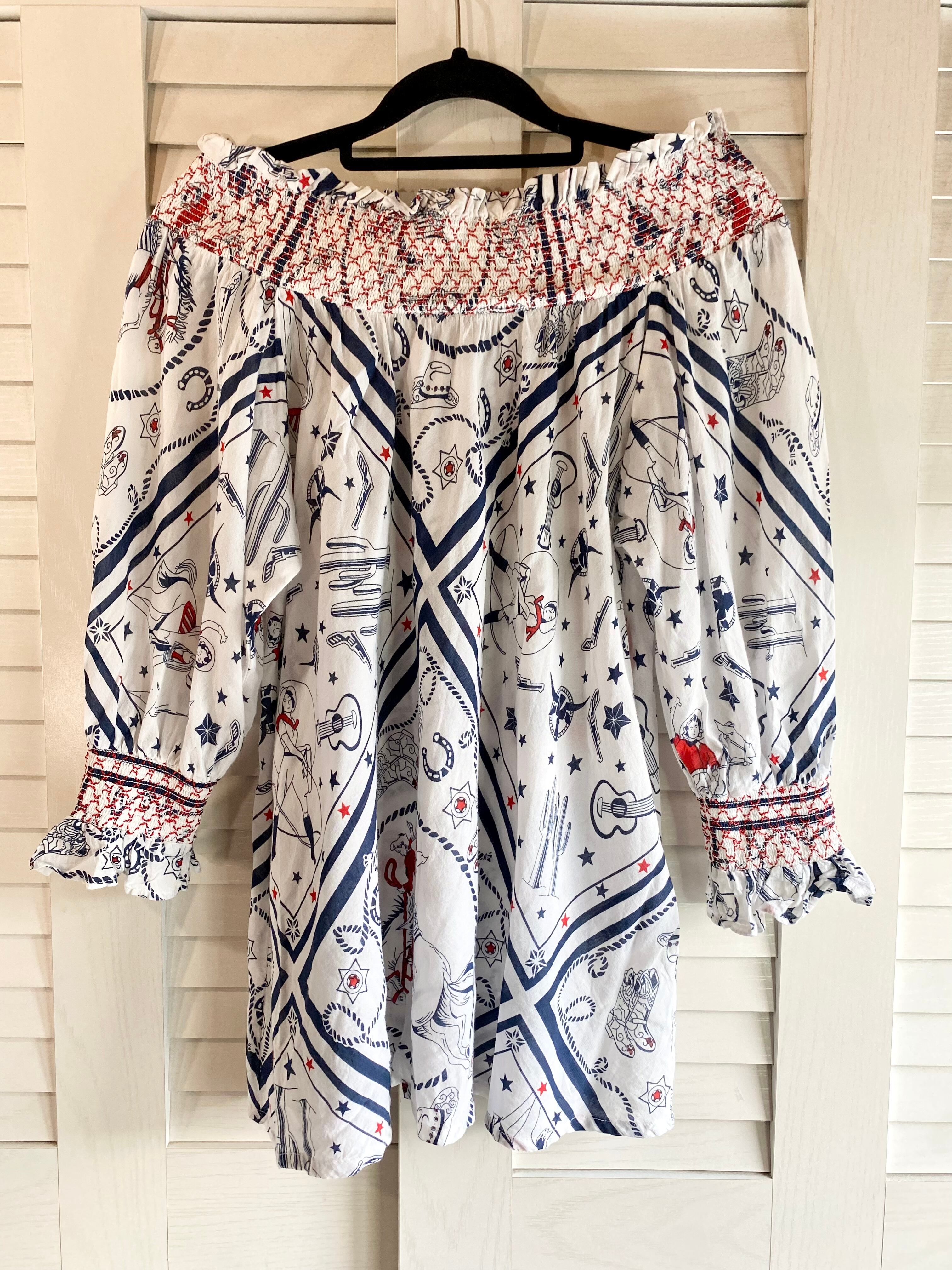#52 ROSE BUD ロデオイラストプリント スモッキング刺繍 レーヨンチュニックブラウス オフホワイト