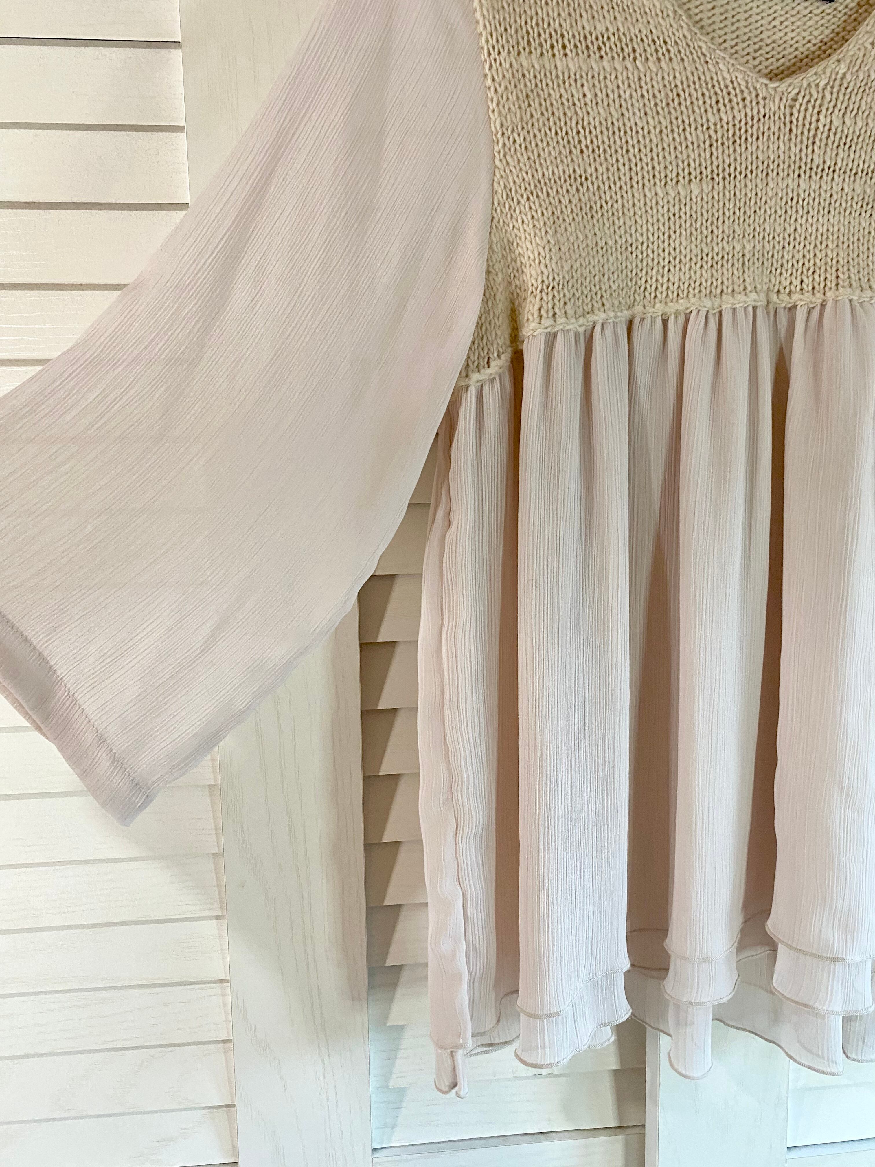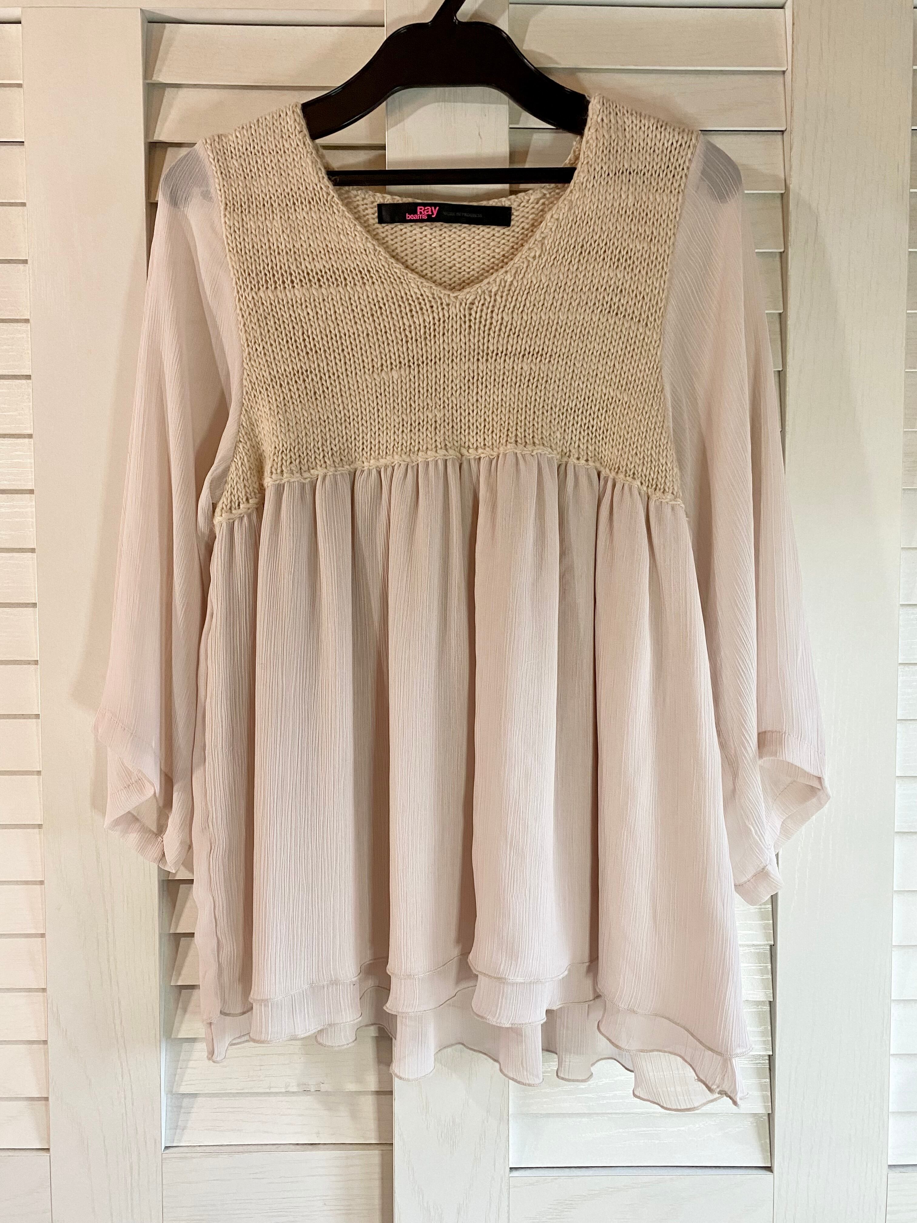 #60 Ray BEAMS ニット×楊柳ジョーゼット チュニックブラウス ライトベージュ