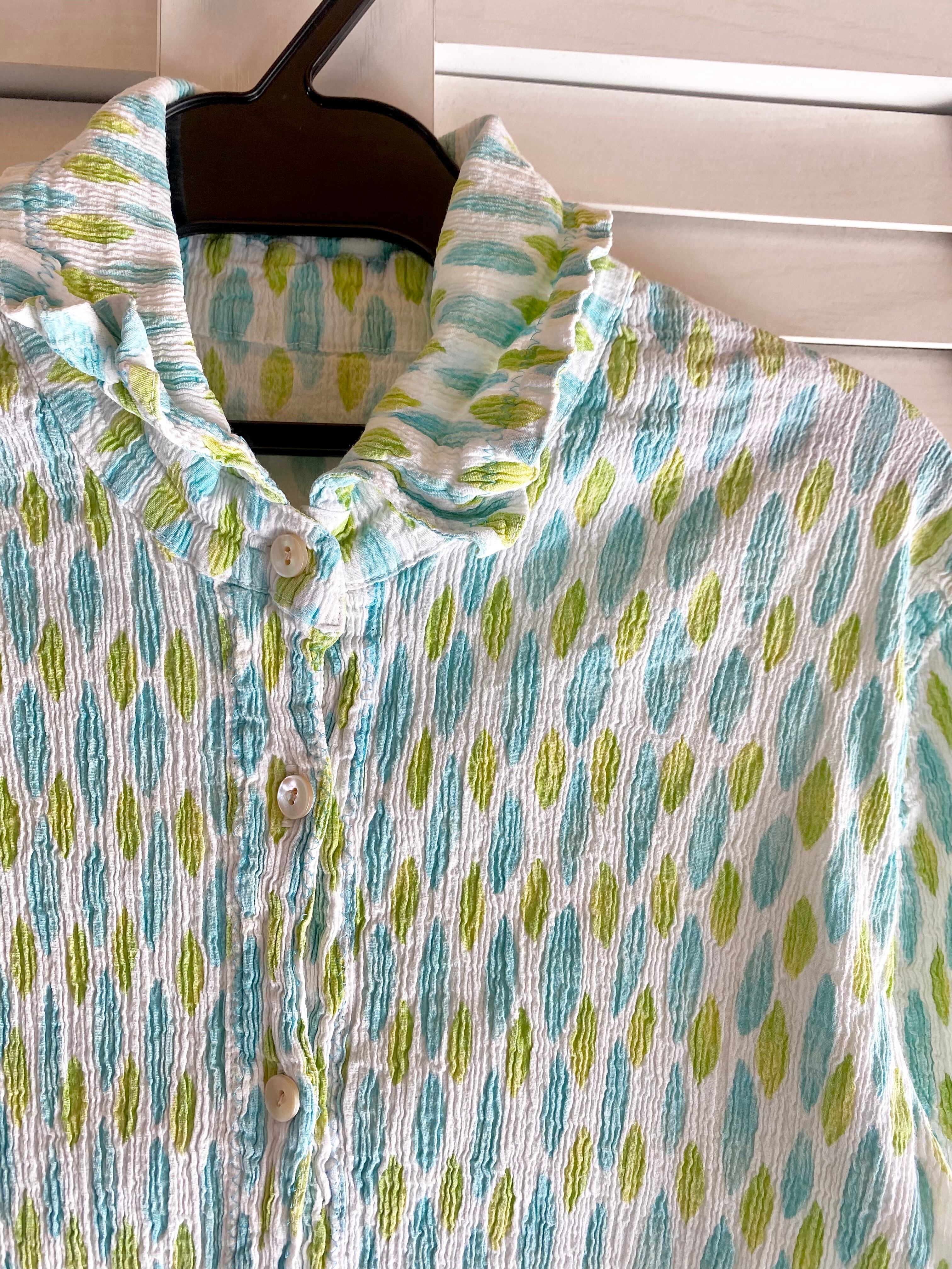 #61 TSUMORI CHISATO 楊柳プリーツ加工 七分袖ブラウス ブルー×グリーン