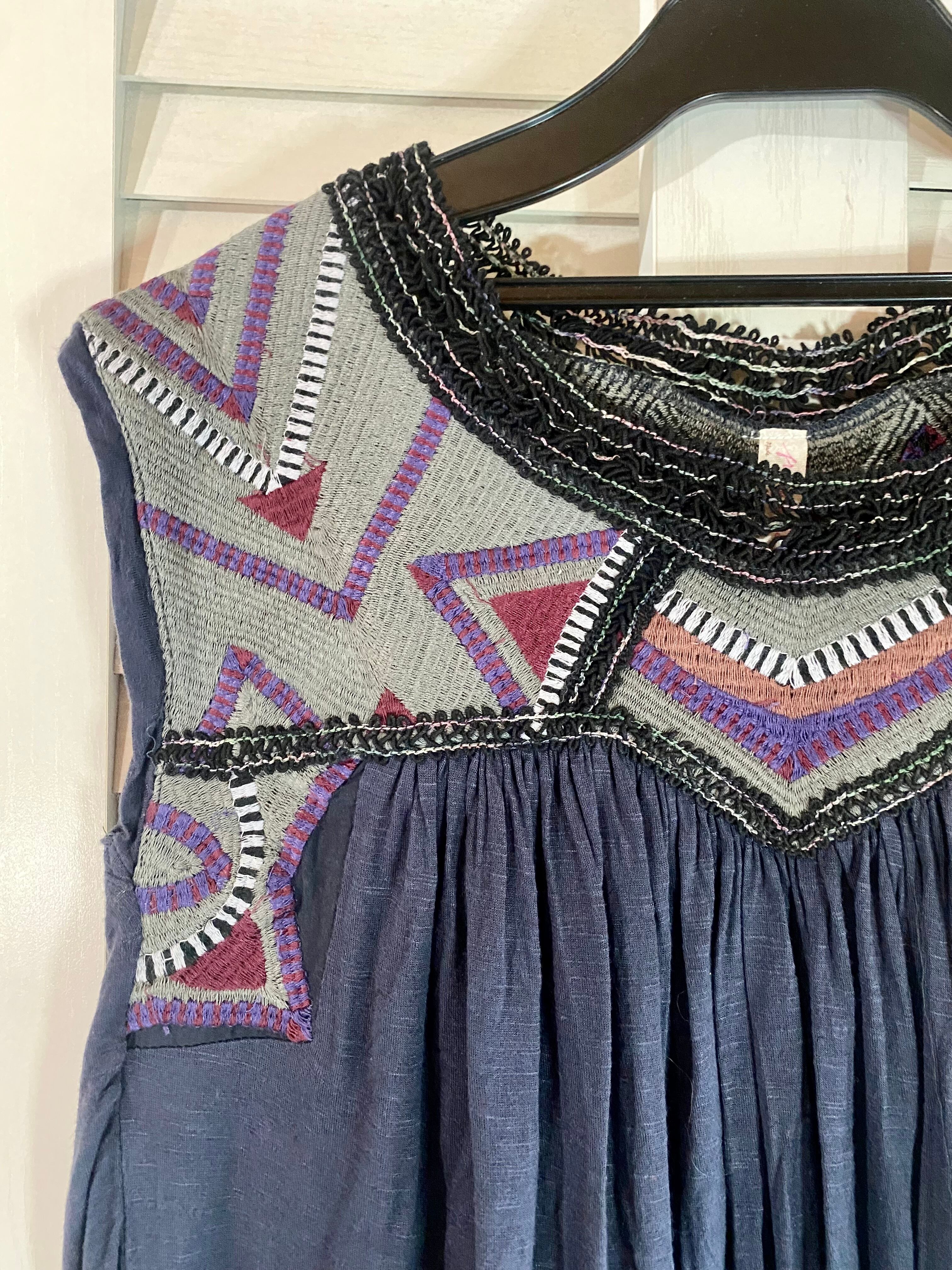 #62 FREE PEOPLE 刺繍ヨーク レーヨンカットソー ノースリーブボリュームブラウス ネイビー