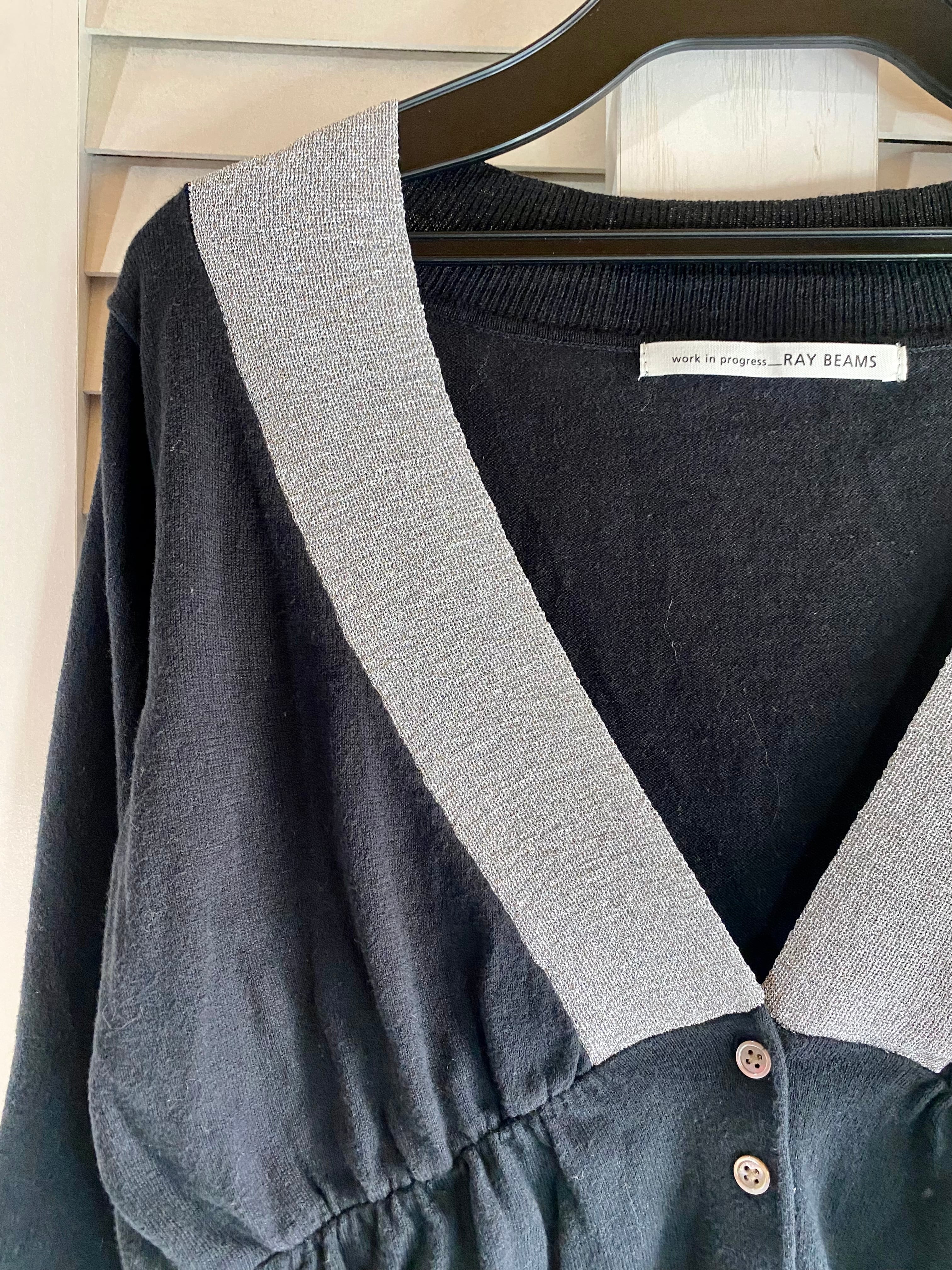 #65 Ray BEAMS シルバーライン Vネックコットンニットカーデ ブラック