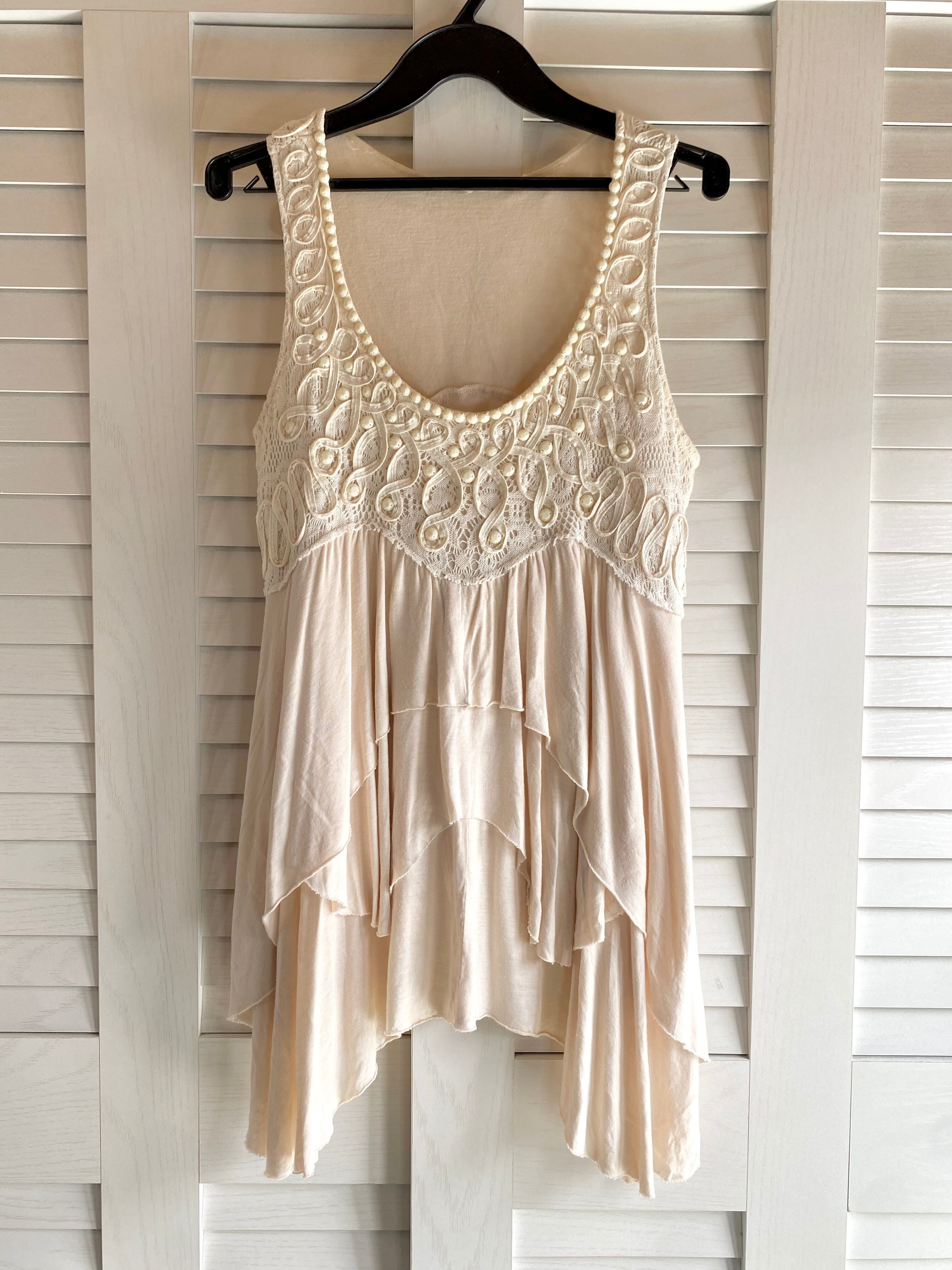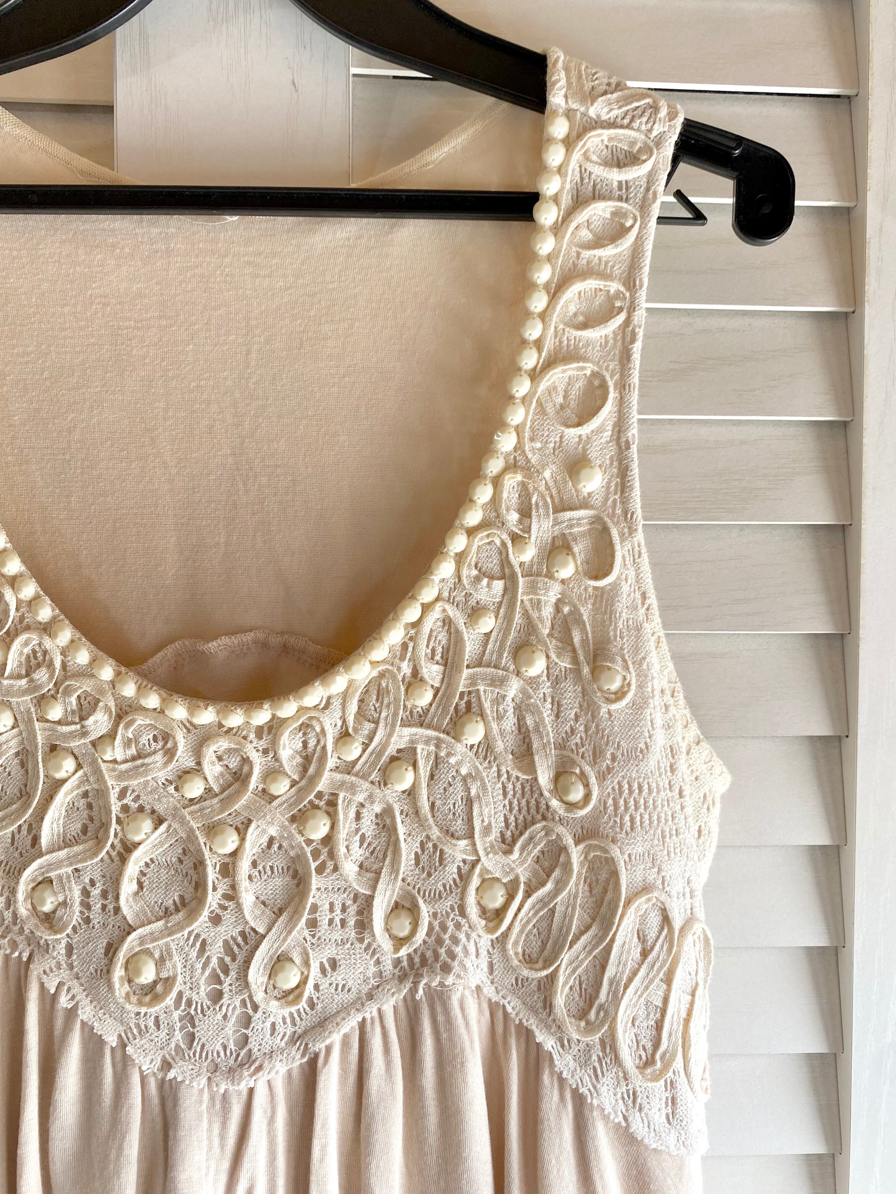 #69 GRACE CONTINENTAL ビジュー&リボンライン刺繍 レーヨンカットソー ティアードノースリーブブラウス クリームベージュ