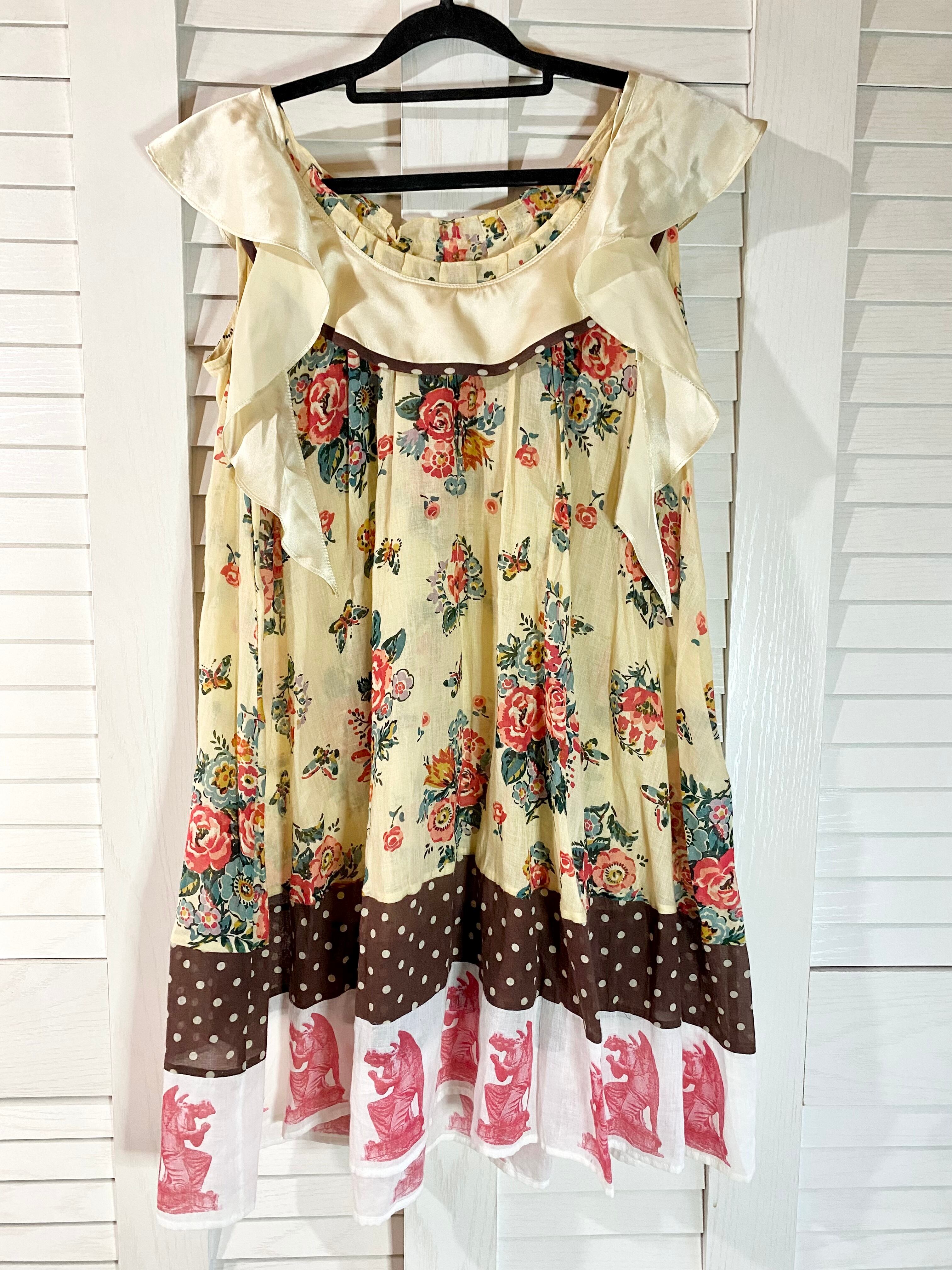 #72 SUNAOKUWAHARA サテンフリル 綿ローンシュールプリントパッチワーク チュニックワンピ クリームベージュ