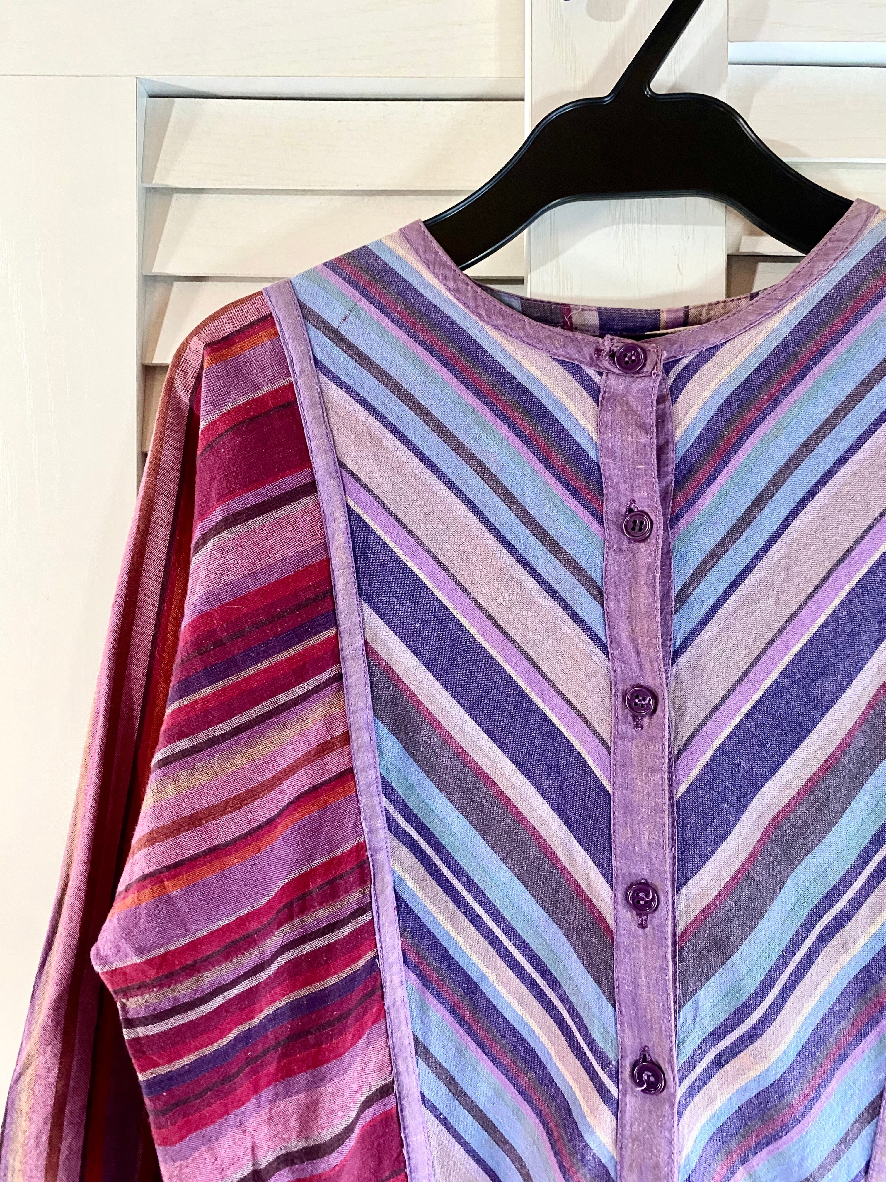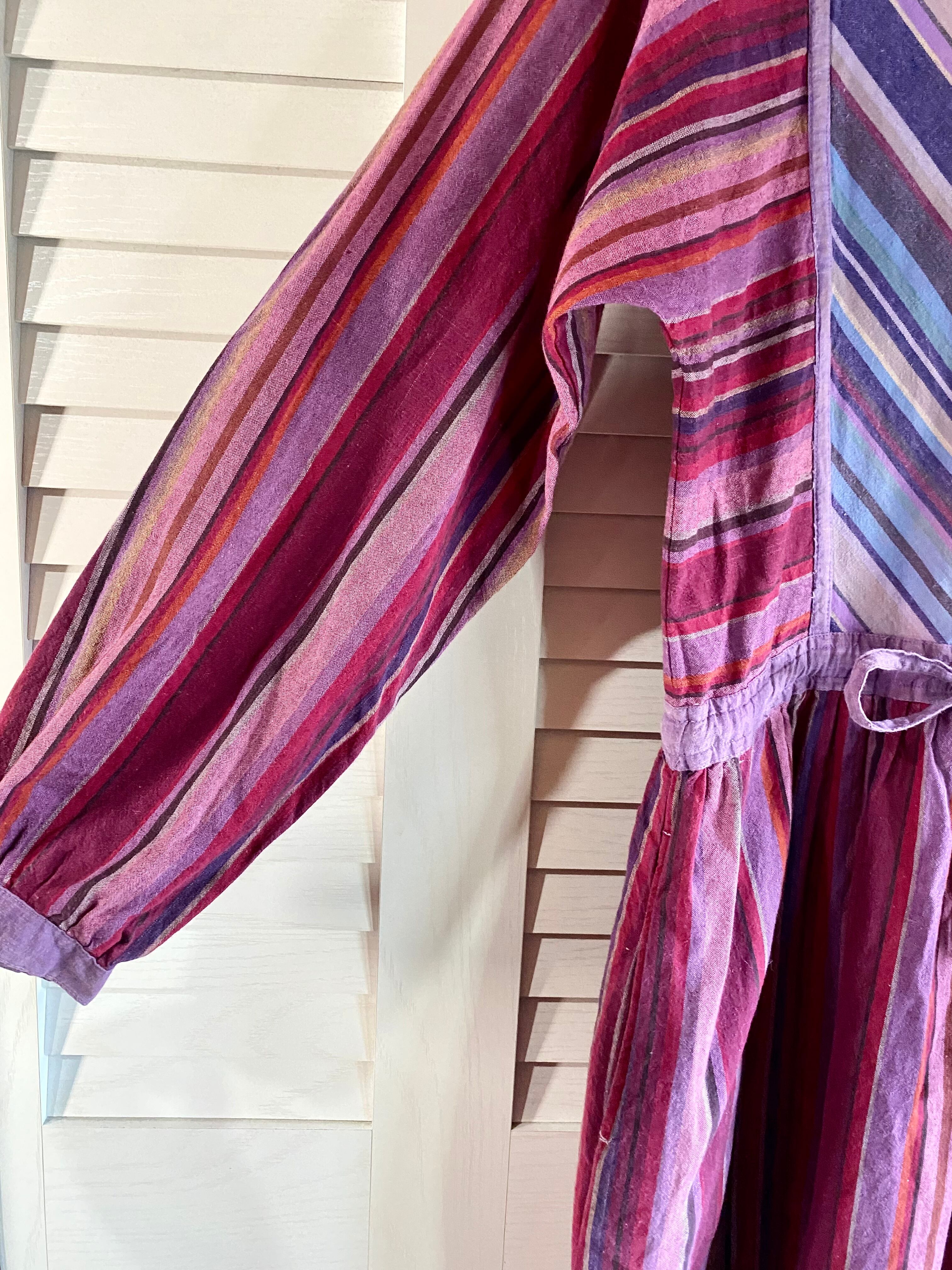 #75【古着屋購入】US古着70Sヴィンテージ インドコットン ストライプ切替デザインワンピ ピンクパープル