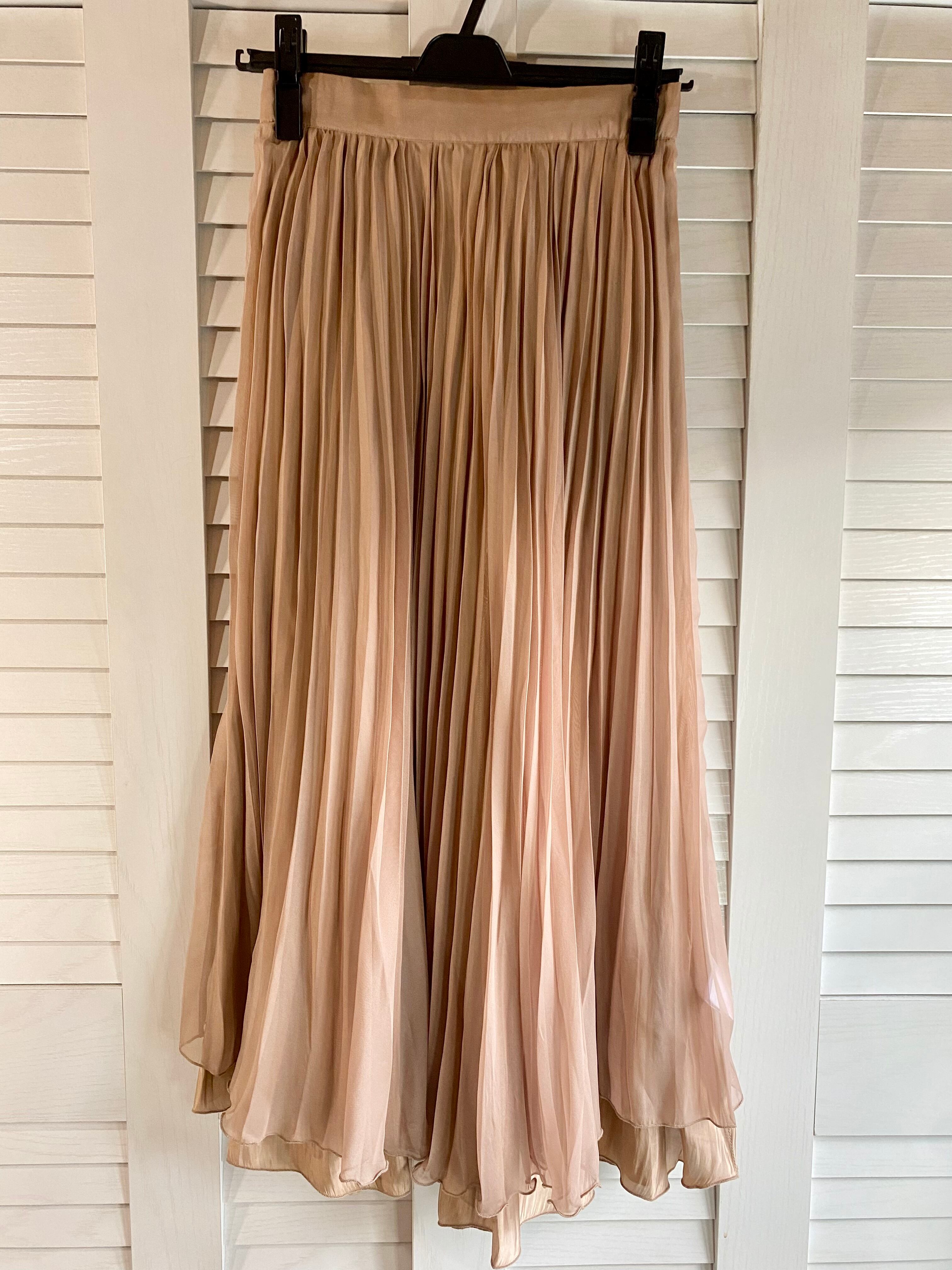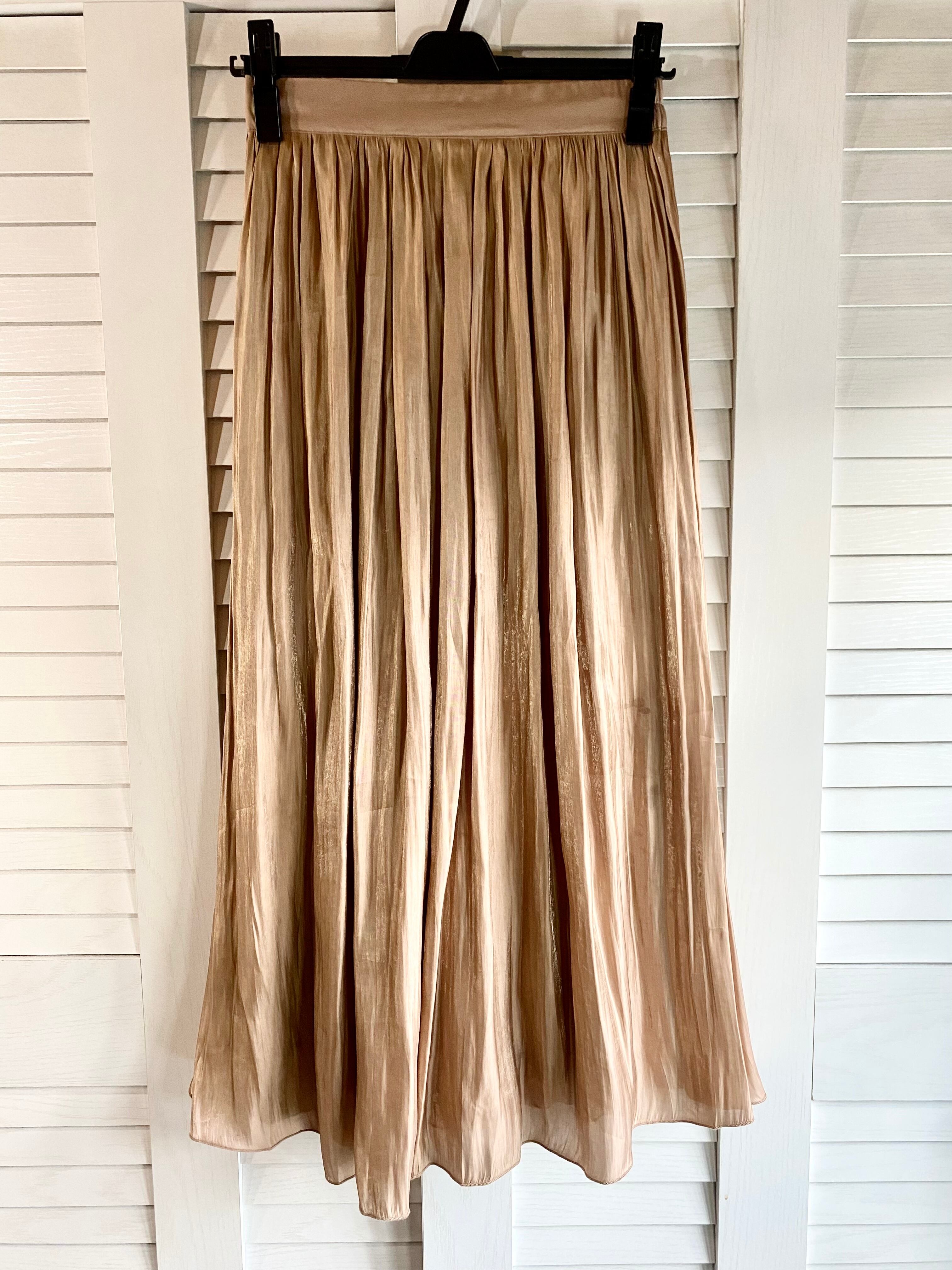 #75 mysty woman スパークシャンブレーサテン×プリーツシフォンジョーゼット リバーシブルスカート シャンパンベージュ