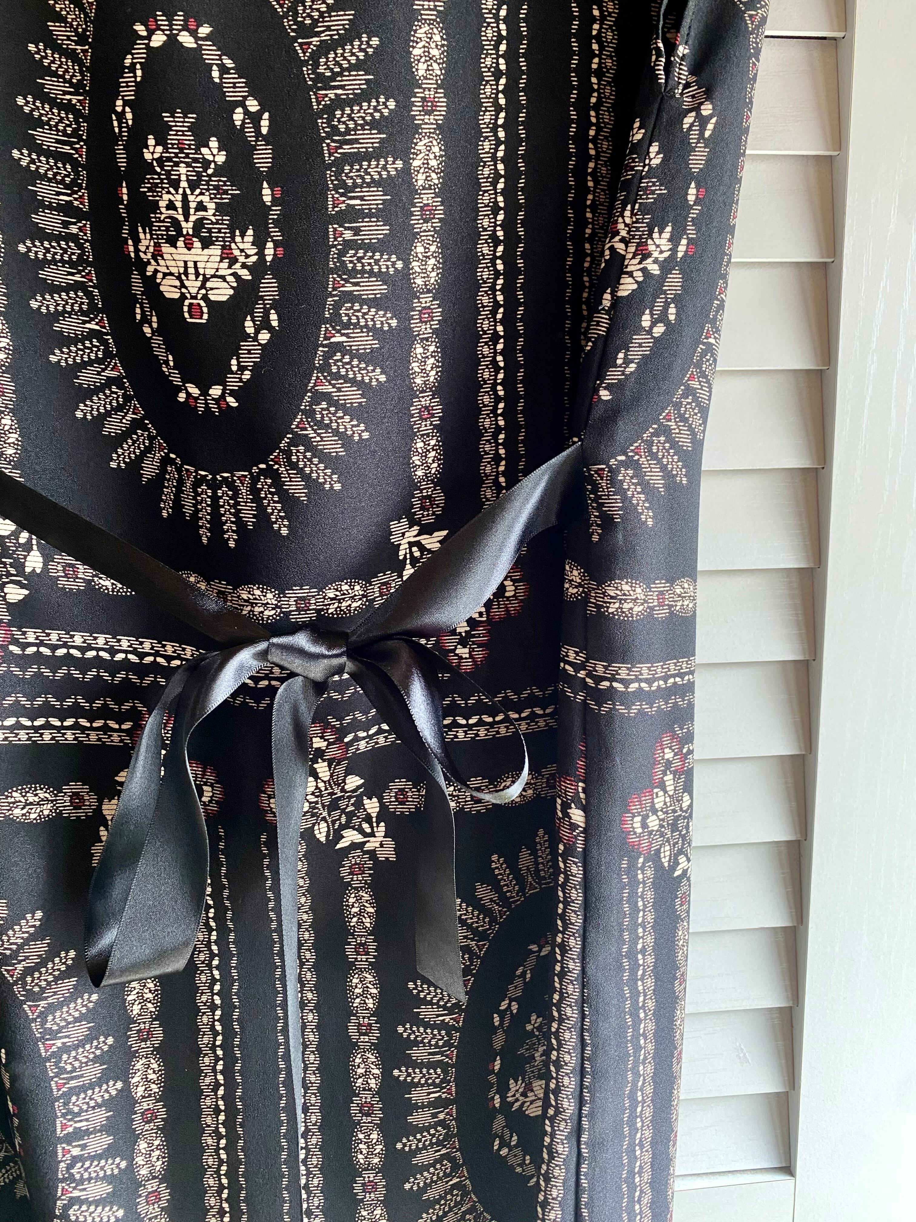 #76 chambre de charme ヨーロピアン アンティークプリント サテンリボンベルト パネルワンピ ブラック