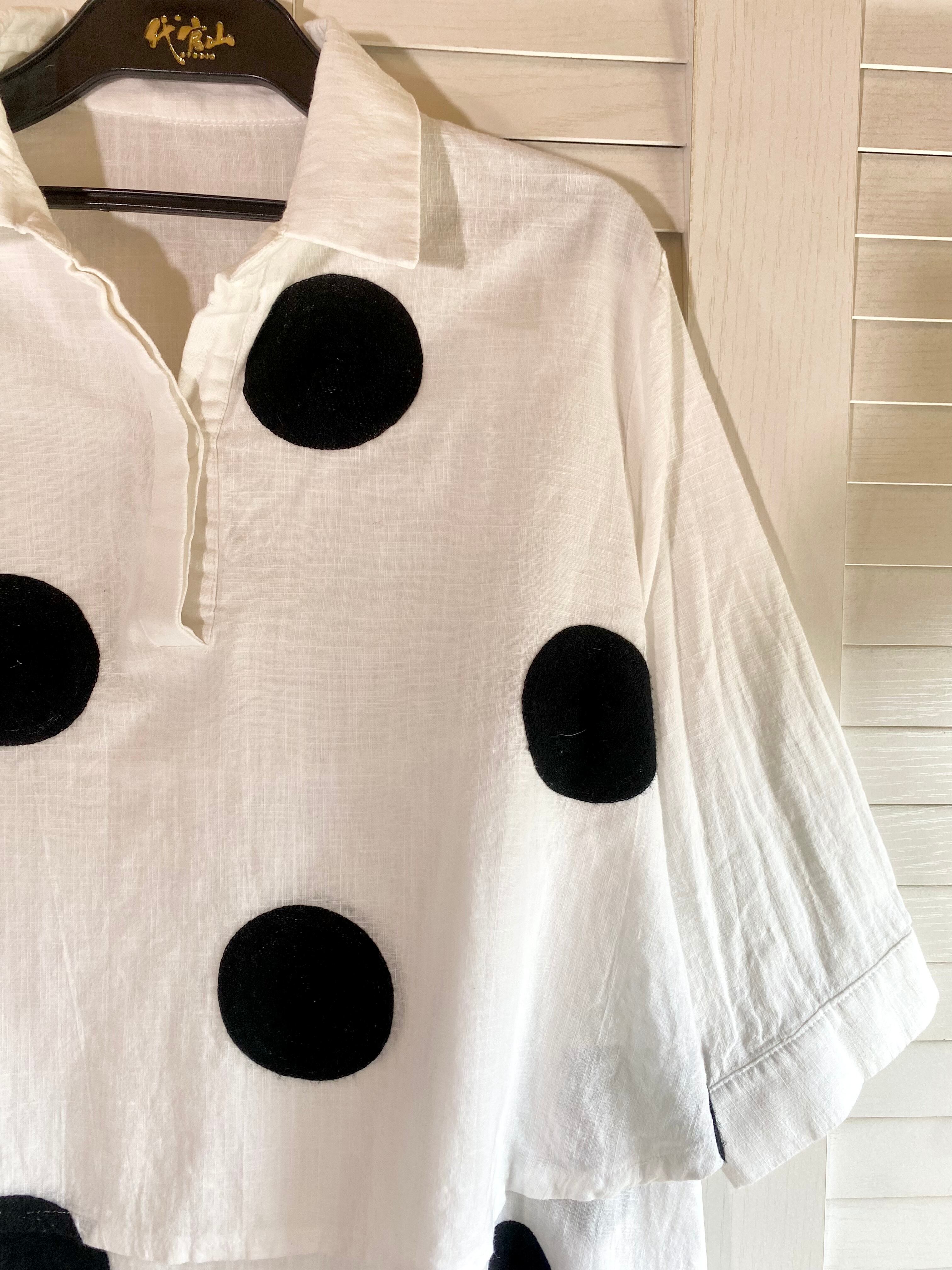 #77 Plaisir femme BIGドットステッチ刺繍 レイヤードフレアーシャツブラウス オフホワイト