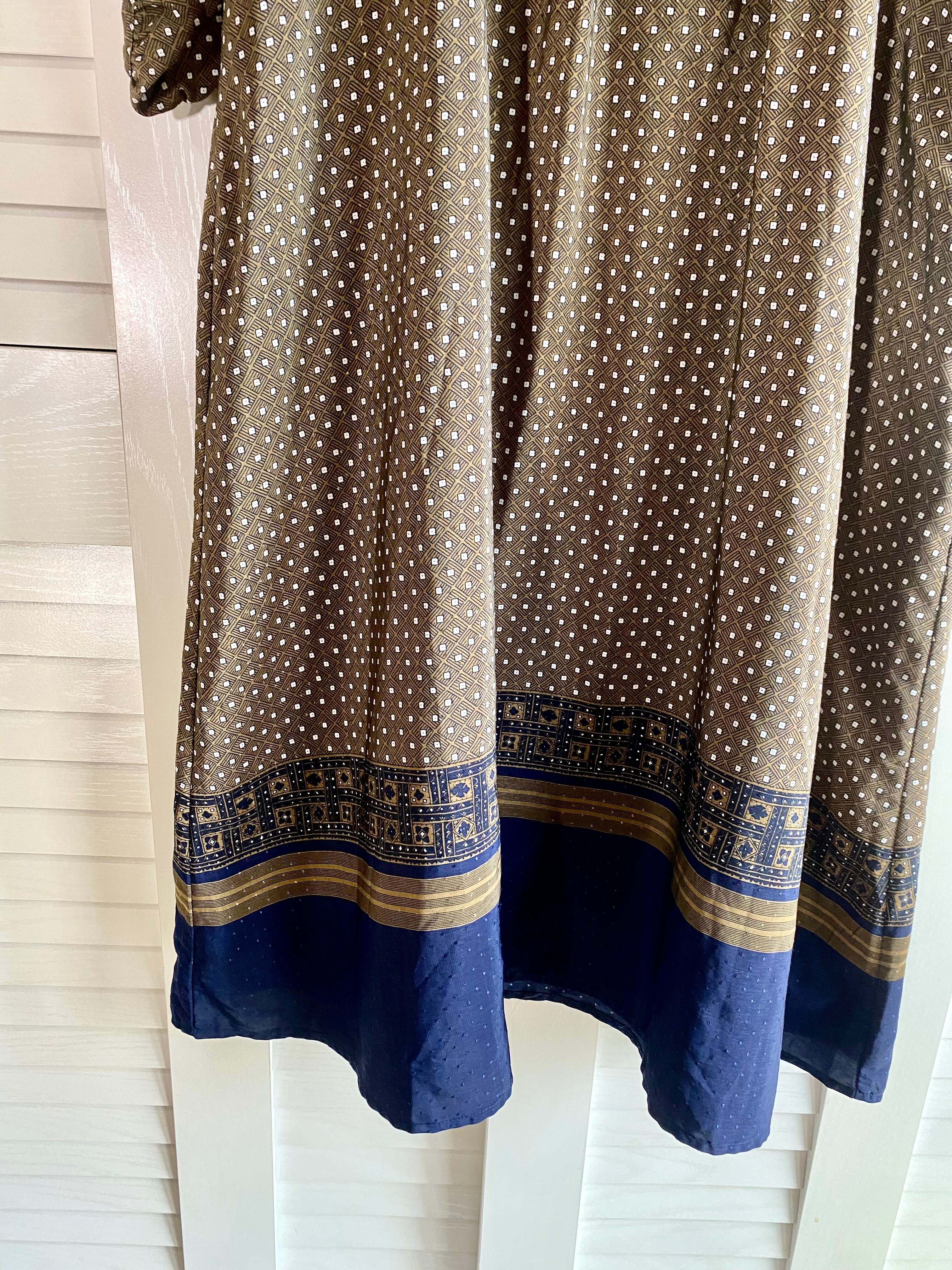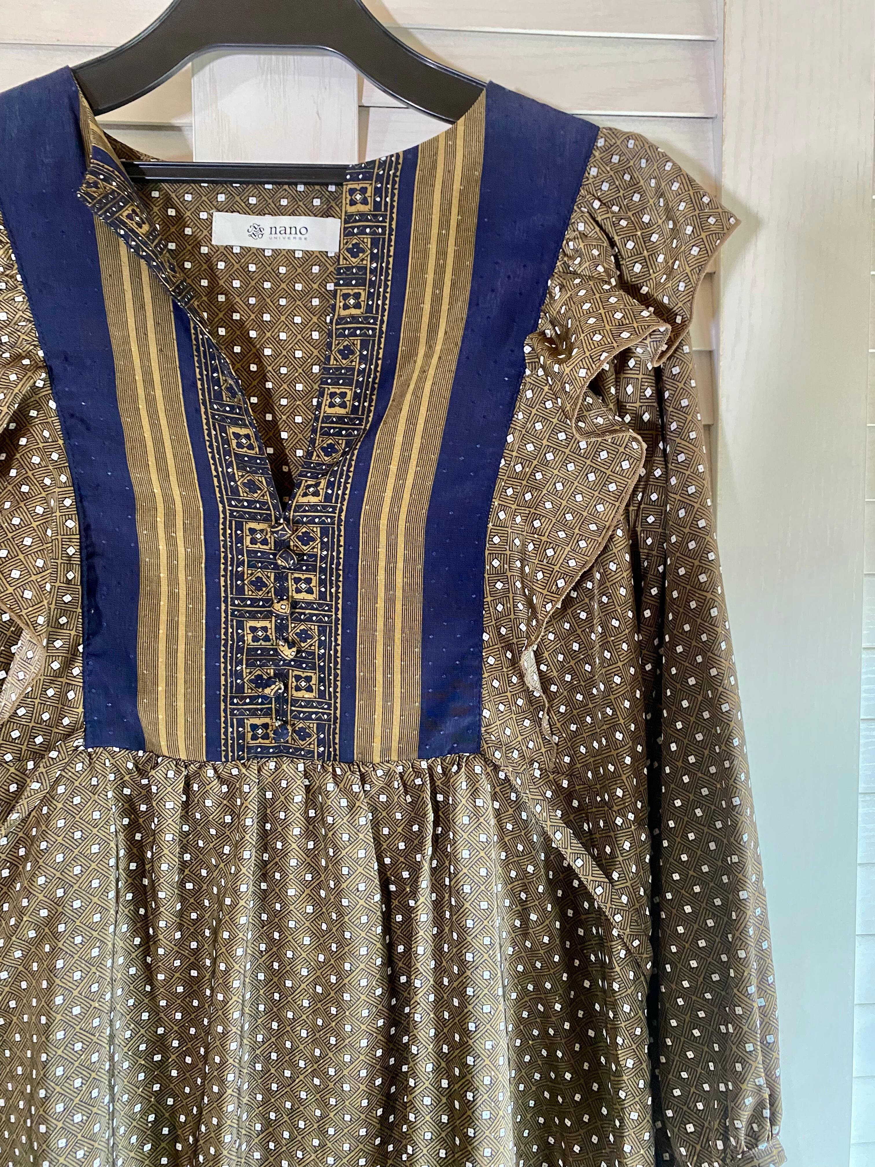 #77 nano・universe マニッシュプリント ハイウエスト切替 ボリュームスリーブワンピ ブラウン