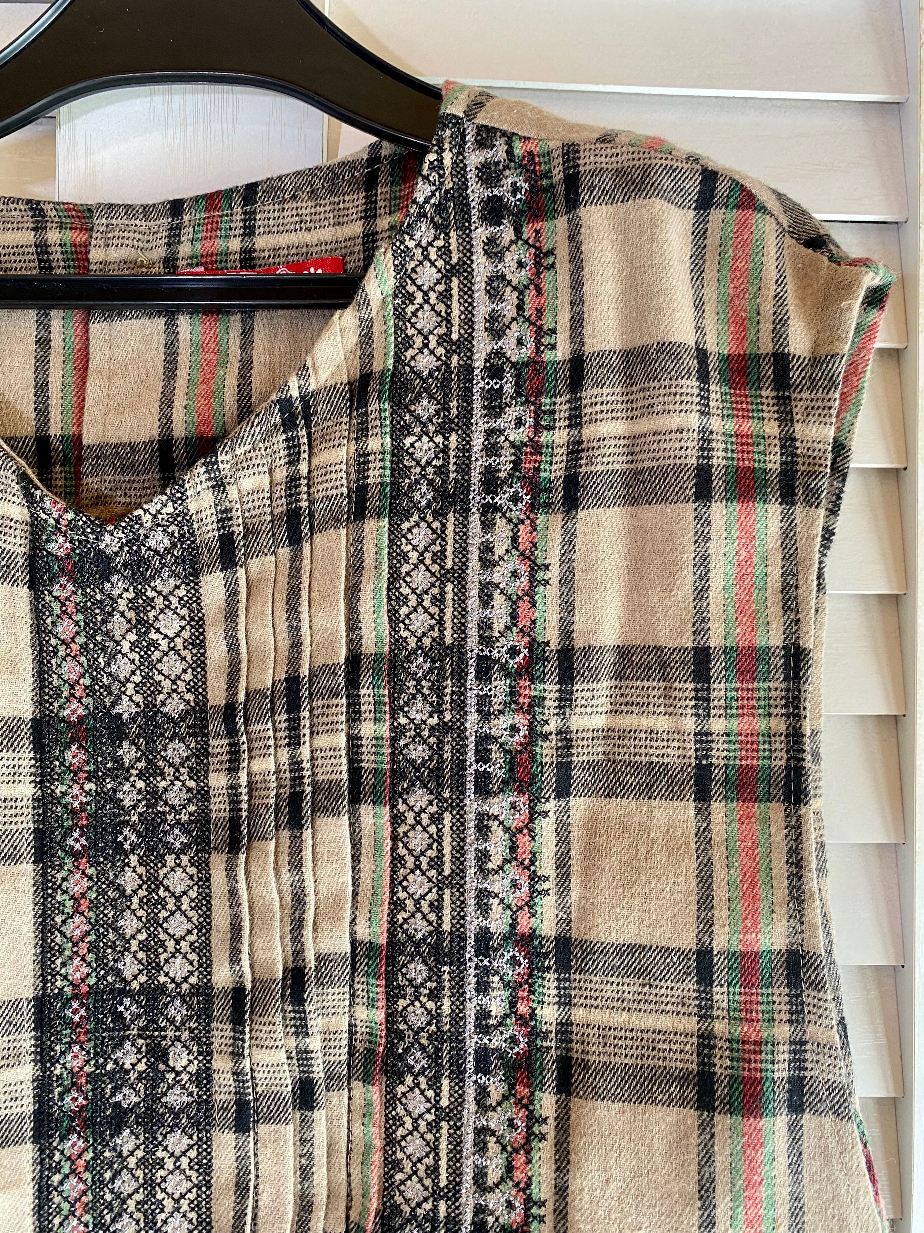 ★BASEクーポン★Amina ピンタック&クロスステッチ刺繍 タータンチェック フランネルデザインベスト ベージュ