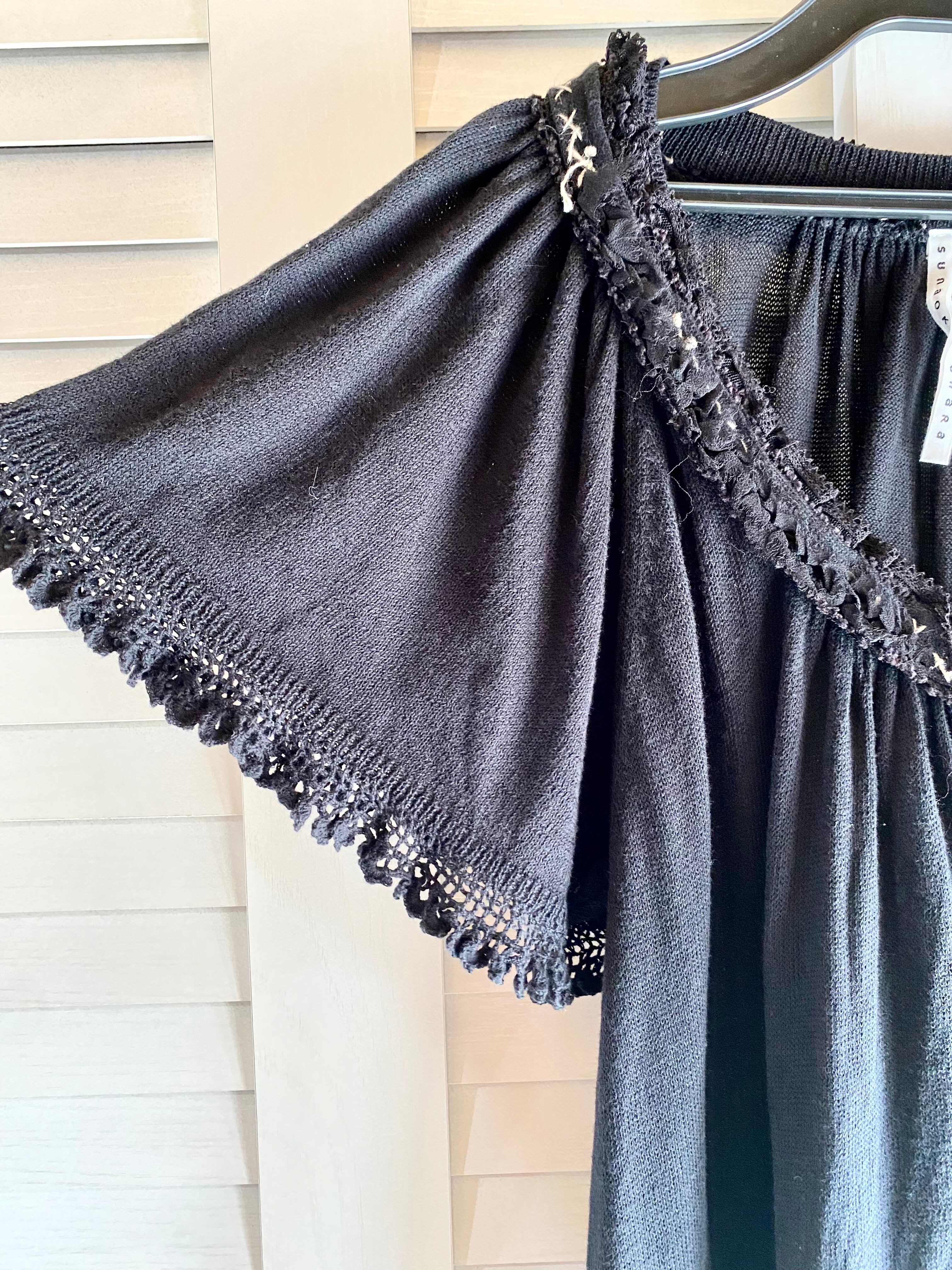★BASEクーポン★SUNAOKUWAHARA Vネック&ベルフレアースリーブ レース&チュールデザインフレアーコットンニット ブラック
