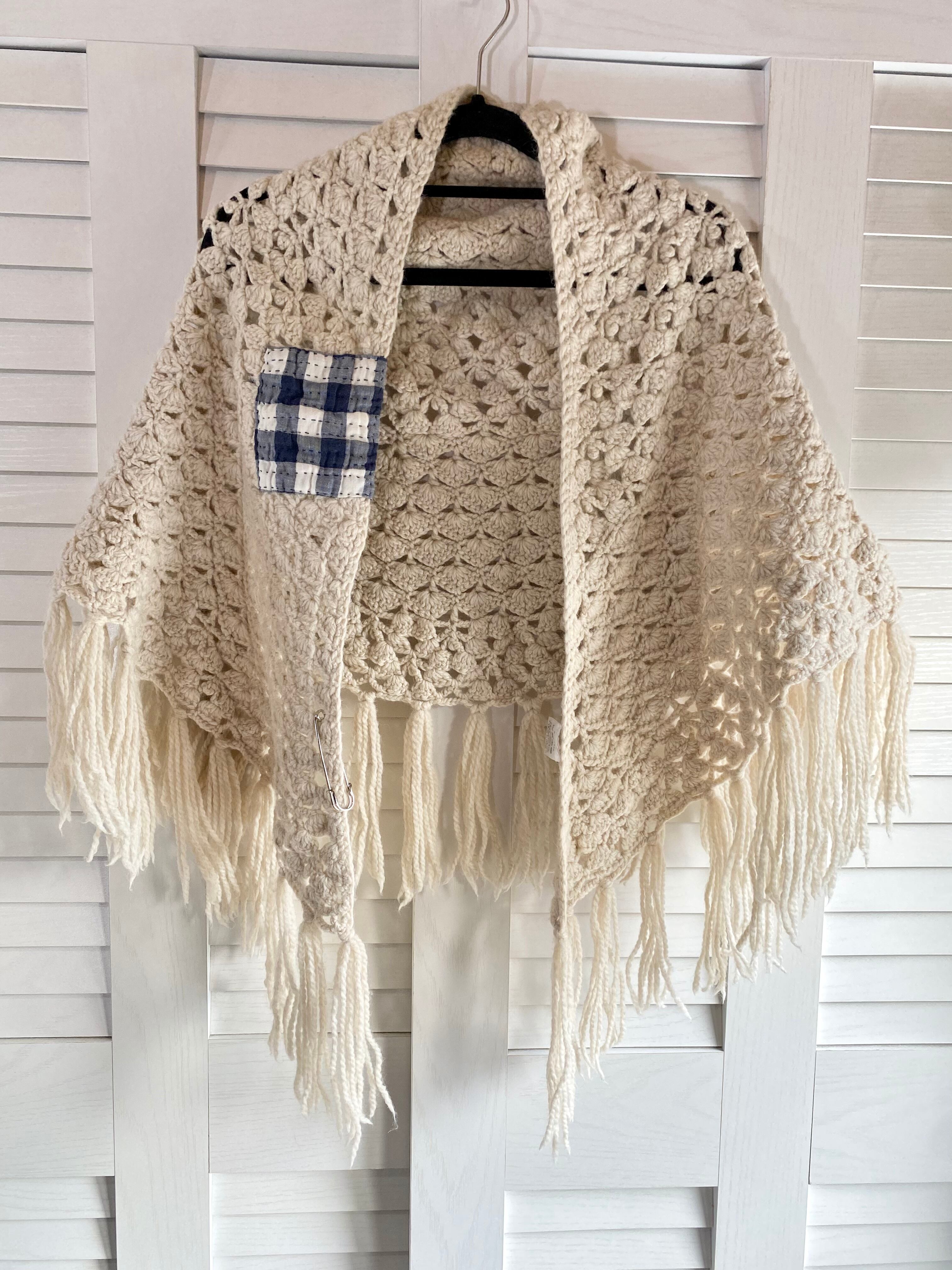 #88 NANATONE 刺し子ギンガムパッチワーク カギ編みウールニットショール アイボリー
