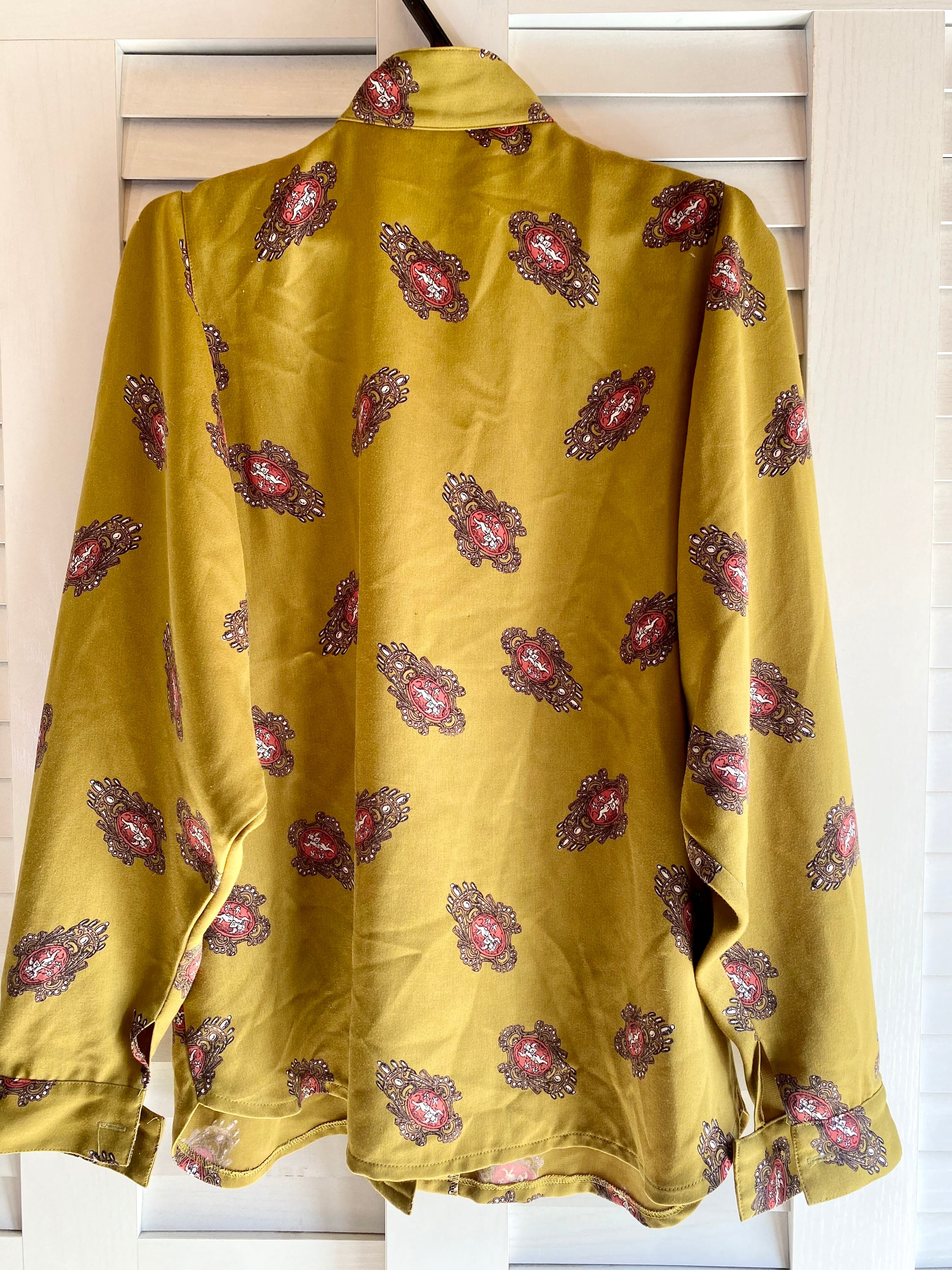 #89【国産古着】激レア!70Sヴィンテージ エンジェルカメオイラストプリント ハイネックブラウス キミドリ