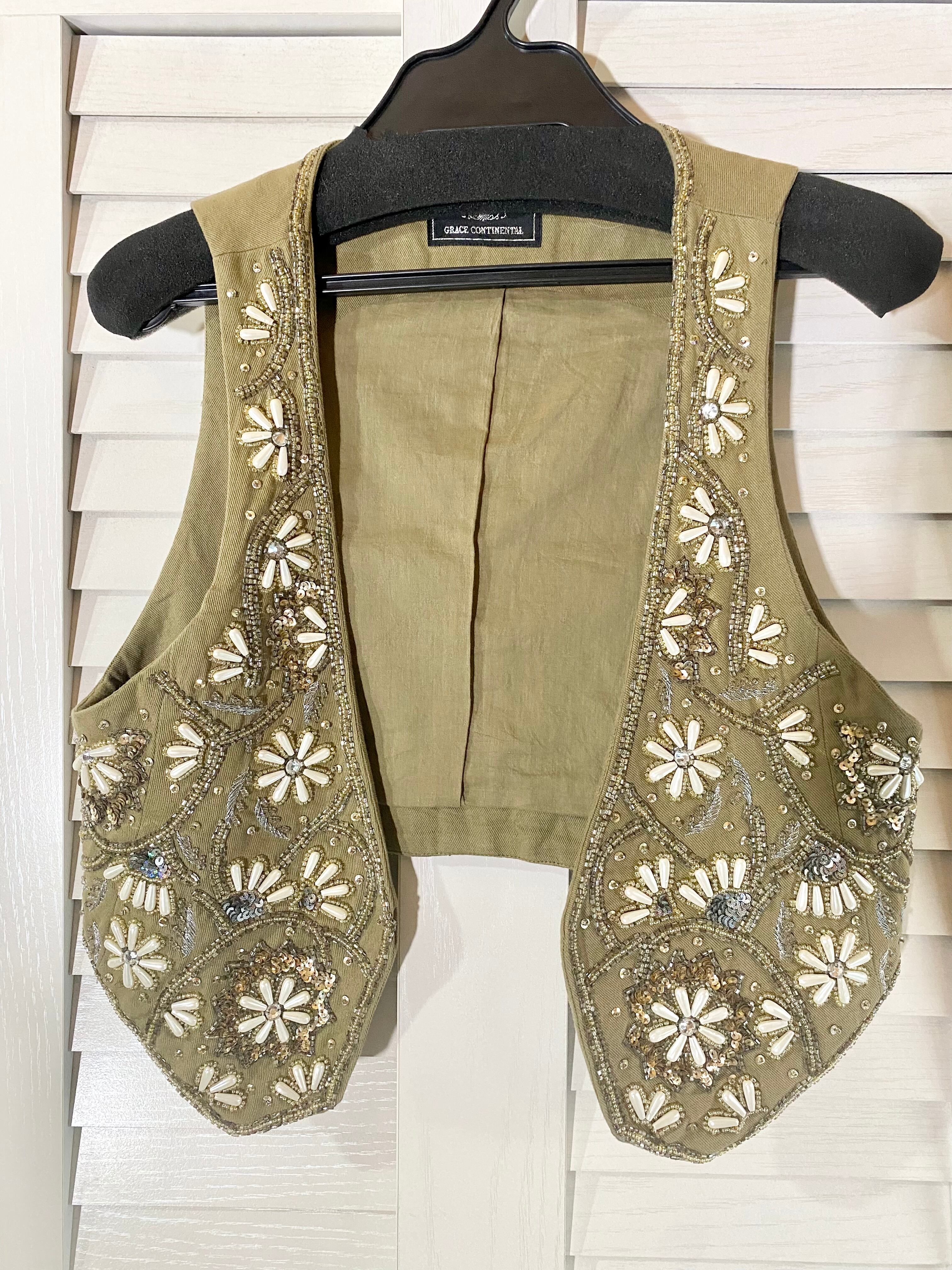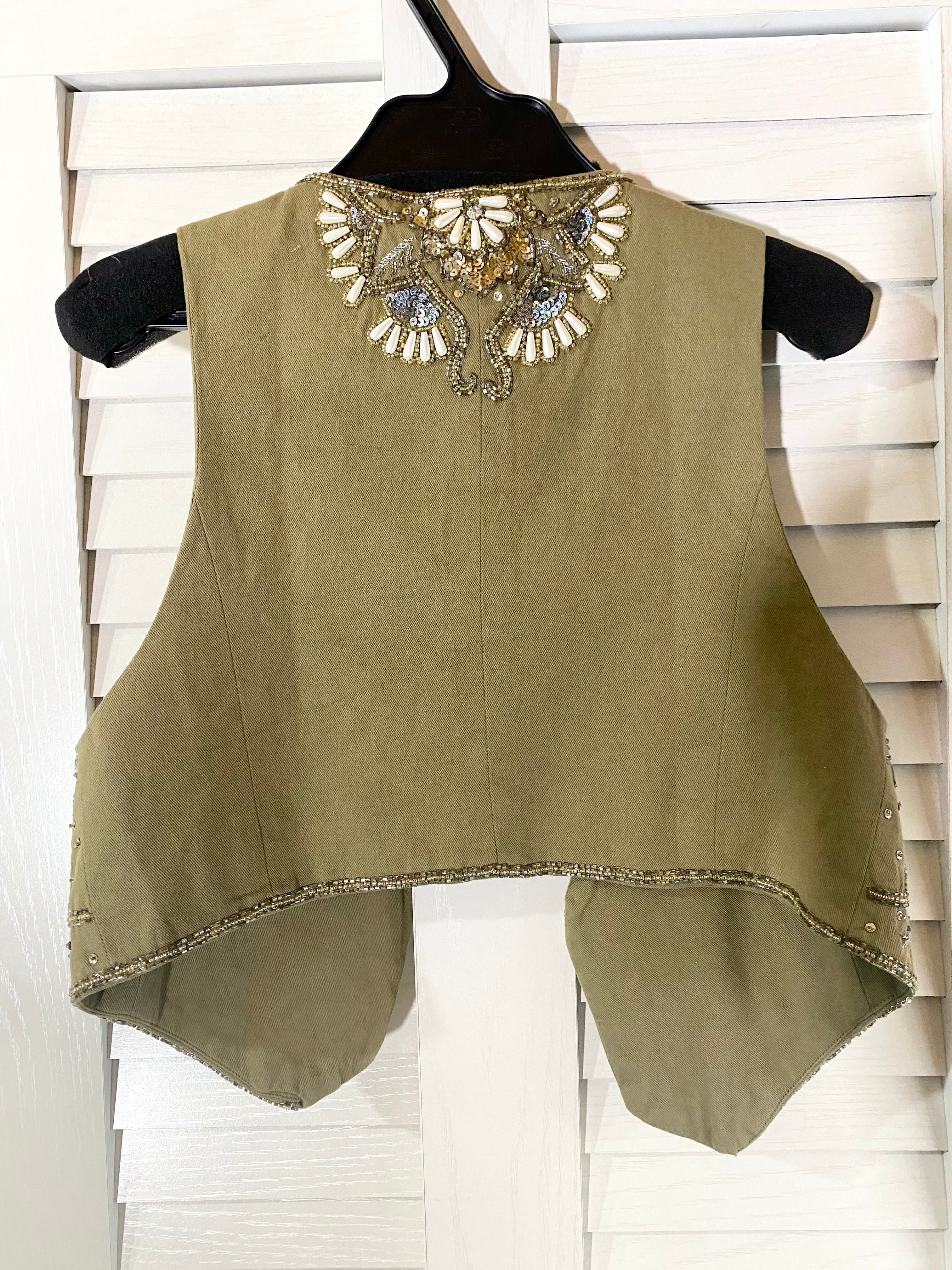 【チョッキ祭り】M.ビジュー刺繍コットンベスト カーキベージュ