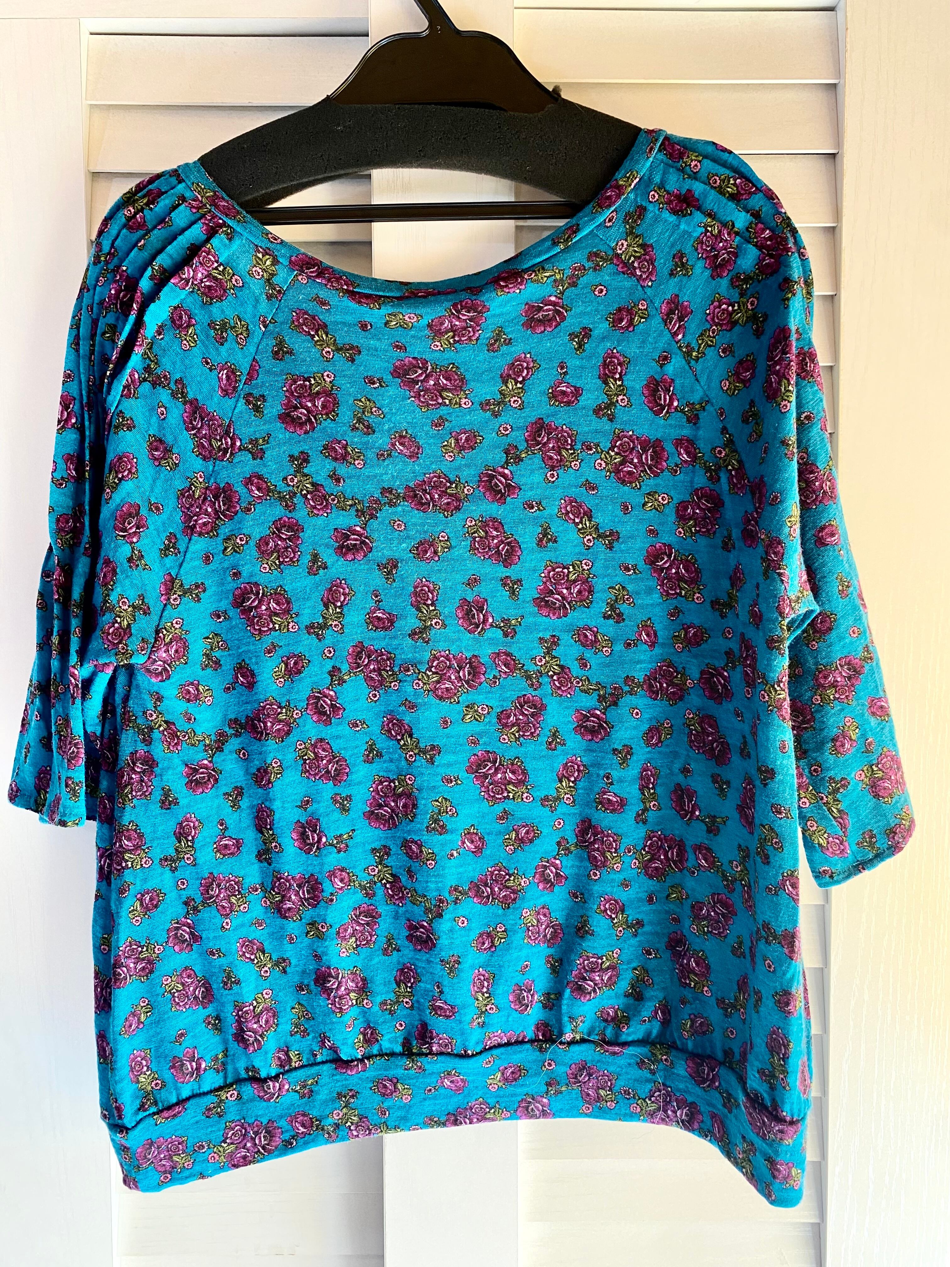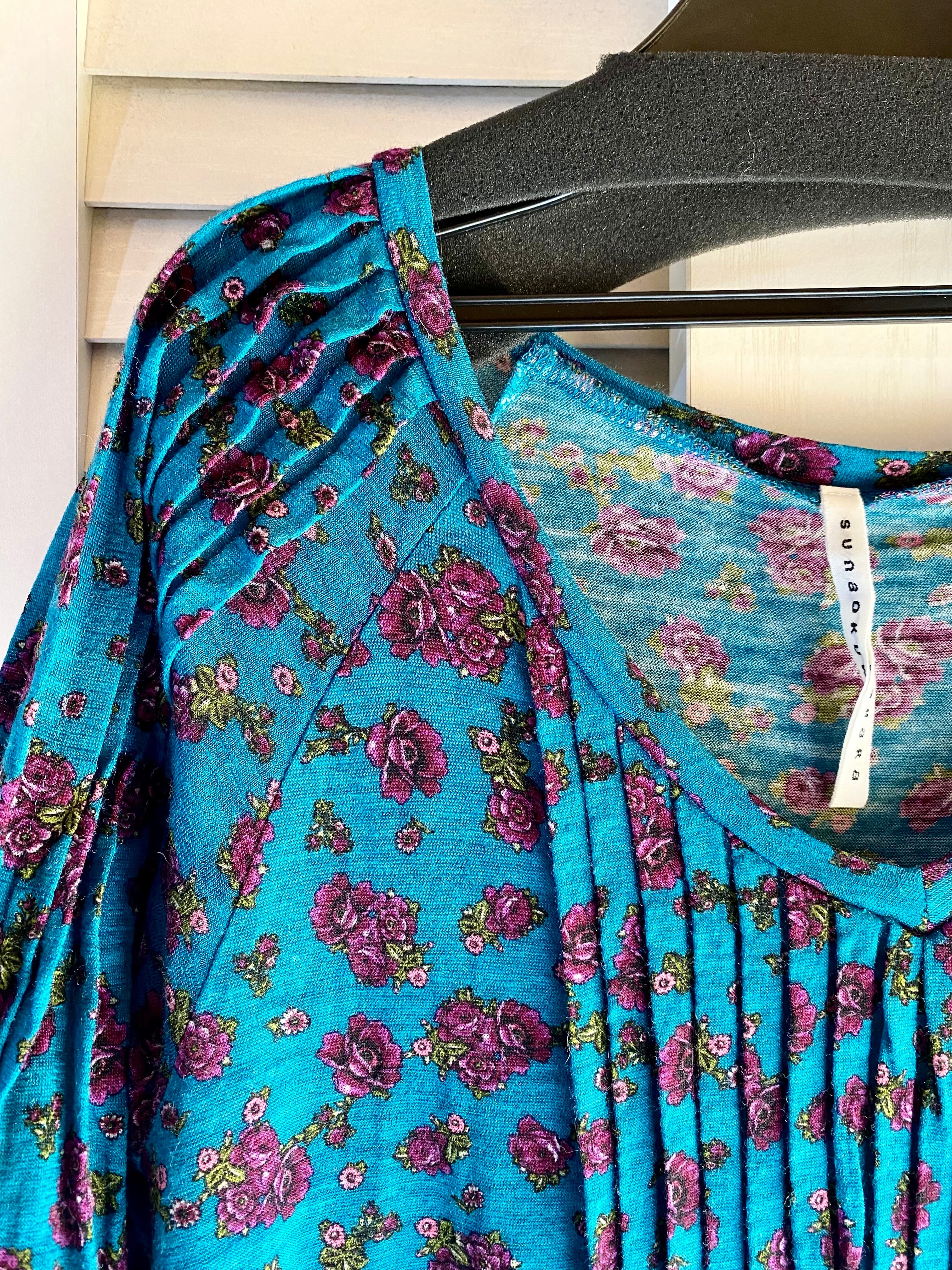 #92 SUNAOKUWAHARA フラワープリント&ピンタックデザイン 製品洗ウールカットソー ターコイズブルー