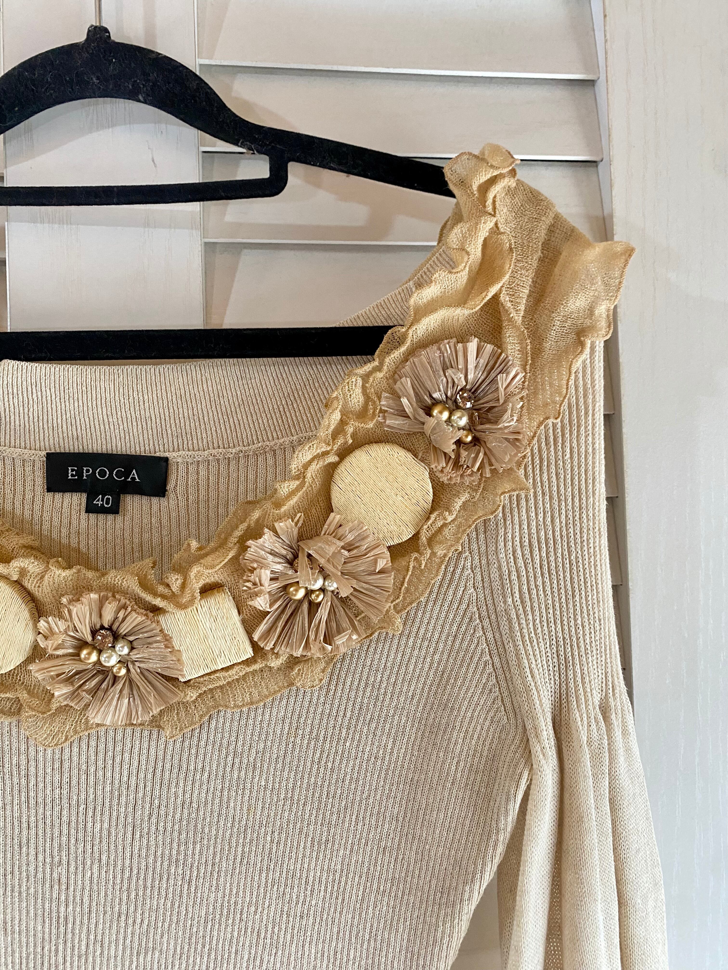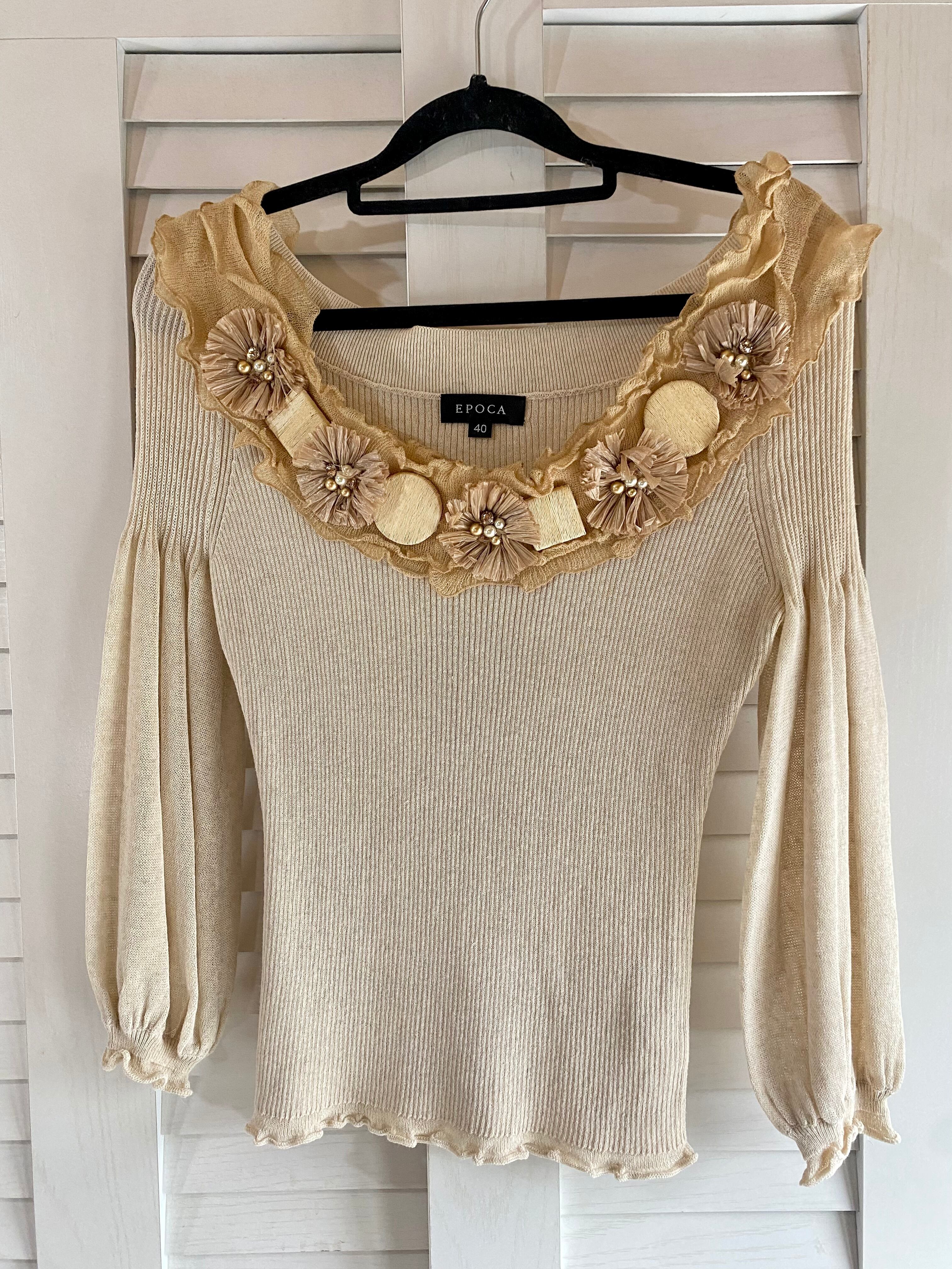 #100 EPOCA ウッド&ビジュー フラワーモチーフ バルーンスリーブリブニット ライトベージュ