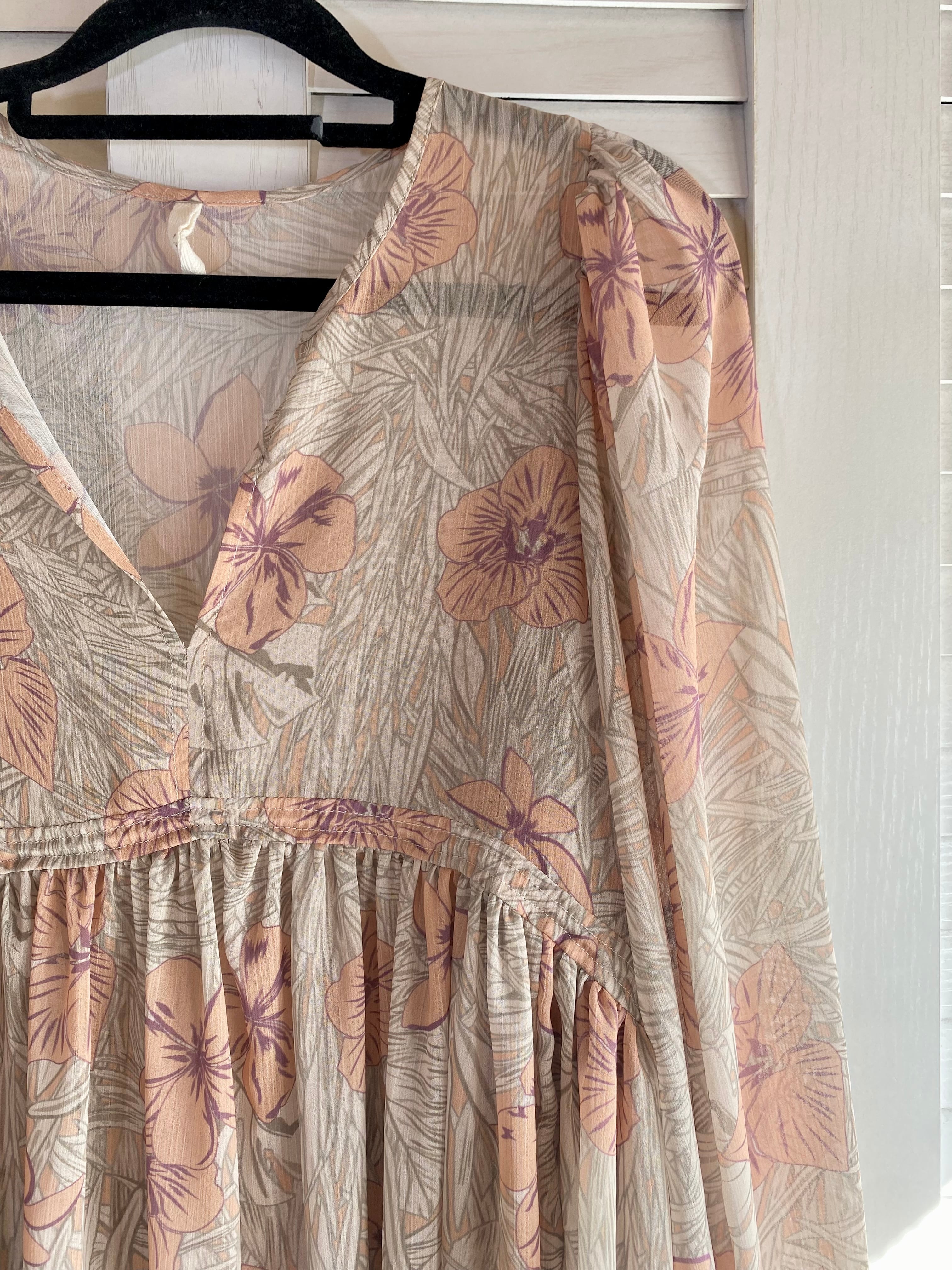 #101 Ungrid シアーフラワープリント タッセルドロストロ ボリュームスリーブ ショート丈ブラウス ピンクベージュ
