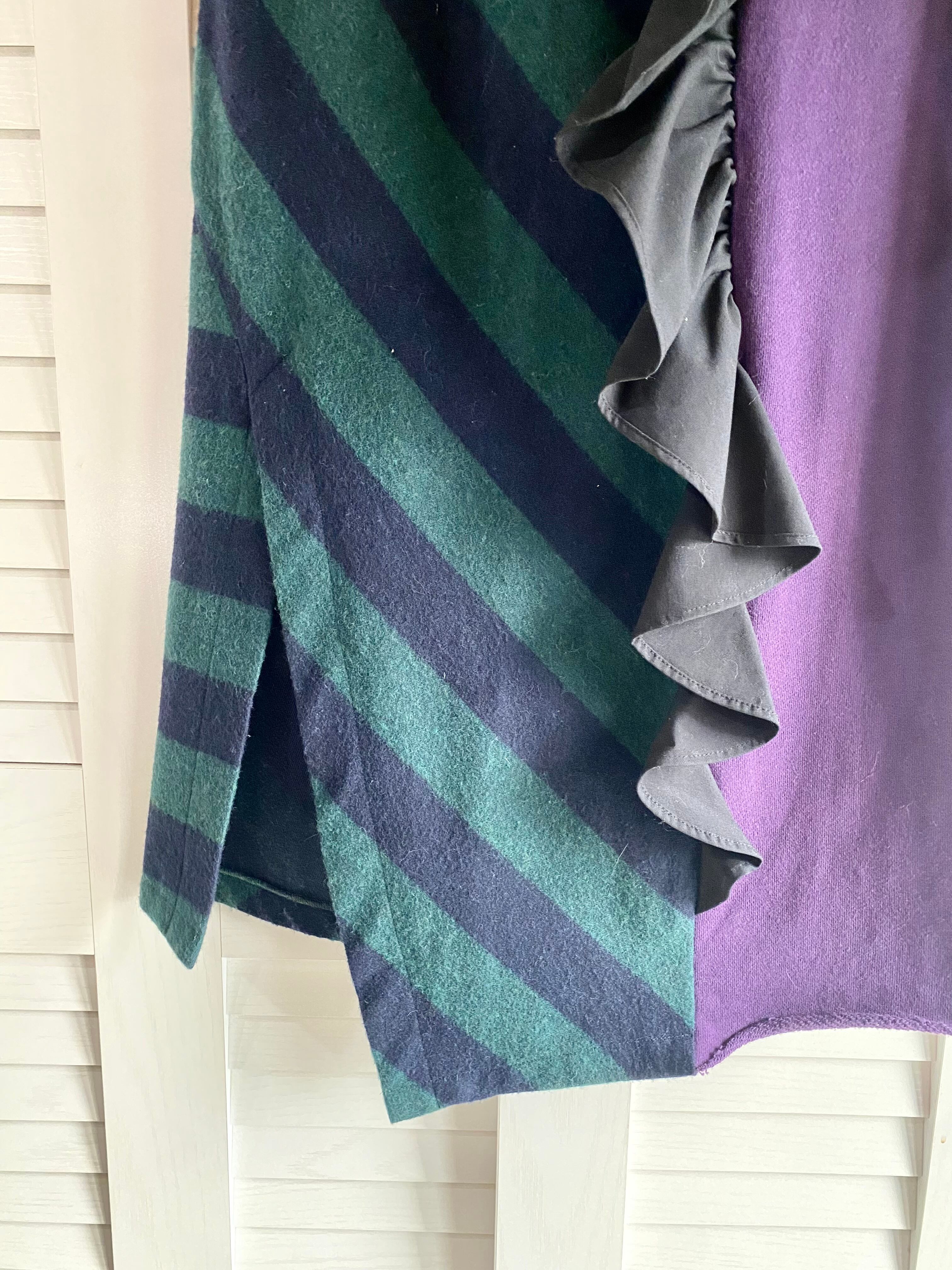 #102 AVIE スウェット&バイヤスストライプウール フリルモチーフスカート パープル×グリーン×ネイビー