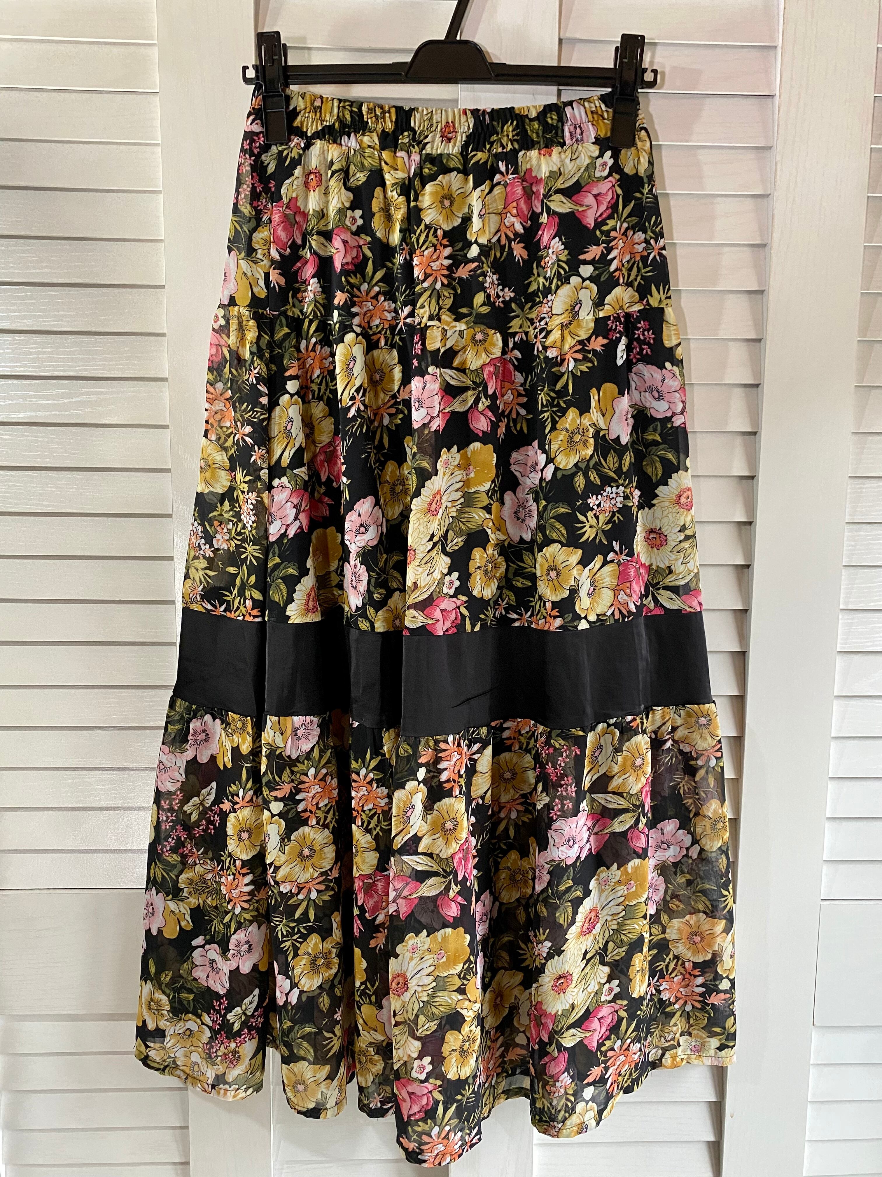 #106 clear BIGフラワープリント 切替ラインシフォンジョーゼットボリュームスカート ブラック