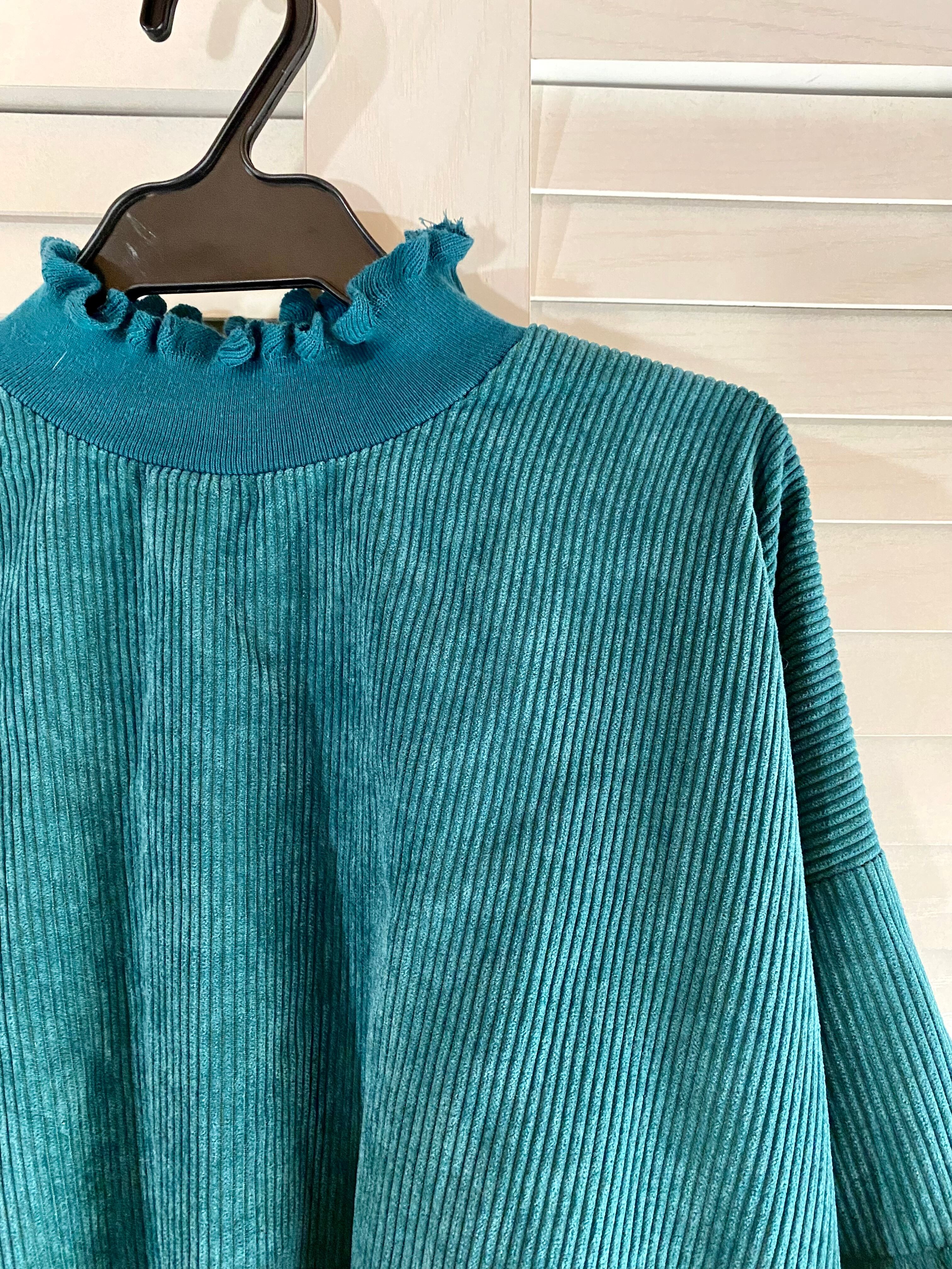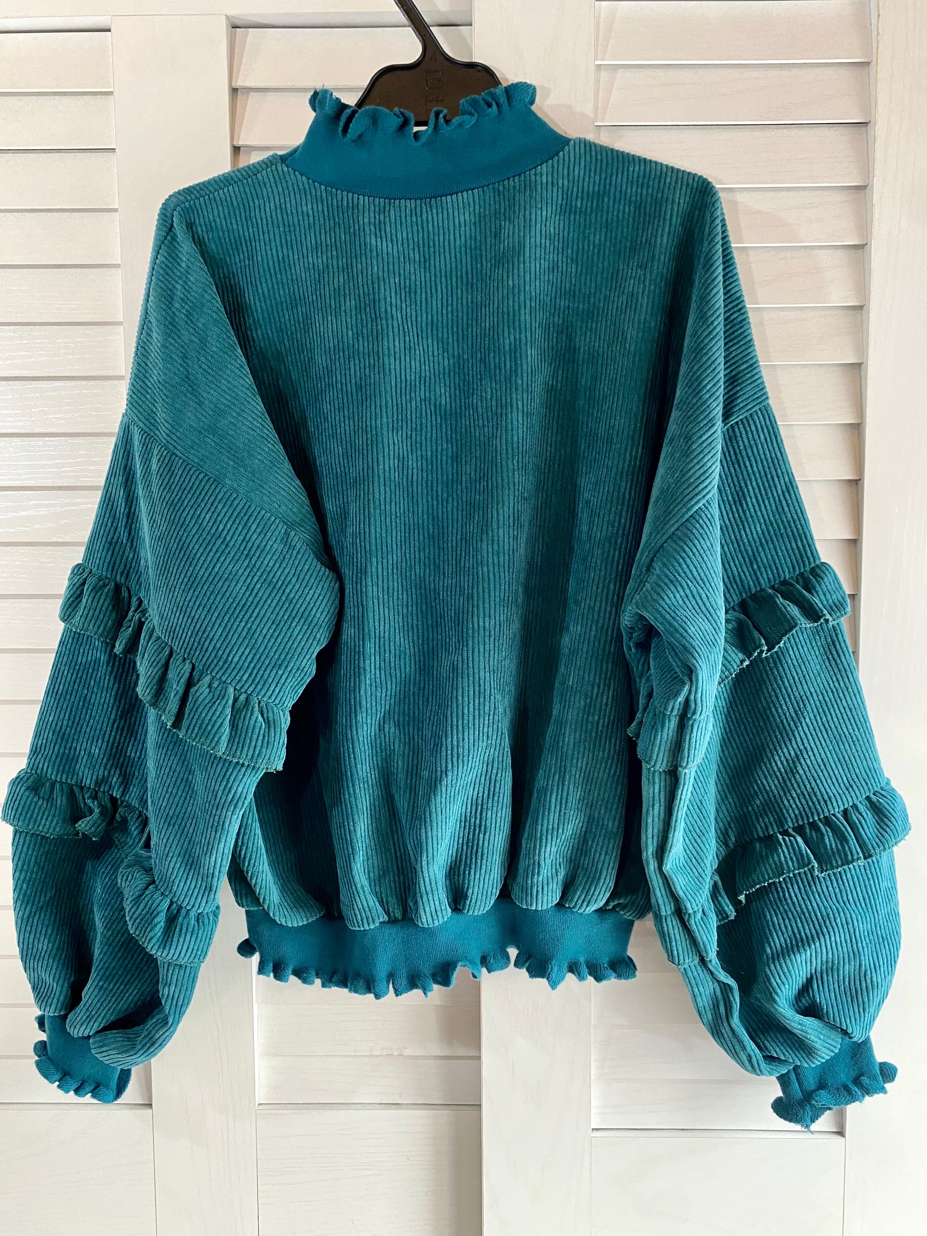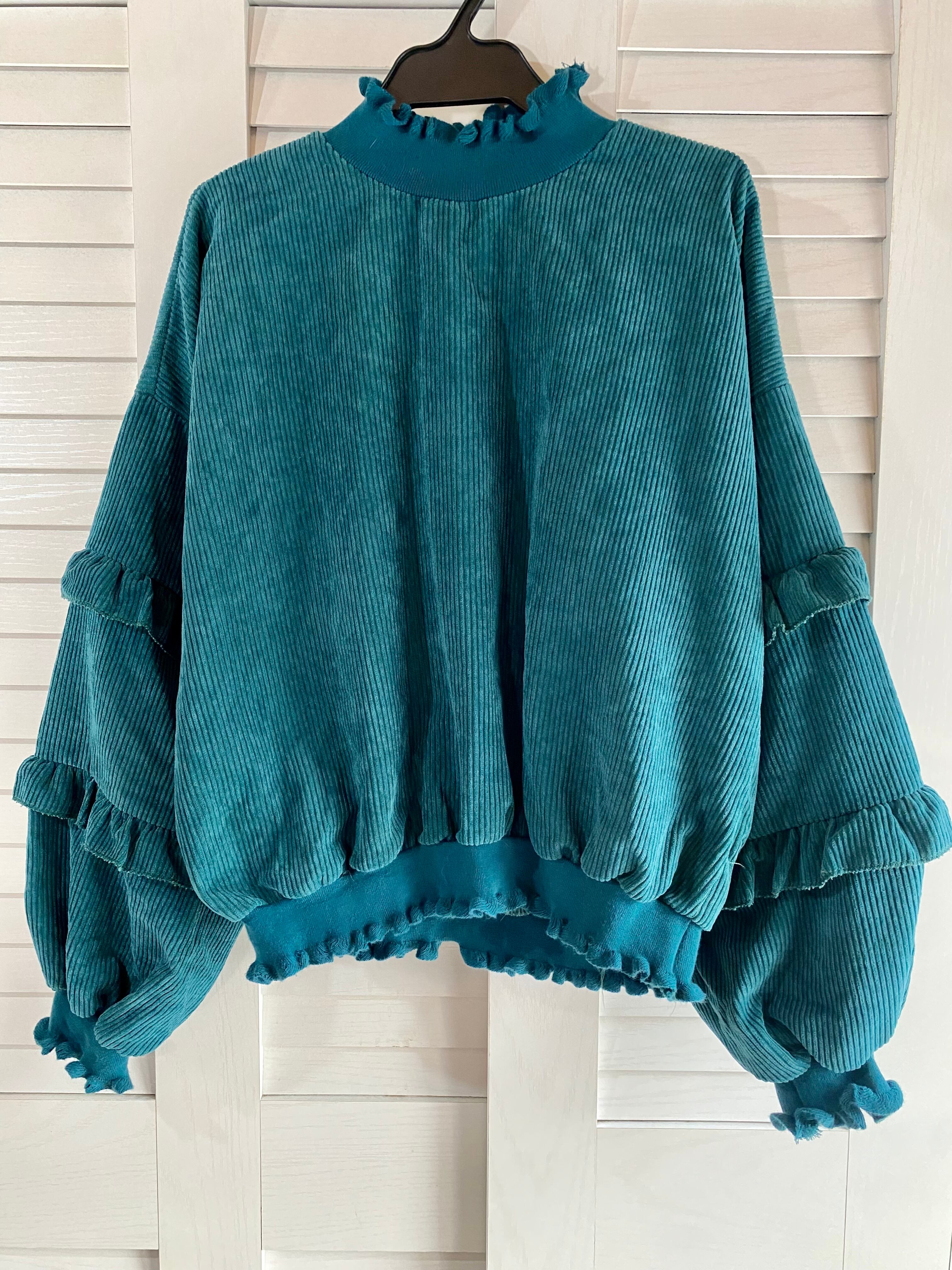 #107 XOXO コーデュロイ ティアードフリルスリーブ プルオーバーブラウス ターコイズブルー