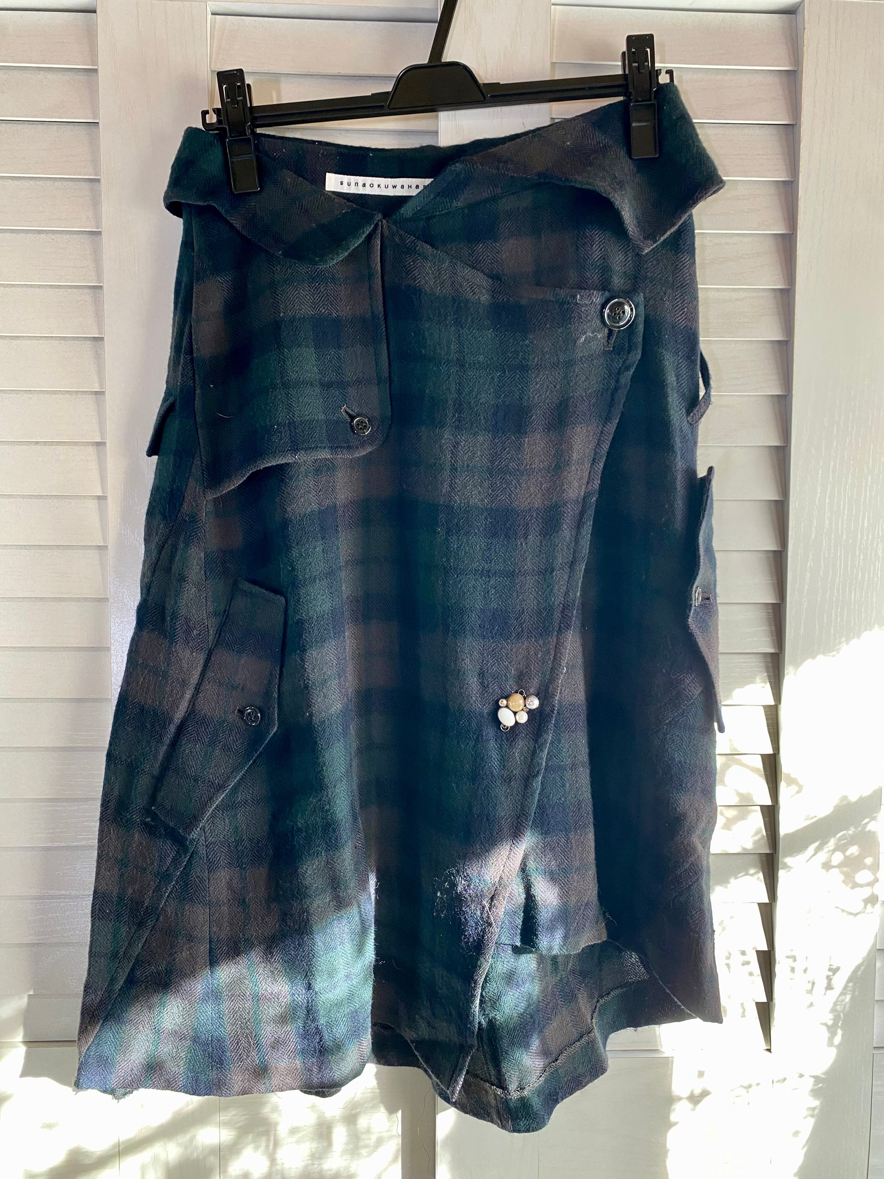 #110 SUNAOKUWAHARA 変形トレンチ タータンチェックラップスカート グリーン×ブラウン