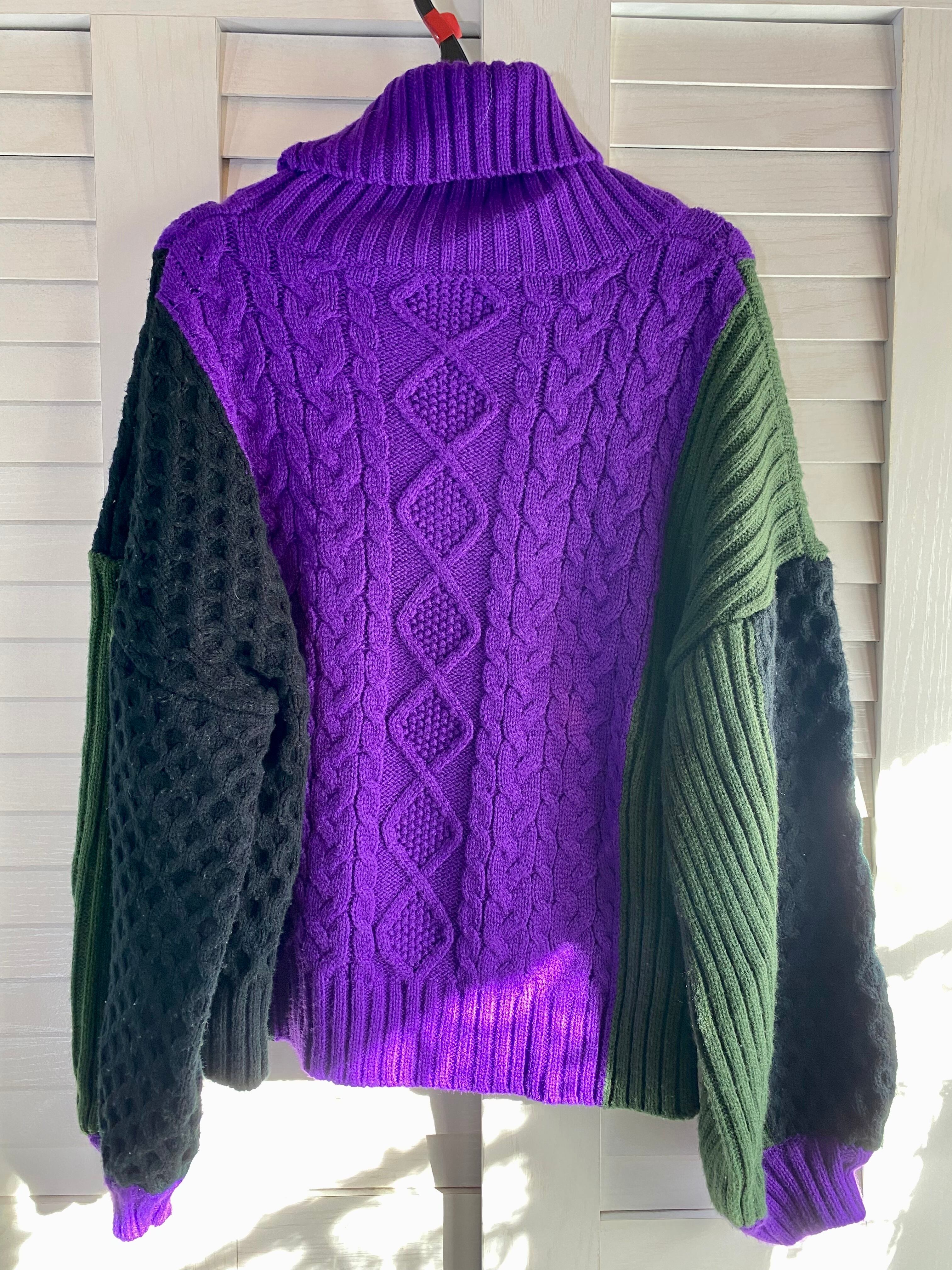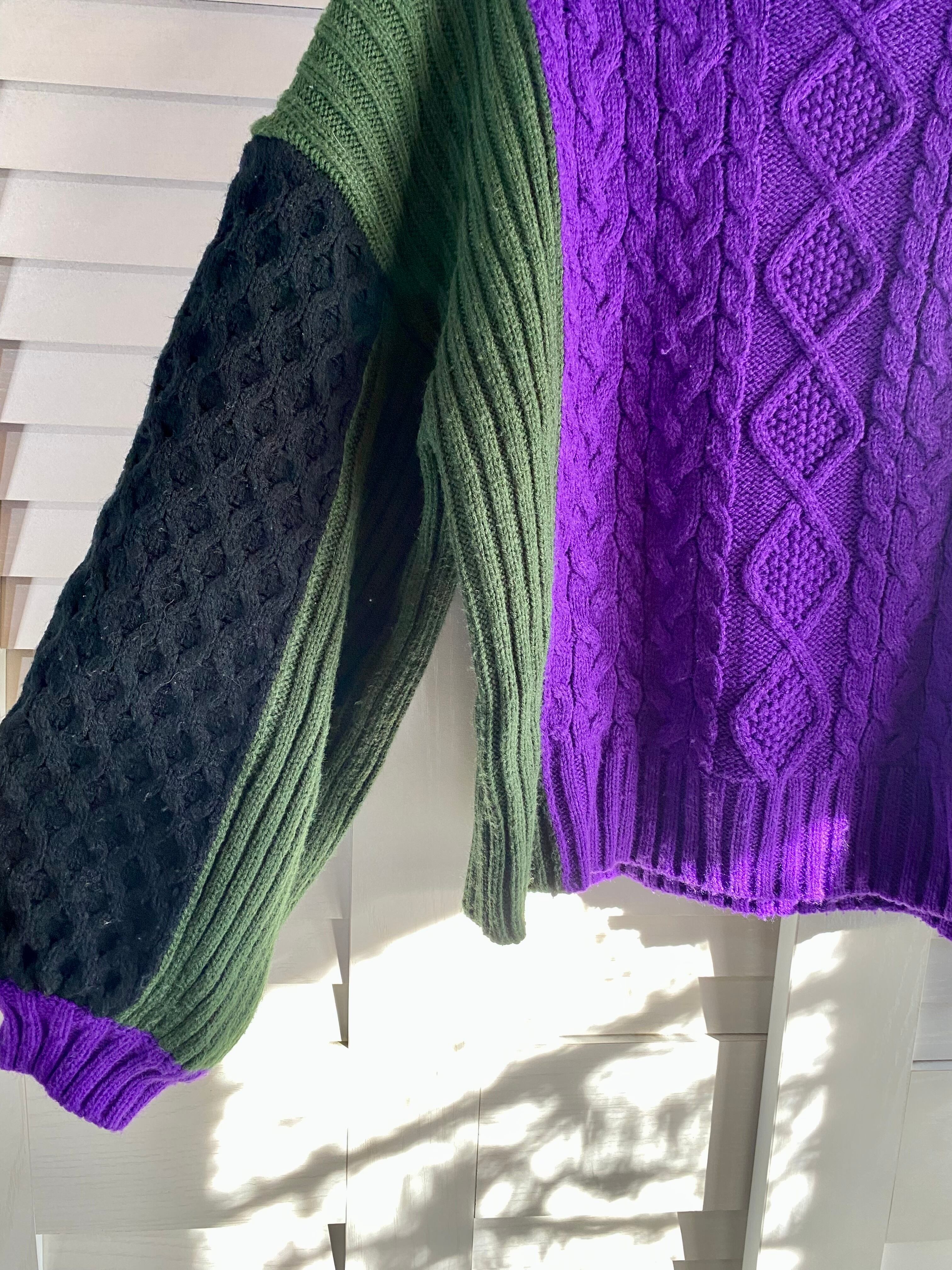 #110 jouetie クレイジーパターン ショート丈アランニットセーター パープル×グリーン×ブラック