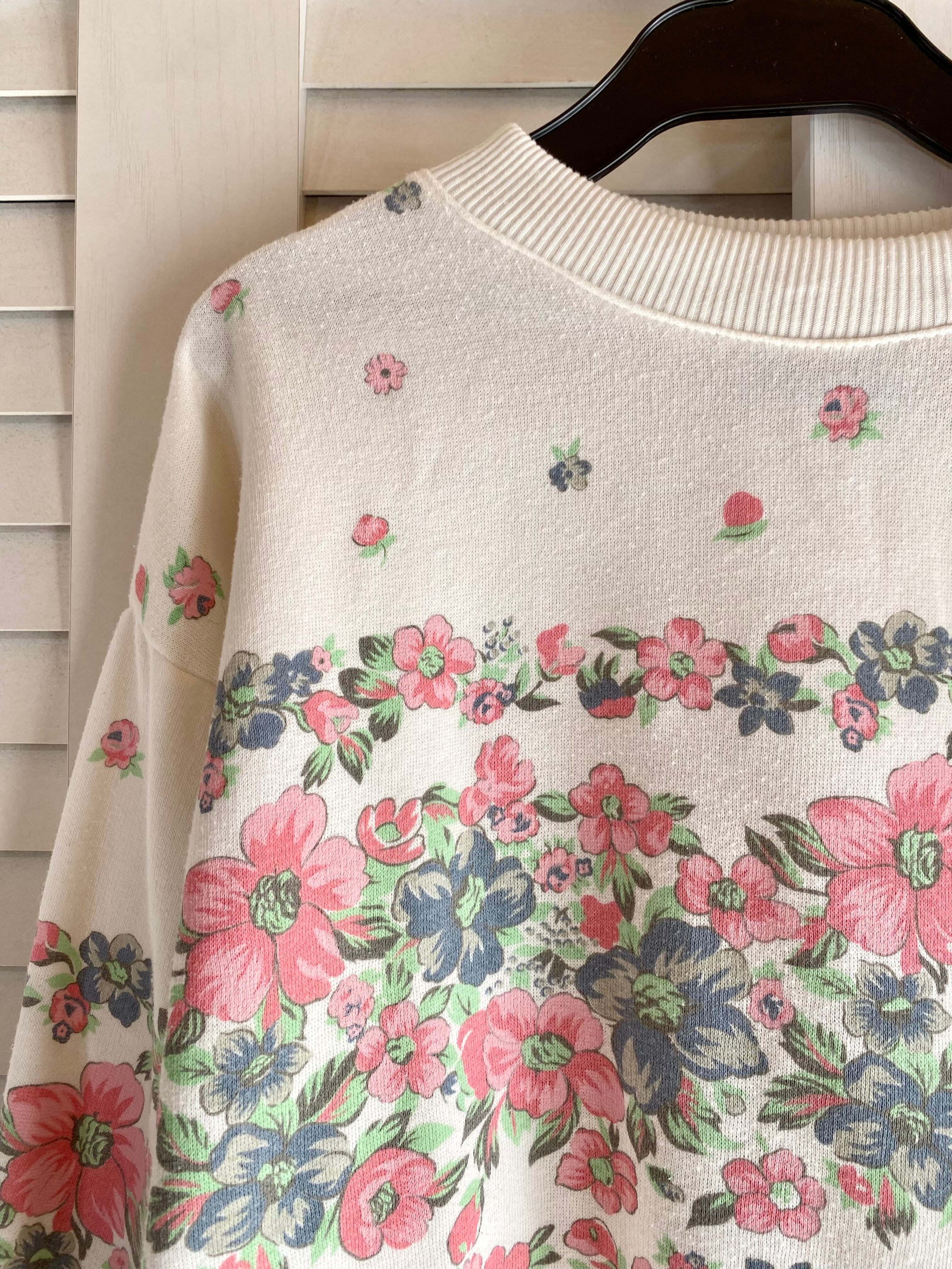 #114【古着屋購入】80Sヴィンテージ BAY WATERS 染み込みフラワープリント スウェットプルオーバー オフホワイト