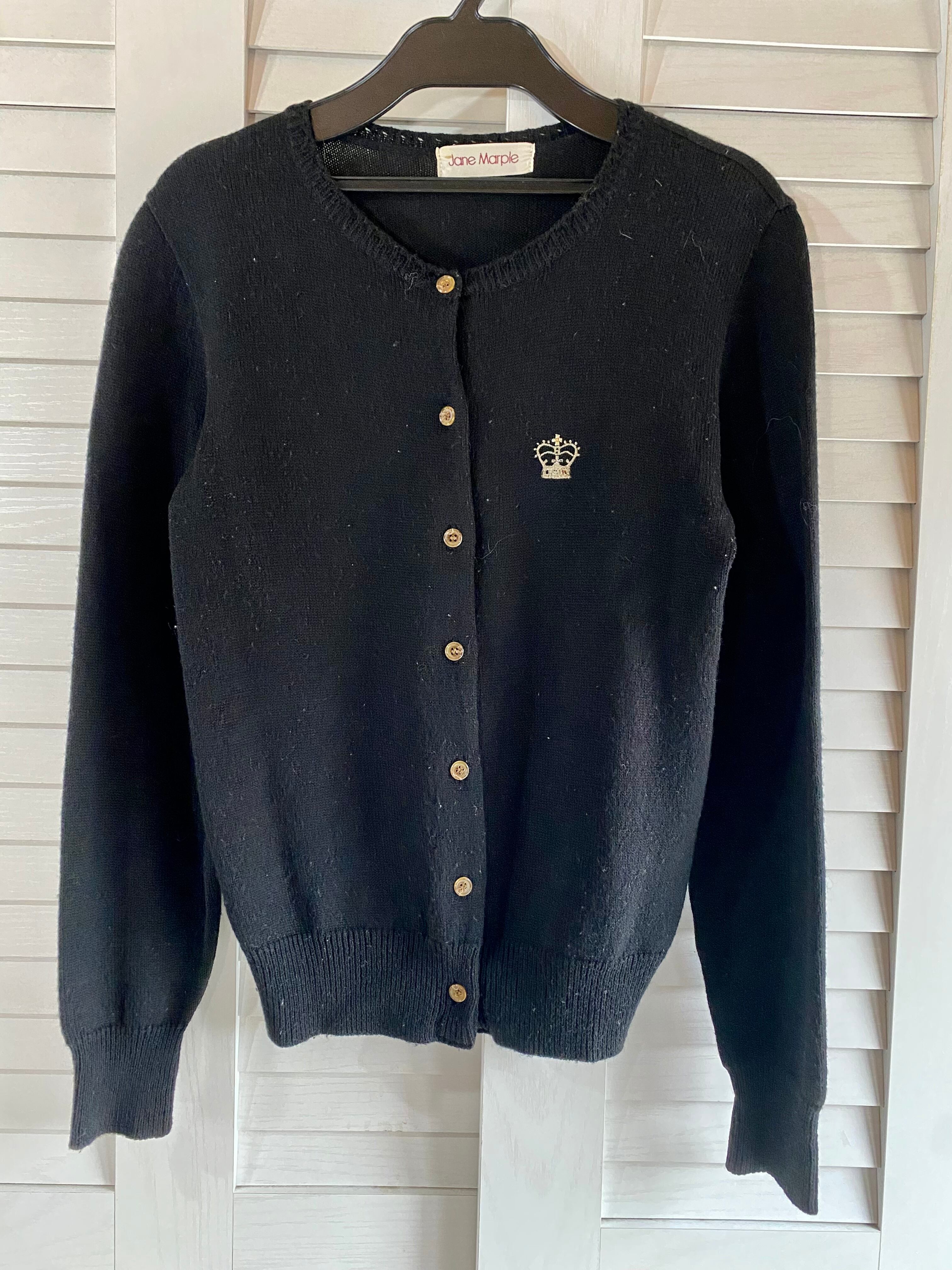 #117 Jane Marple ゴールド王冠刺繍&べっ甲ボタン スタンダード アクリルウールニットカーデ ブラック