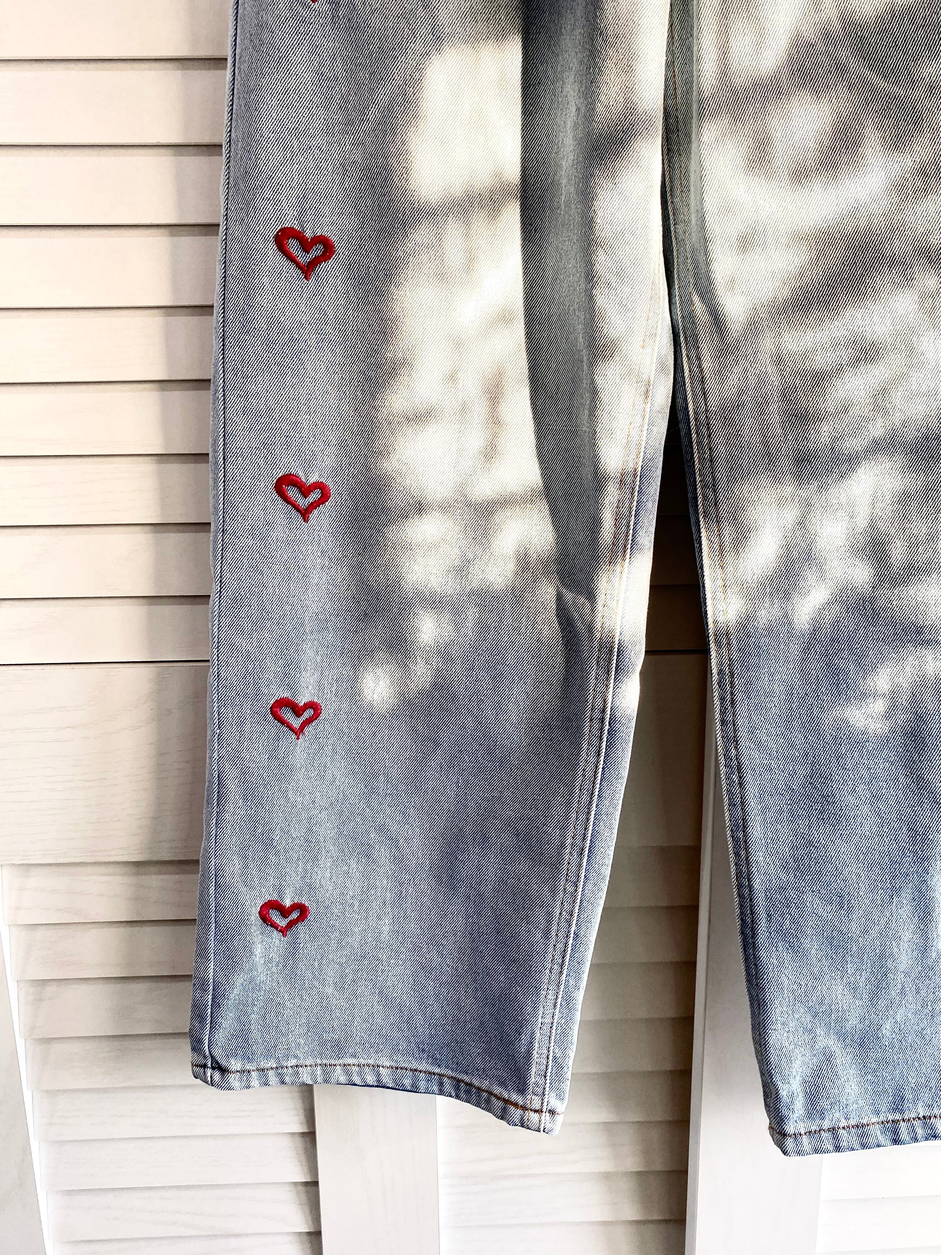 #121 Tip Top ハイウエスト ブリーチデニム ハート刺繍ワイドパンツ ライトブルー