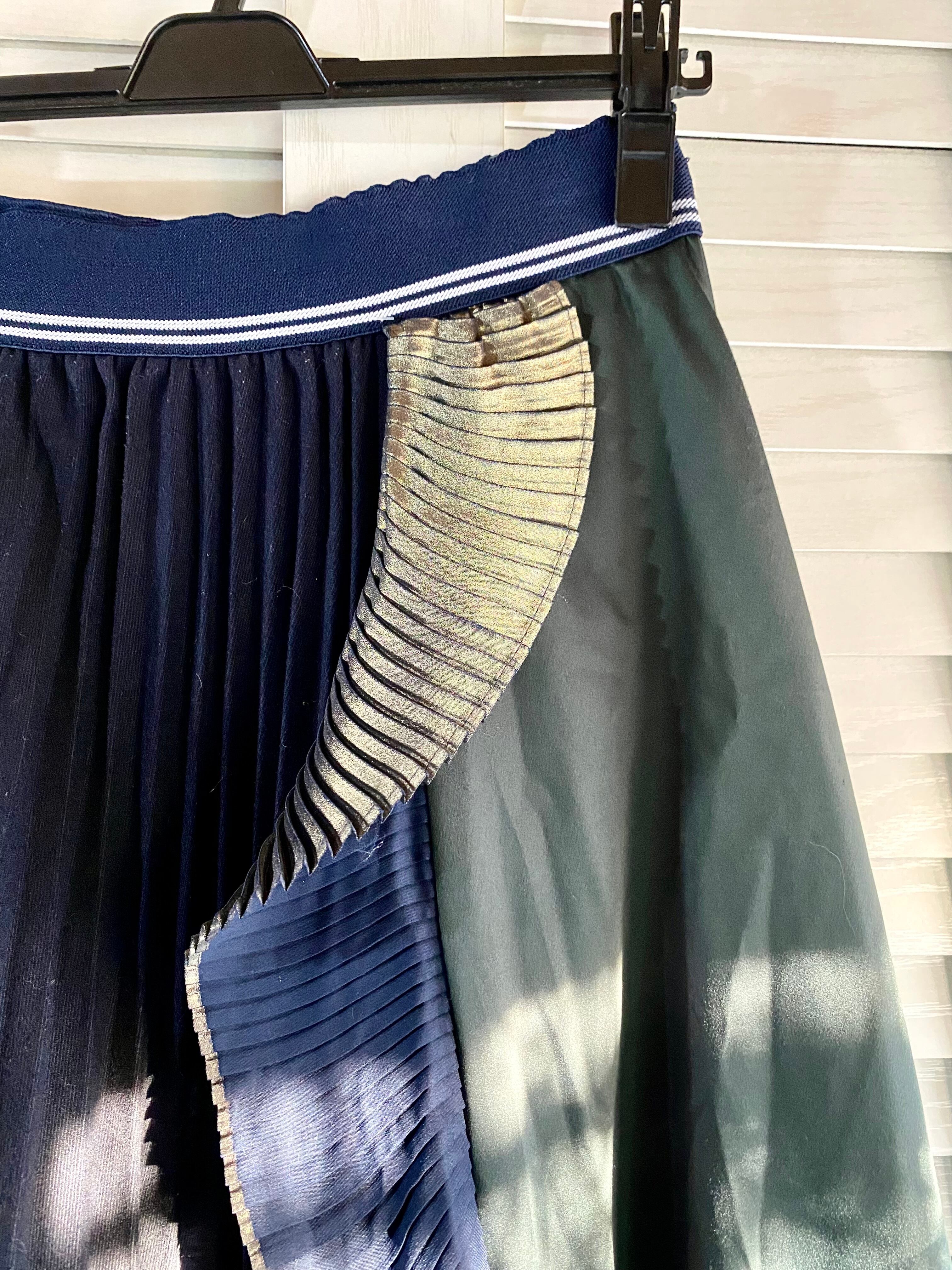 #121 OUTRO SOL クレイジーパターン フリル&プリーツ スポーツライン ウエストベルト スカート ネイビー×グリーン