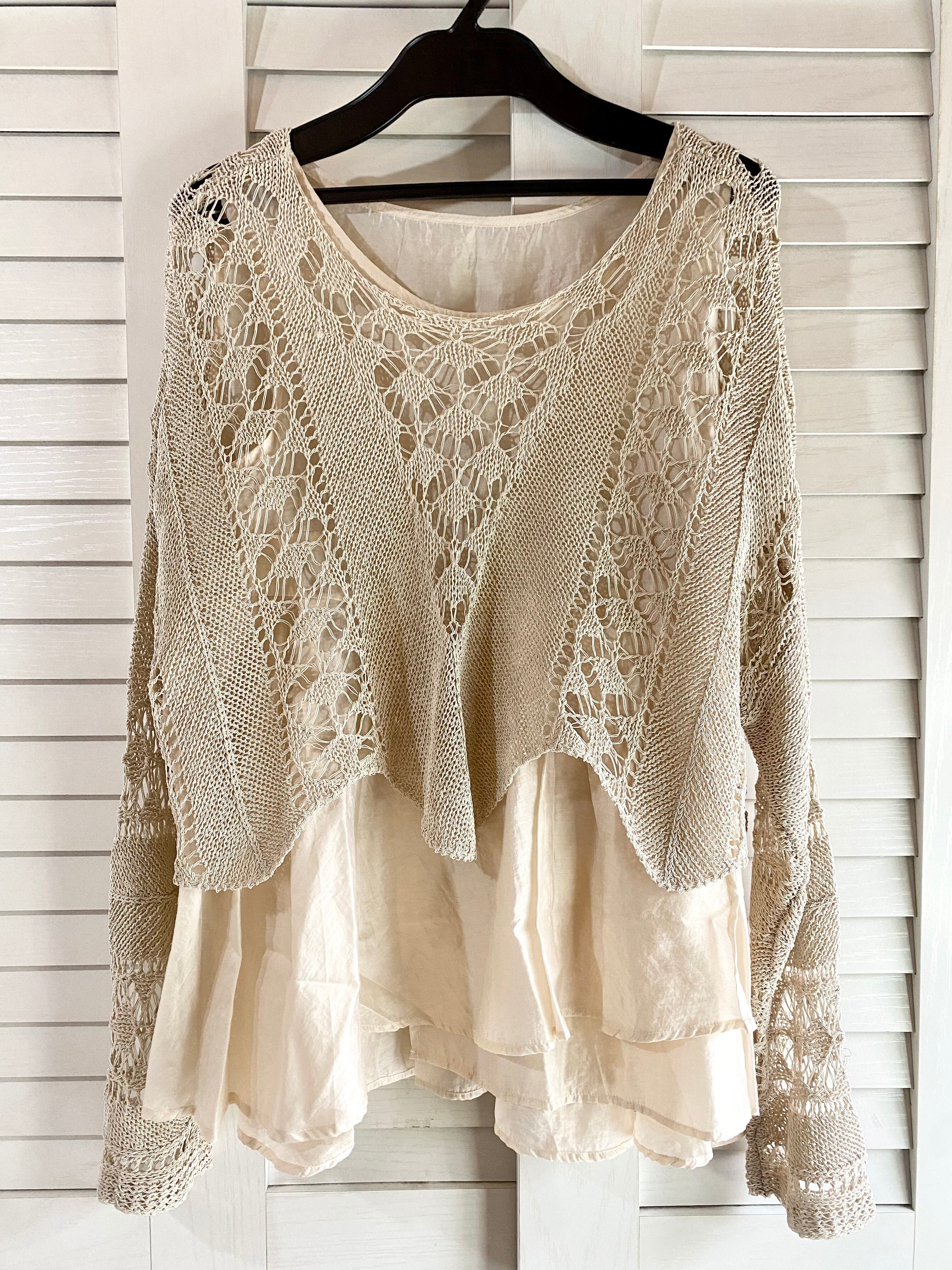 #123 Eimee Law レイヤードナイロンシャー 透かし編みアクリルナイロンニットセーターブラウス ライトベージュ