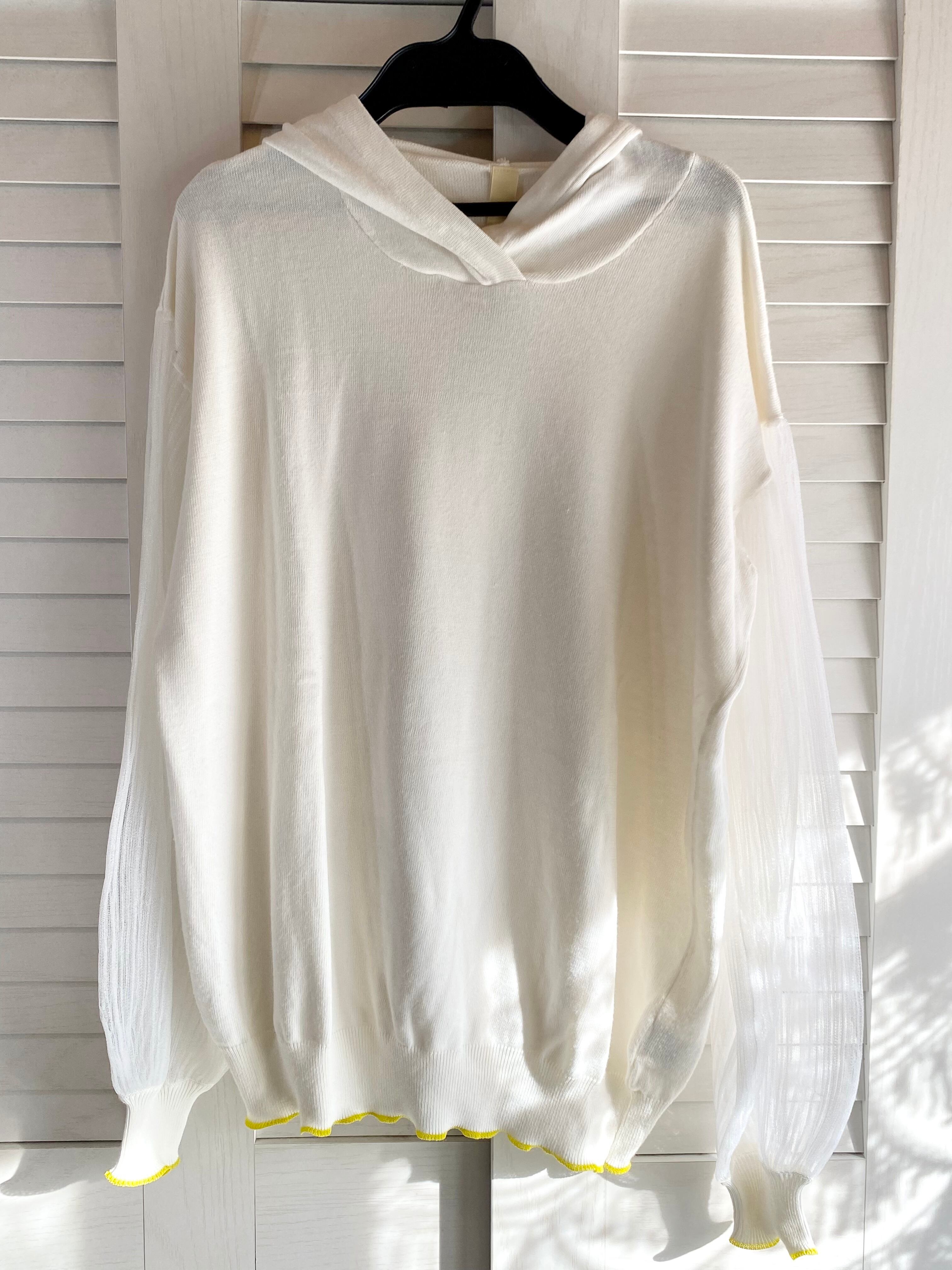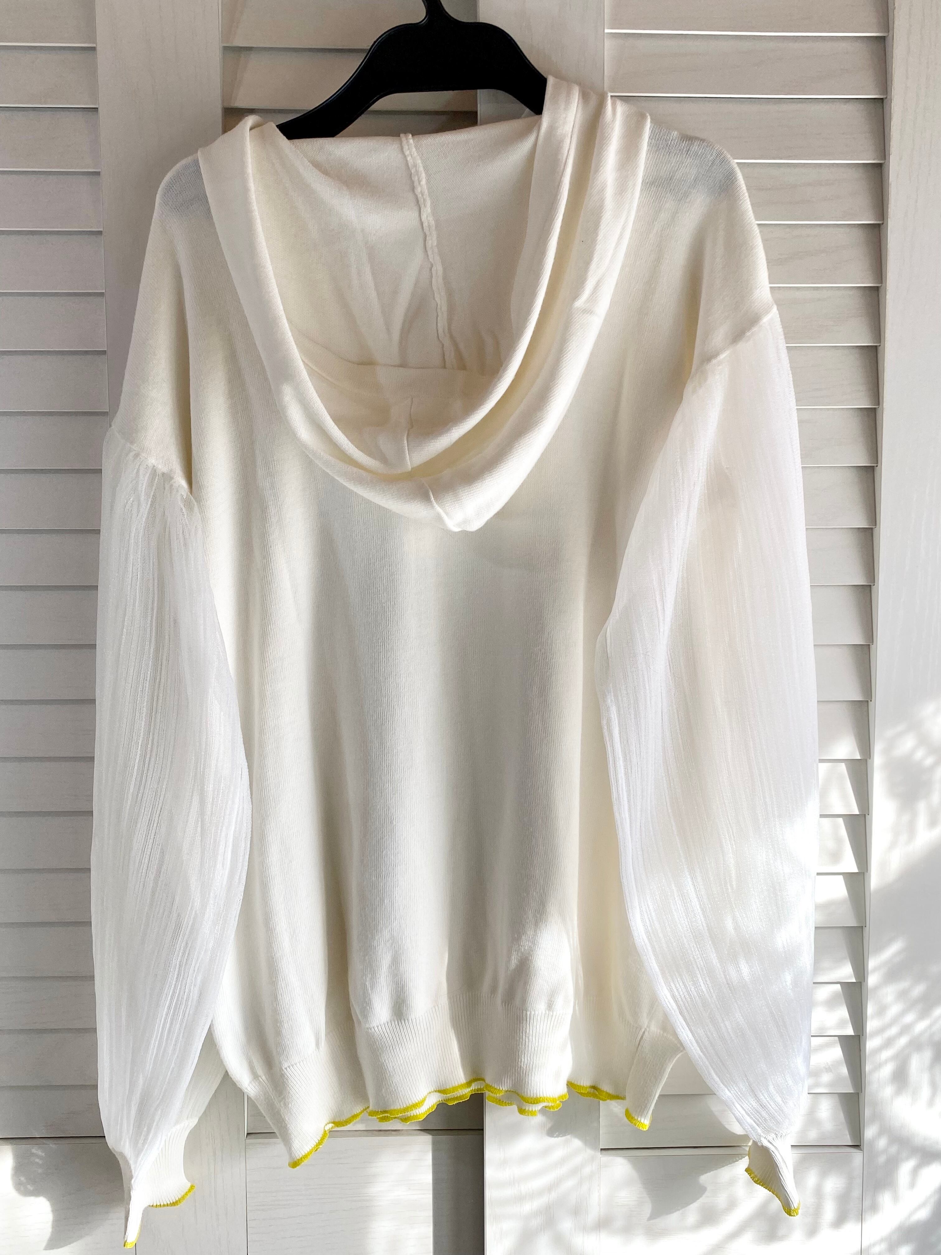 #137 Q❤︎ プリーツチュールスリーブ レーヨンニットフーディープルオーバーブラウス オフホワイト