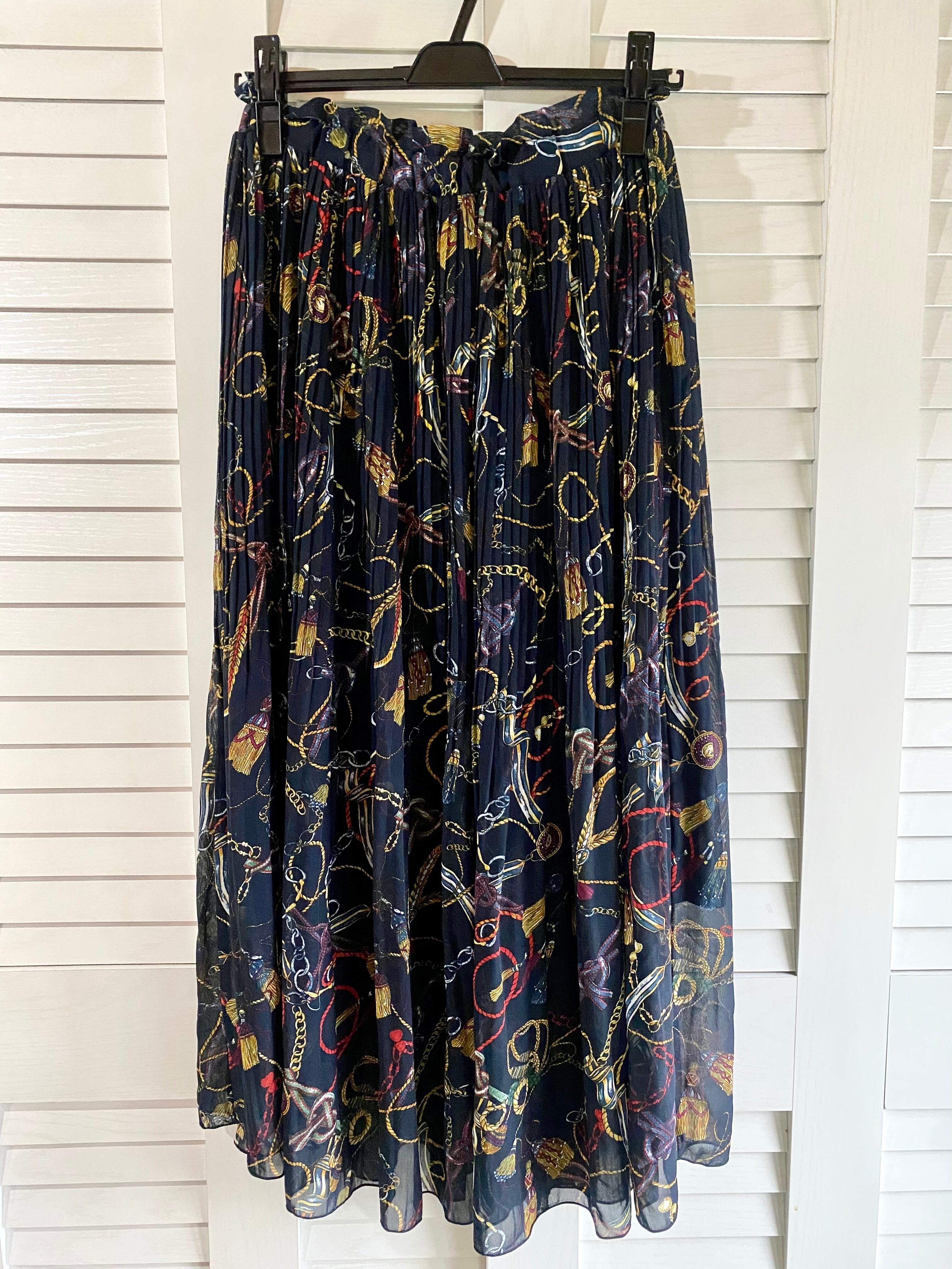#143【デザインサンプル】タッセルチェーン柄 シフォンプリーツスカート ネイビー
