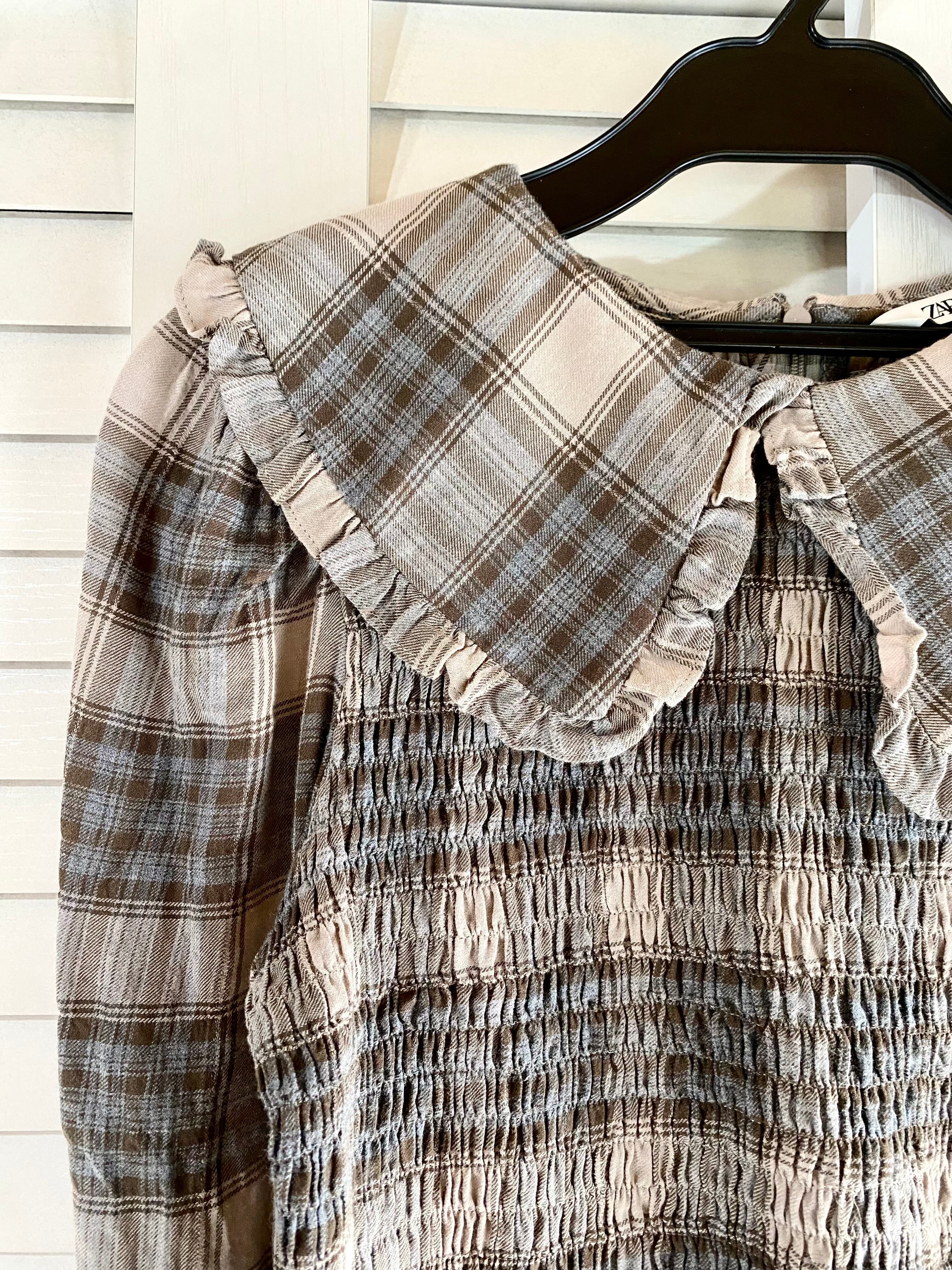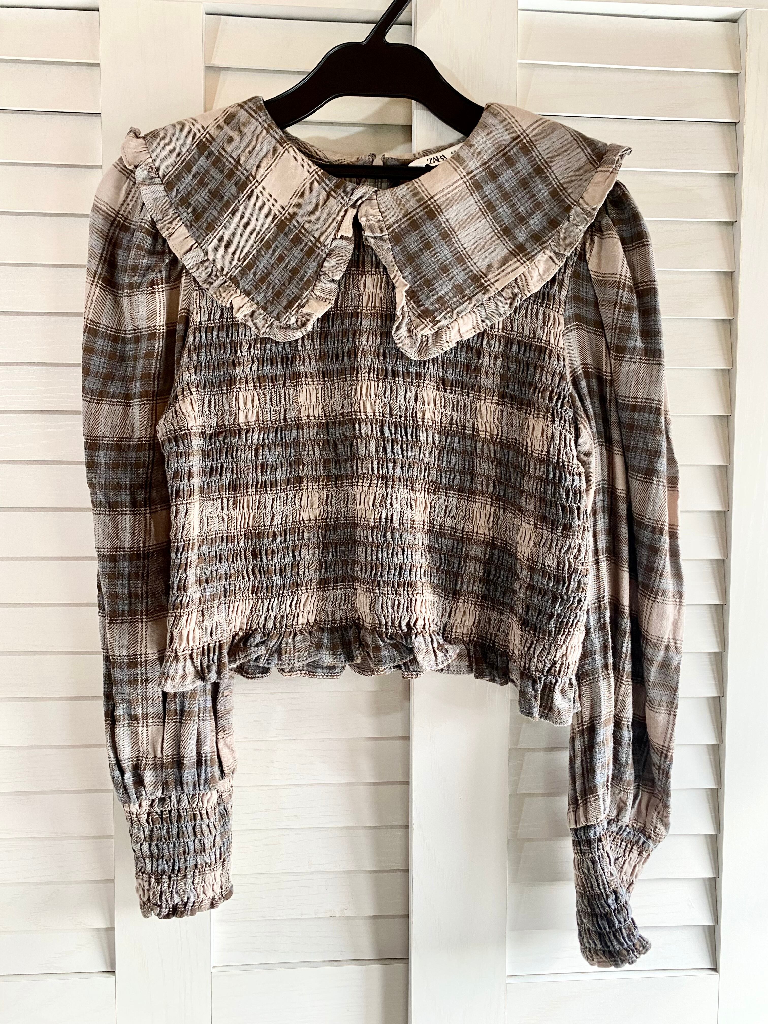 #144 ZARA アンティークチェック シャーリングボディーBIGカラー ショート丈ブラウス アンティークベージュ