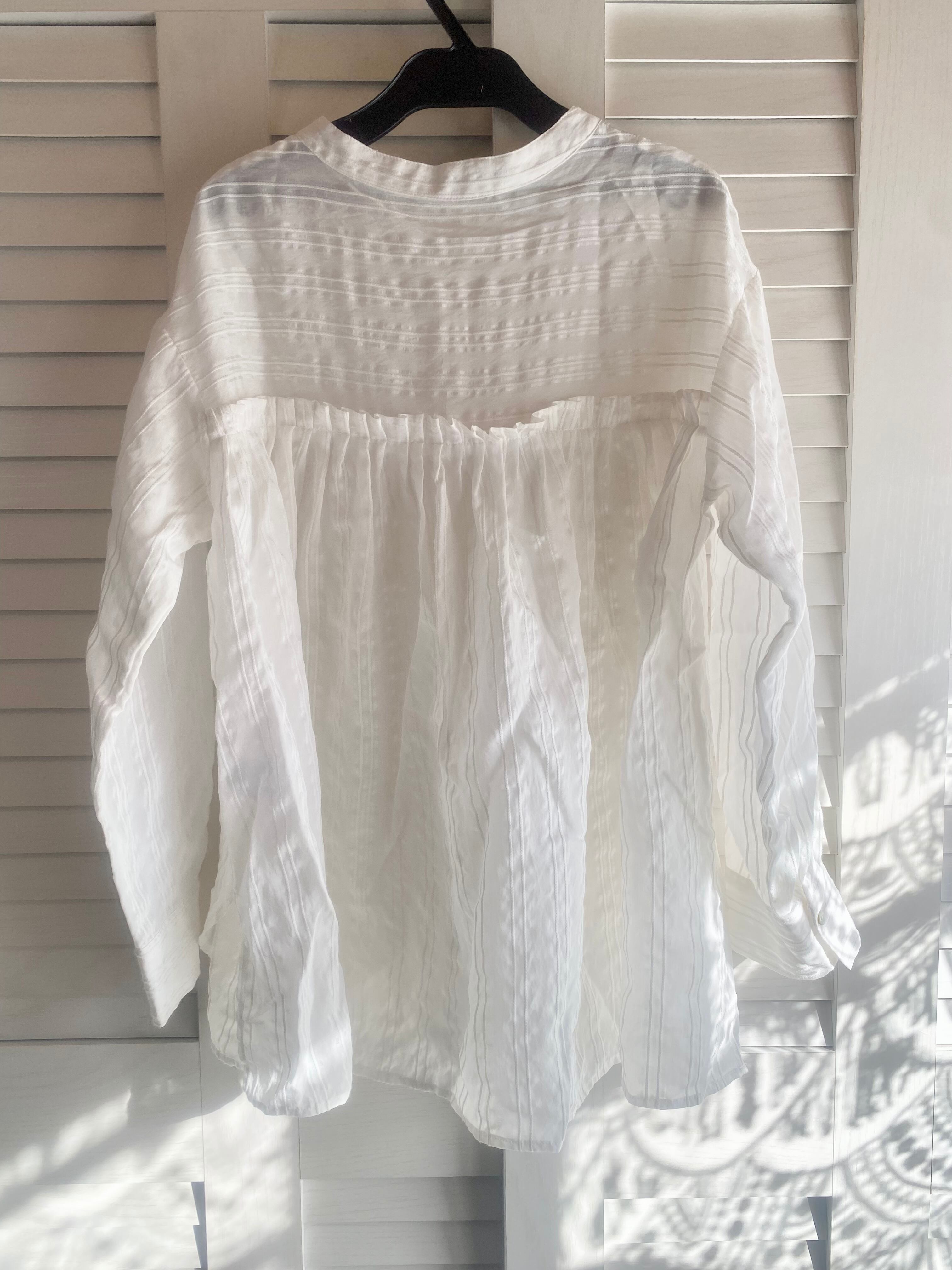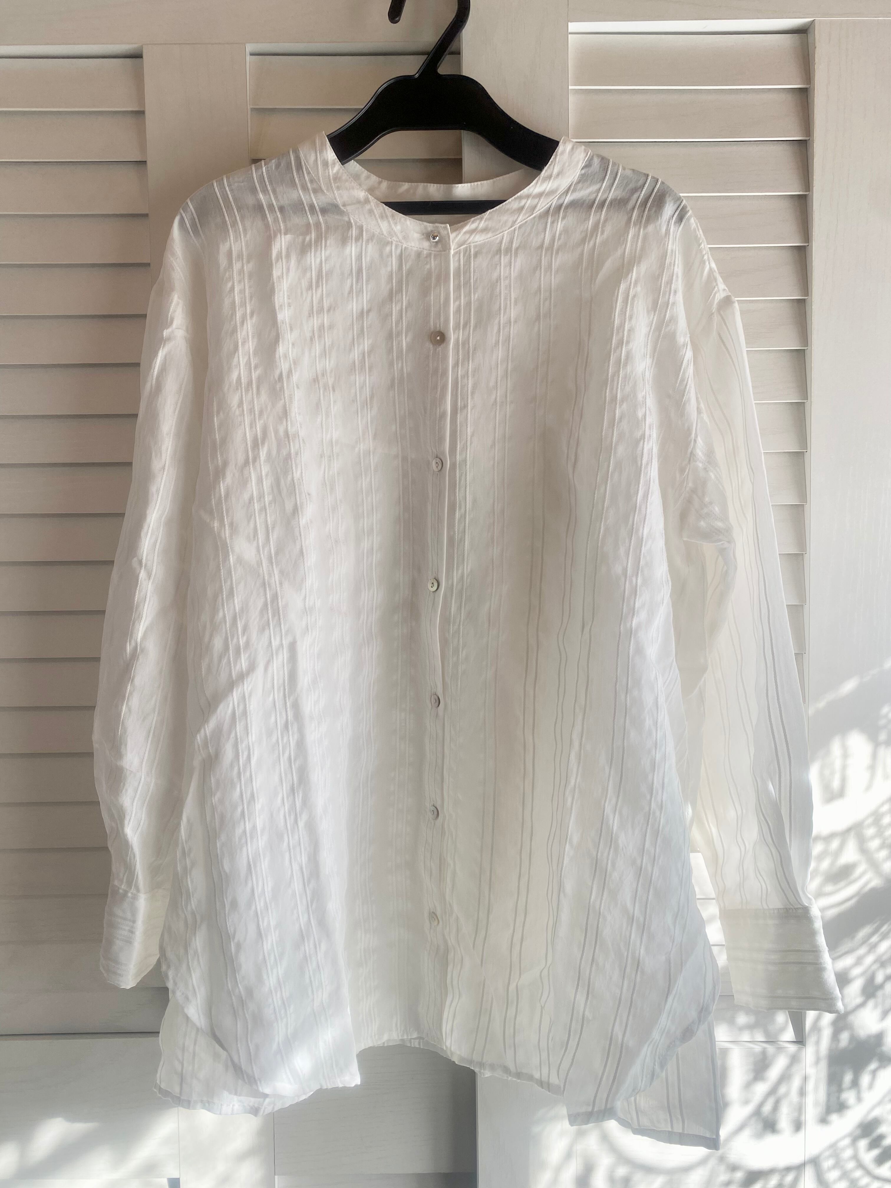 #147 Eimee Law ナイロンレーヨン シアーストライプローン バックボリュームシャツブラウス オフホワイト