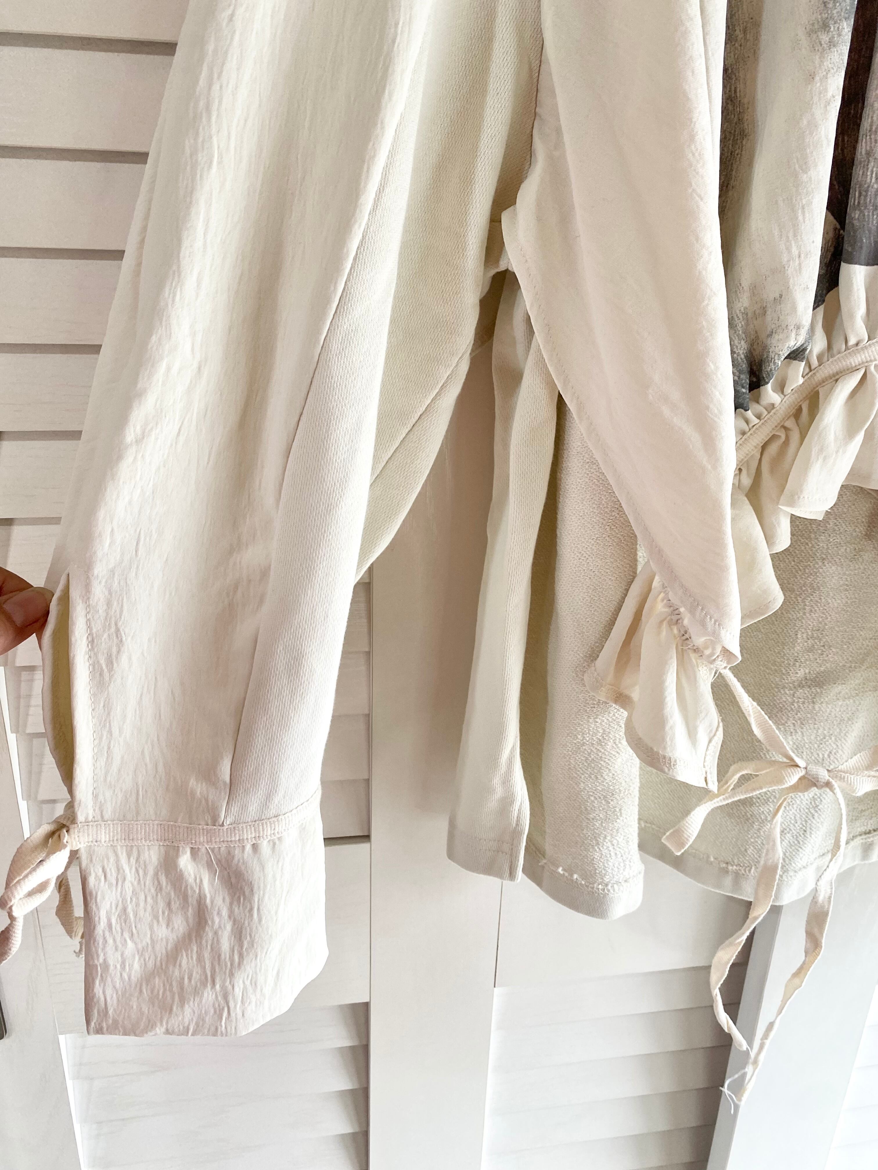 #166 ZARA アートコラボ デザインスウェット&ストレッチジョーゼット切替プルオーバーブラウス グレイッシュベージュ