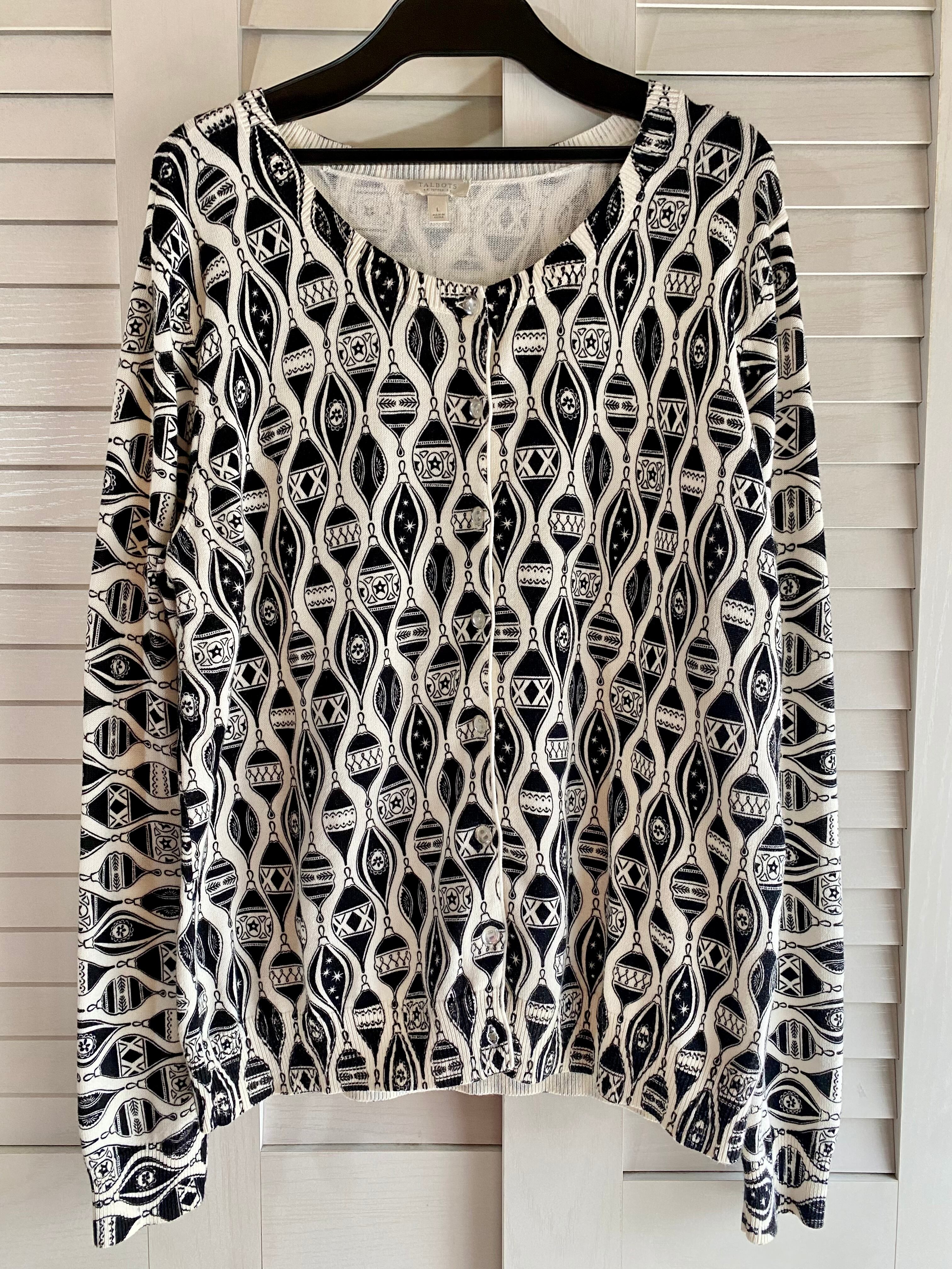 #166 TALBOTS モノトーンオーナメントプリント コットンニットカーデ オフホワイト