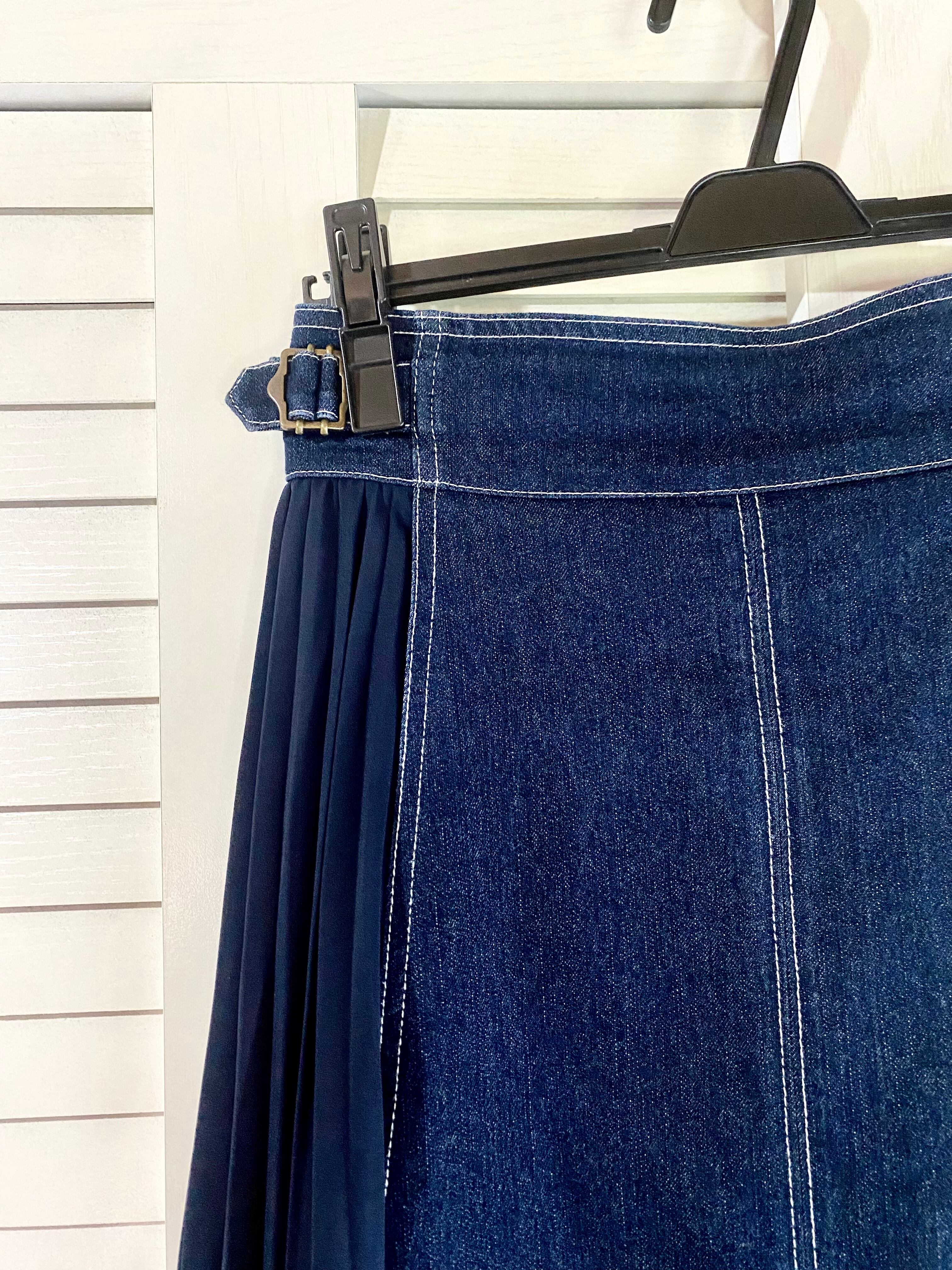 #168 grove サイドジョーゼットプリーツ切替 デザインデニムスカート インディゴ
